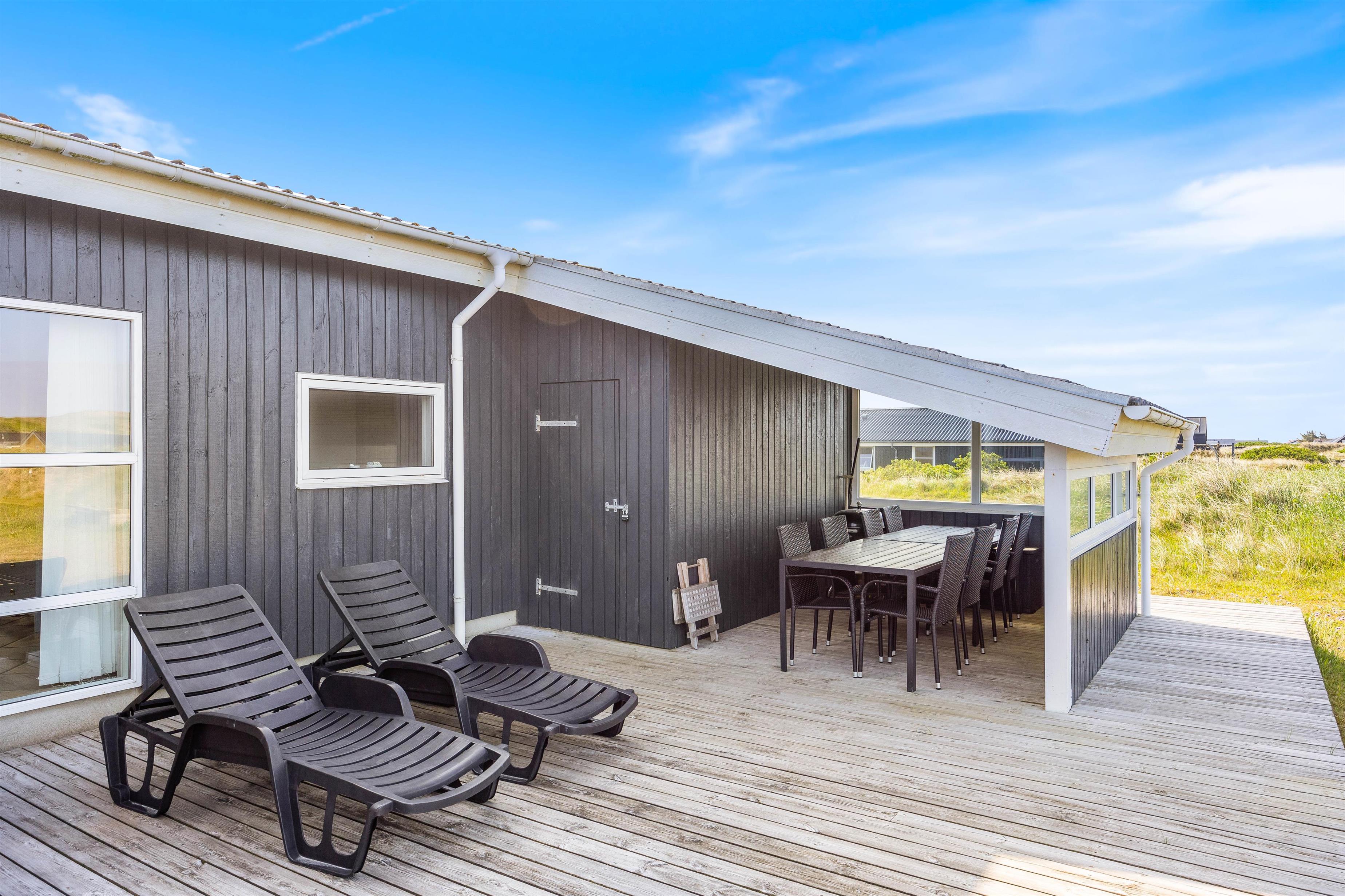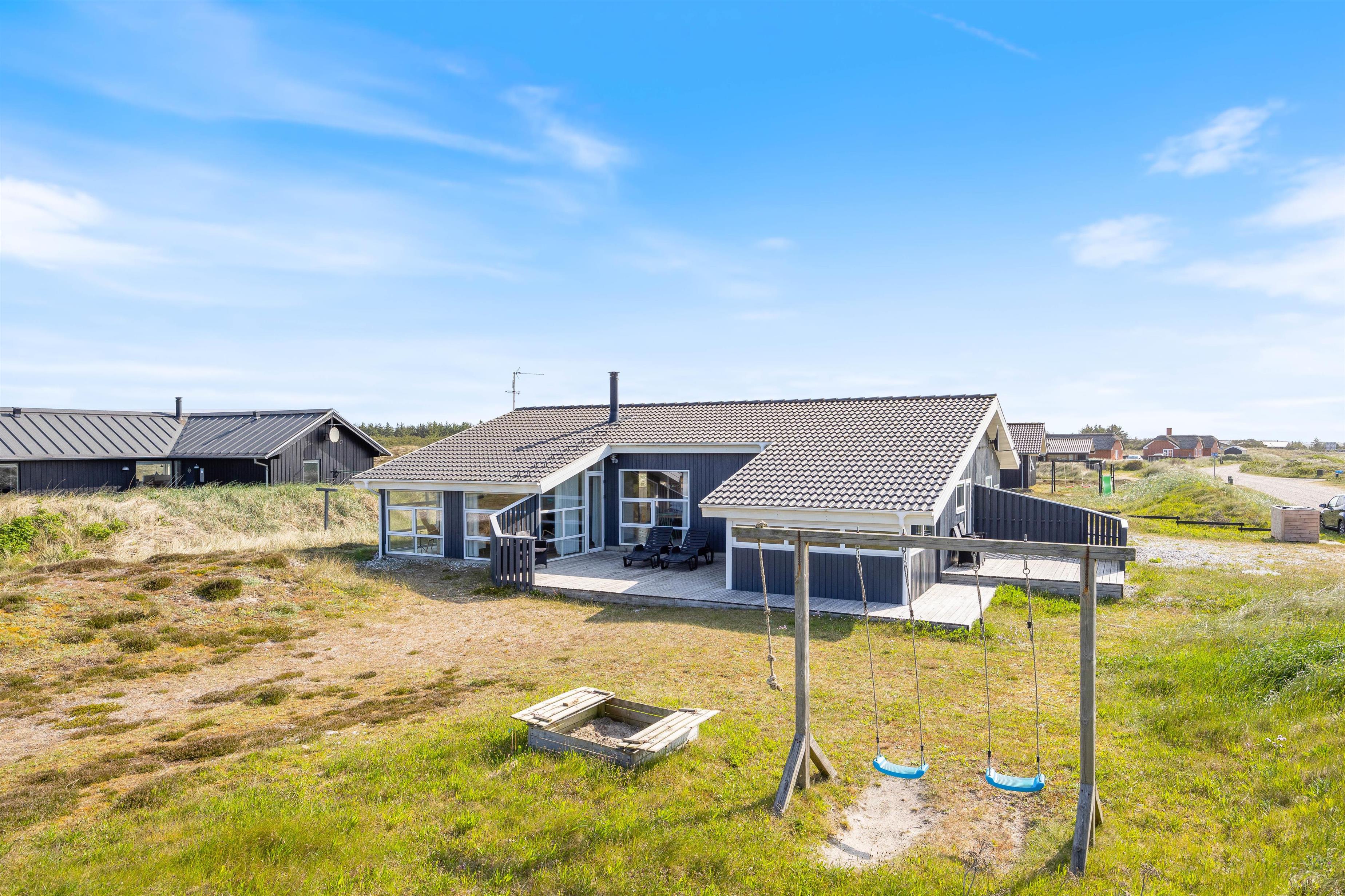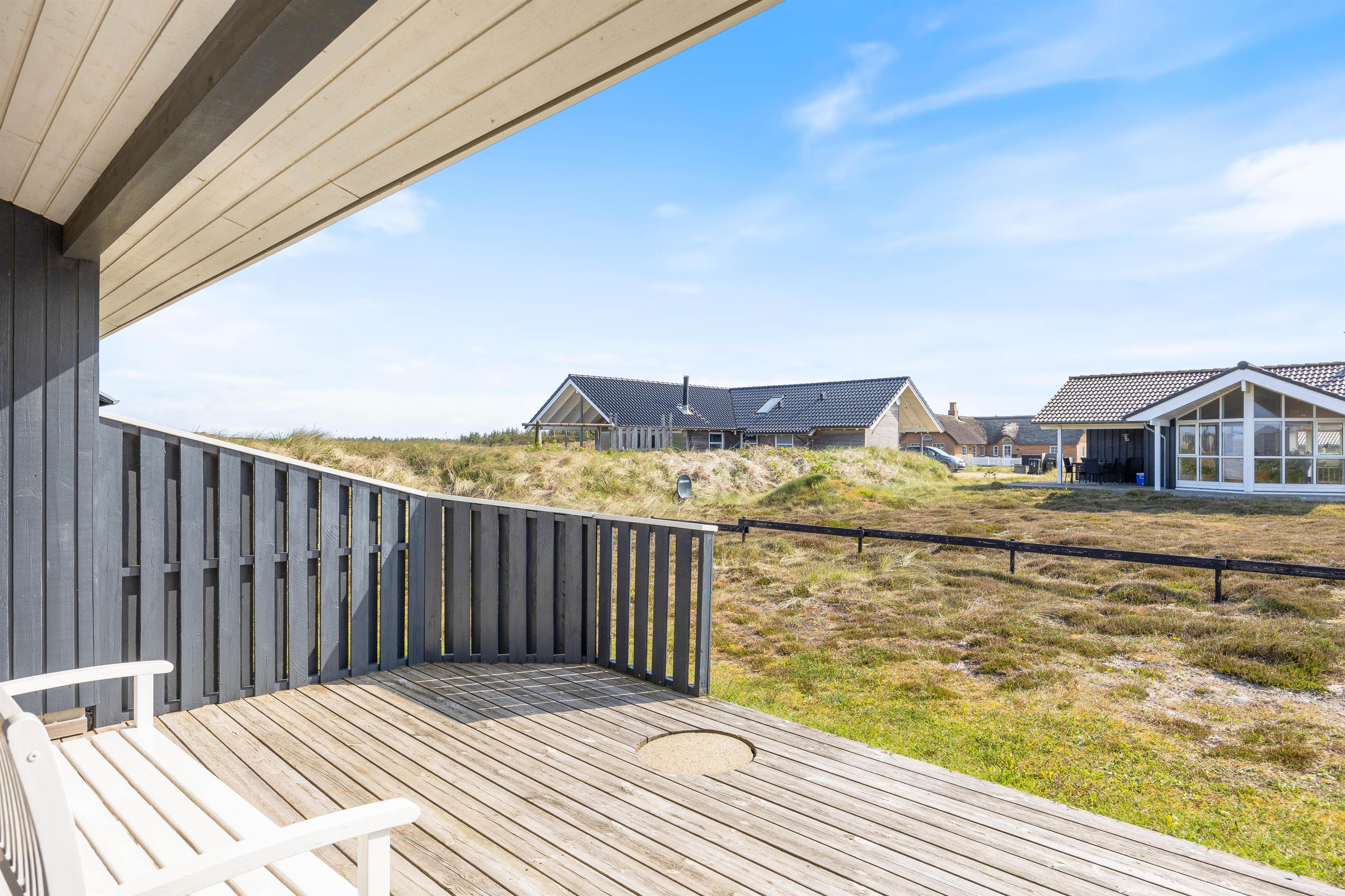 Den afskærmede og delvist overdækkede terrasse giver mulighed for mange gode timer udendørs i den vestjyske natur. Her kan I nyde et lækkert grillmåltid eller nyde solen og udsigten over naturgrunden. Her kan de små børn gynge i gyngestativet eller lege i sandkassen, mens de større kan spille et vikingespil. En frisk gåtur til havet eller fjorden kan fornøje alle aldre.