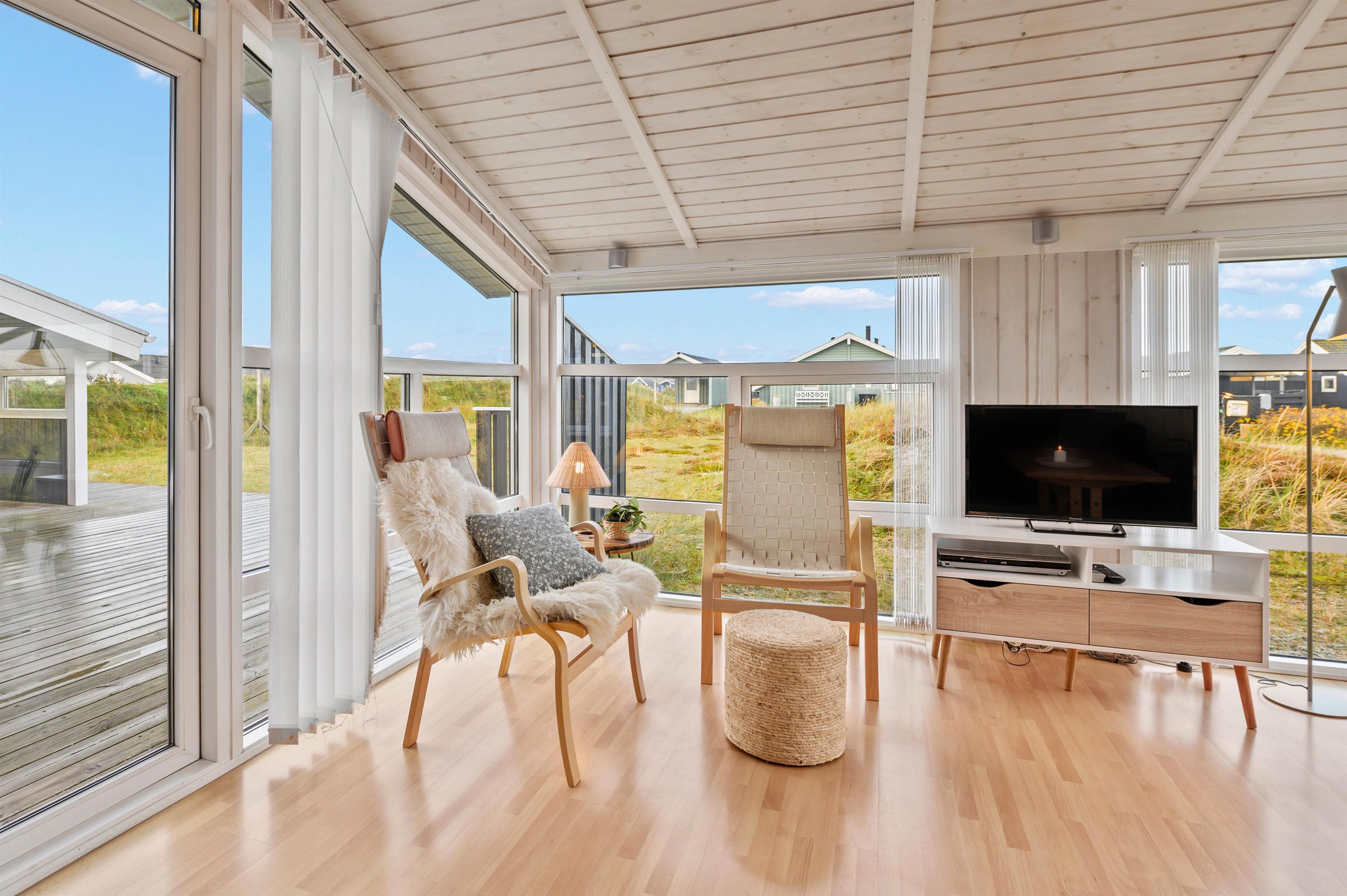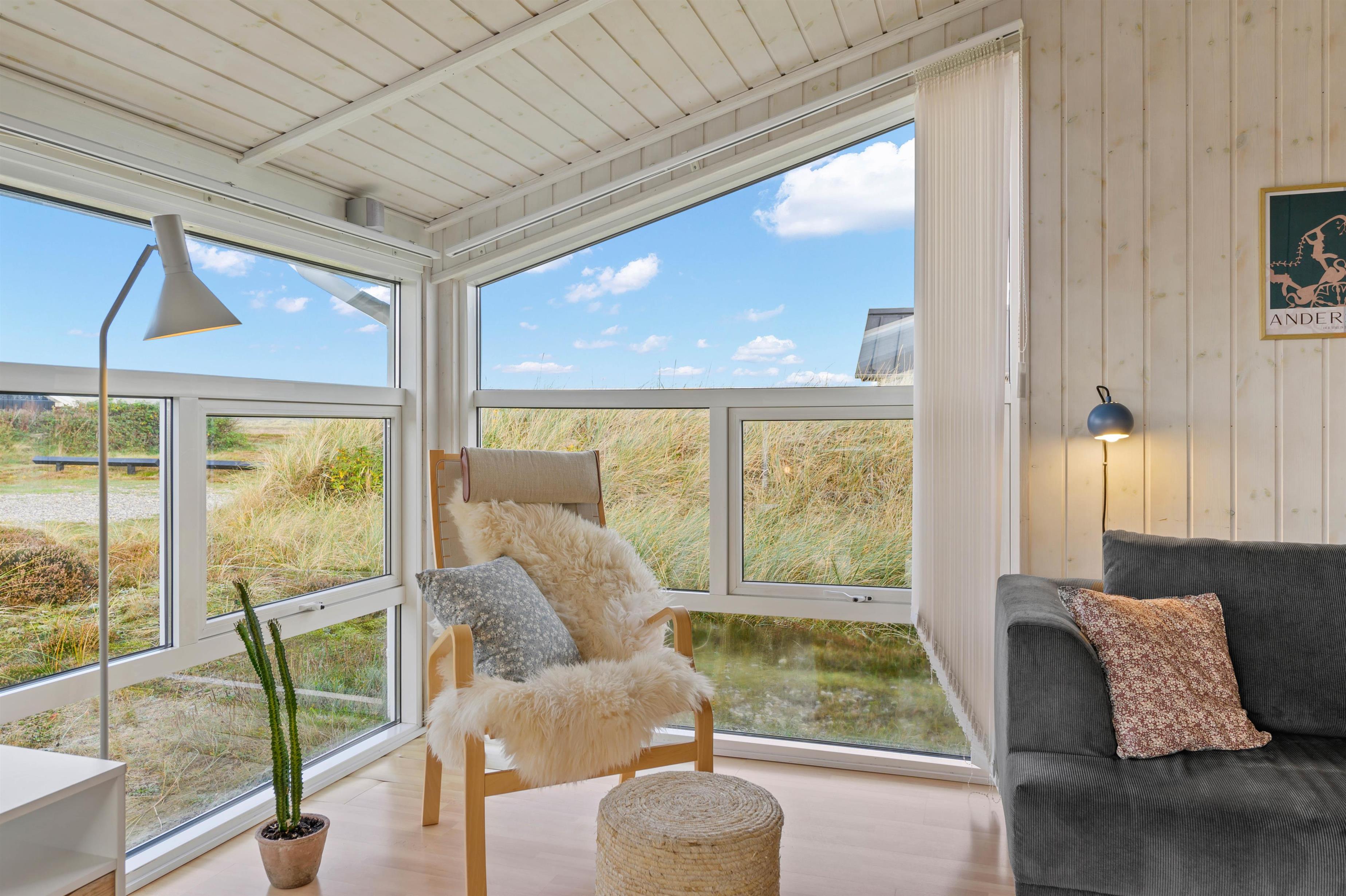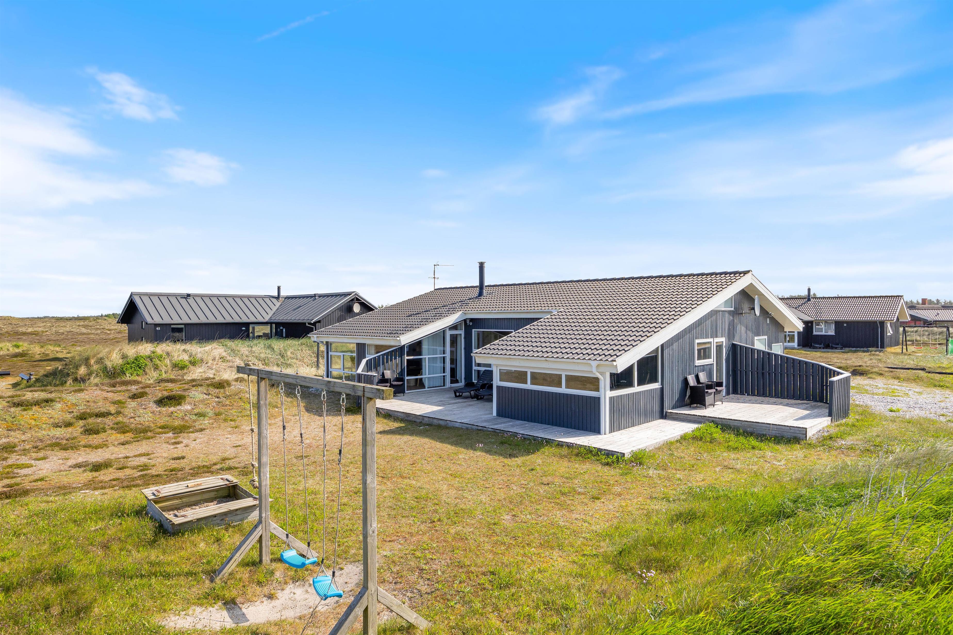 Den afskærmede og delvist overdækkede terrasse giver mulighed for mange gode timer udendørs i den vestjyske natur. Her kan I nyde et lækkert grillmåltid eller nyde solen og udsigten over naturgrunden. Her kan de små børn gynge i gyngestativet eller lege i sandkassen, mens de større kan spille et vikingespil. En frisk gåtur til havet eller fjorden kan fornøje alle aldre.
