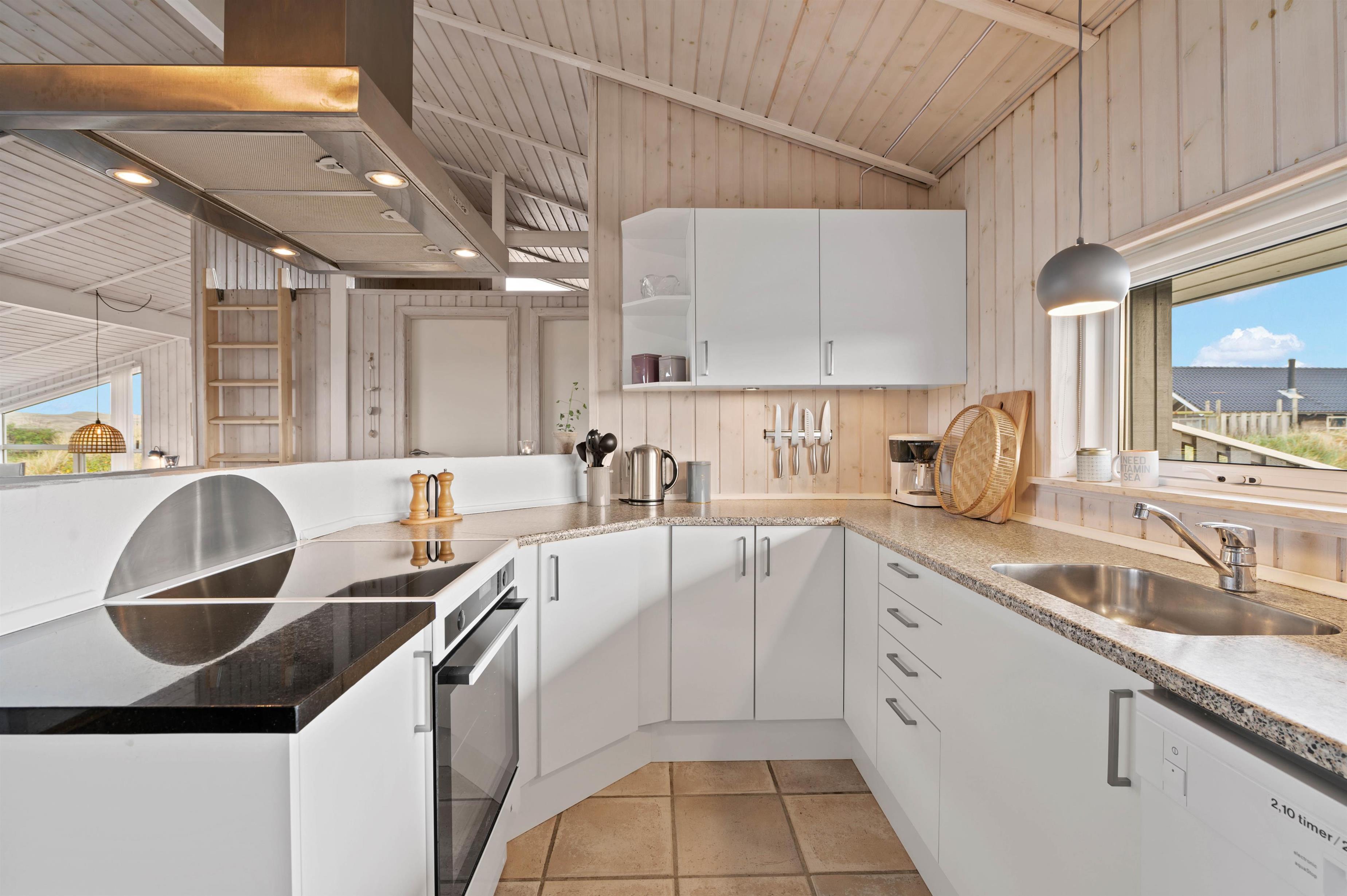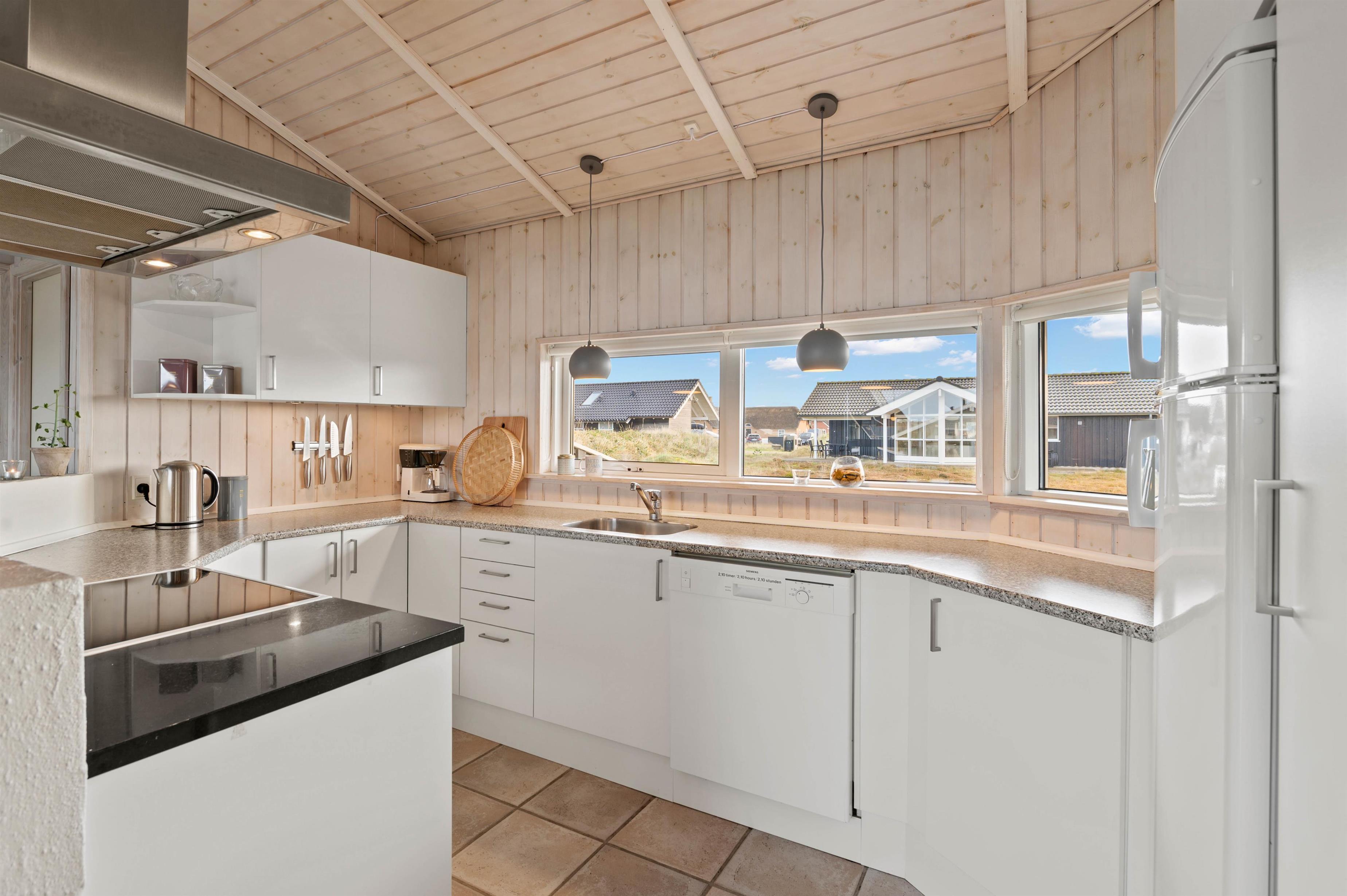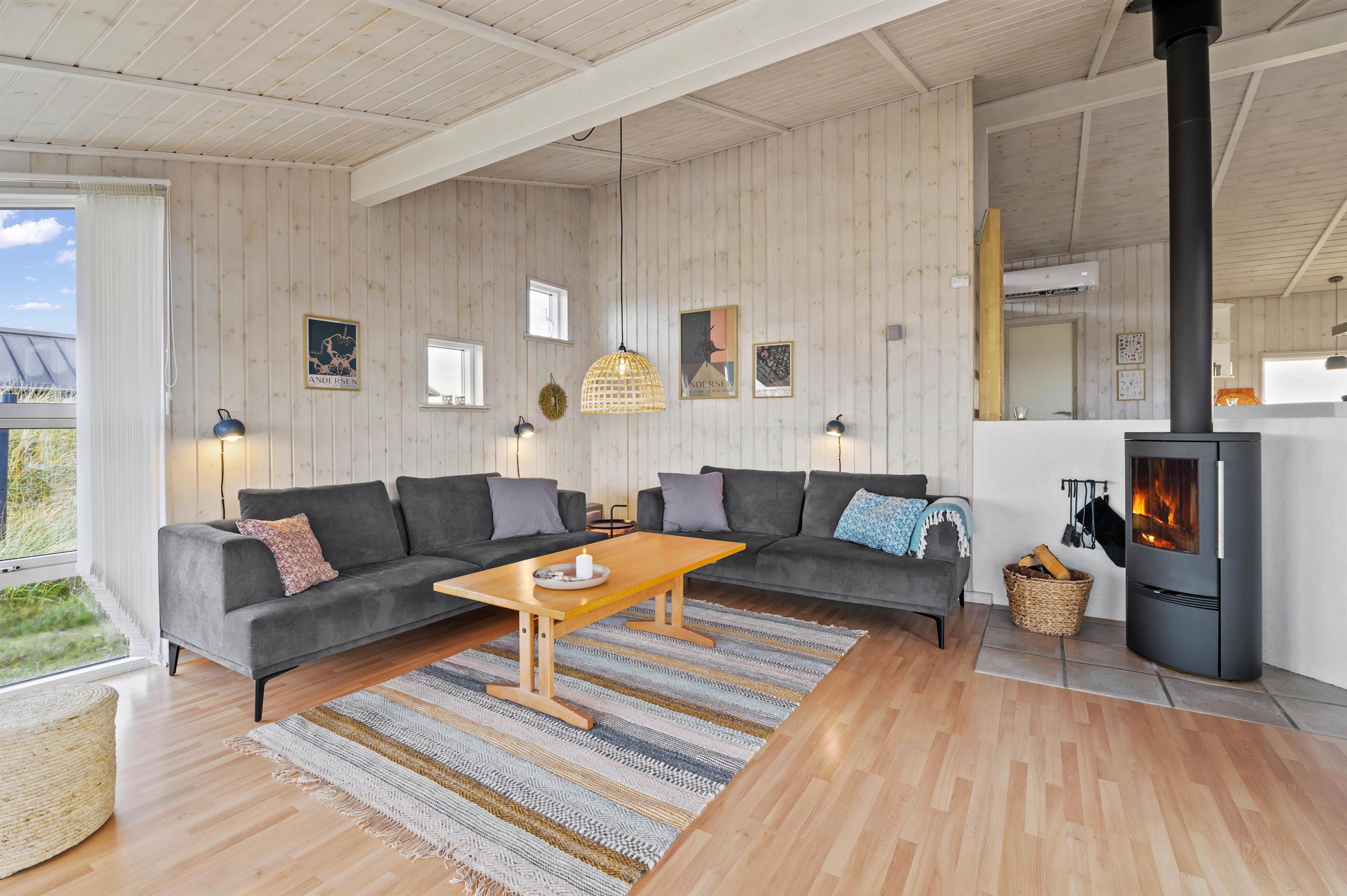 På Arvidvej 60 er det rummelige køkken/alrum centrum for aktivitet og samvær. Køkkenet indeholder bl.a. induktionskomfur, opvaskemaskine og separat 40 liters fryser. I det lyse og venlige alrum kan I hygge jer med fælles spisning eller et sjovt brætspil. I opholdsstuen er der et fantastisk lysindfald igennem de brede vinduespartier. Brændeovnen gør den ekstra hyggelig i aftentimerne, hvor du kan læse en god bog, nyde samværet med familie og venner eller en god film på TV’et.