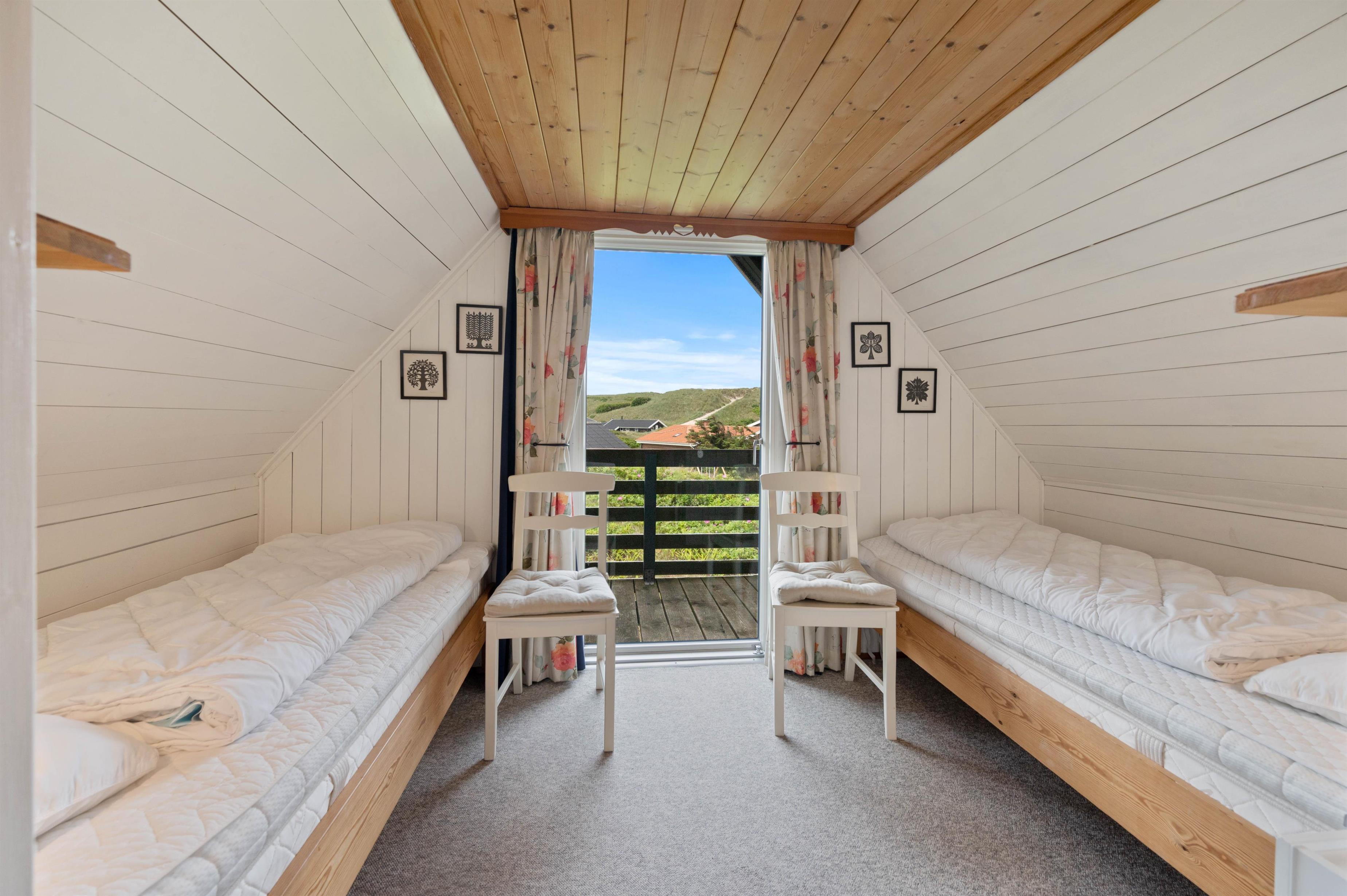 Førstesalen indeholder 2 soveværelser og en charmerende repos med et par gode stole, hvor du kan sidde med en god bog og en kop te. Fra det ene soveværelse er der endvidere udgang til en lille svalegang, hvor I kan nyde udsigten over det betagende klitlandskab.