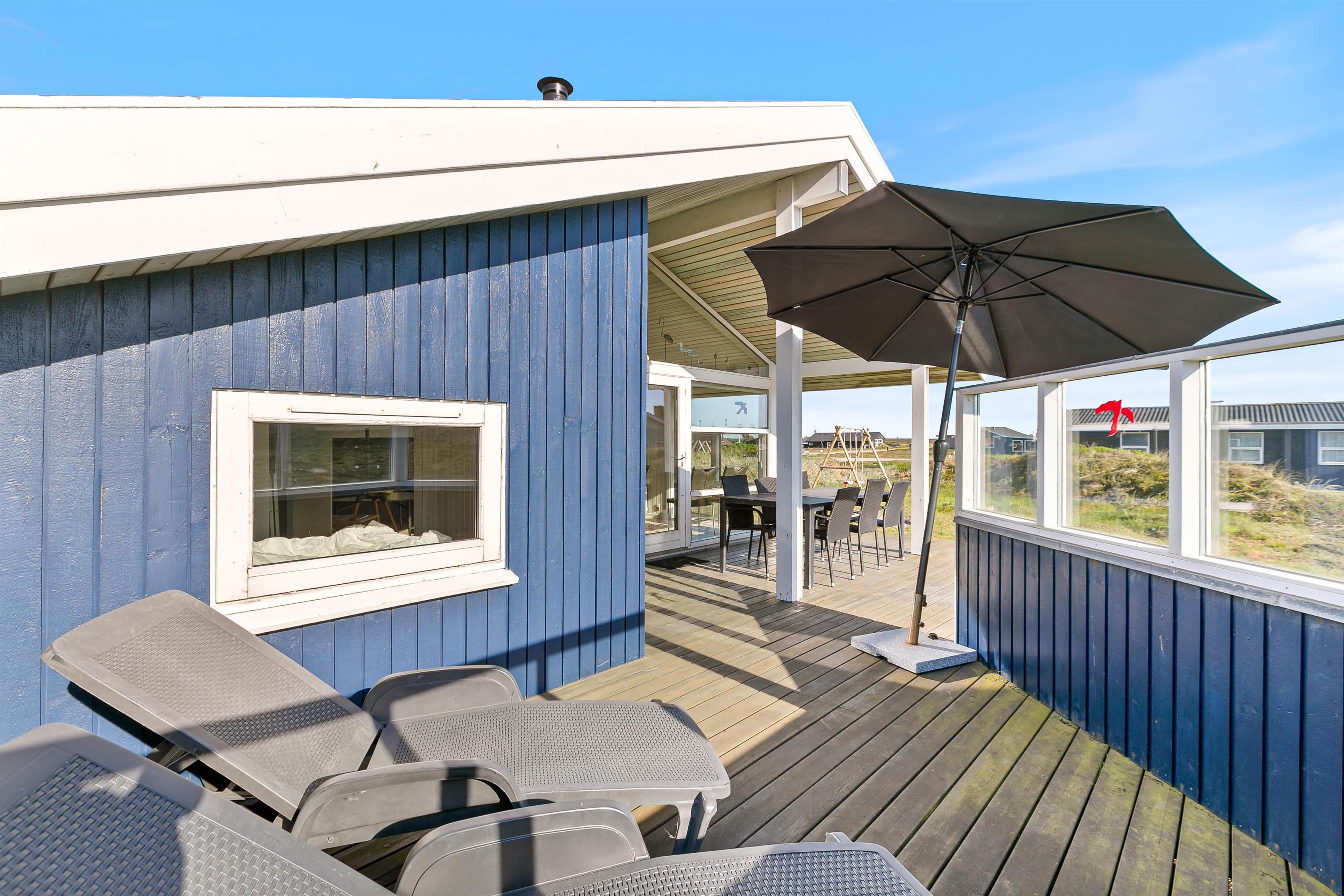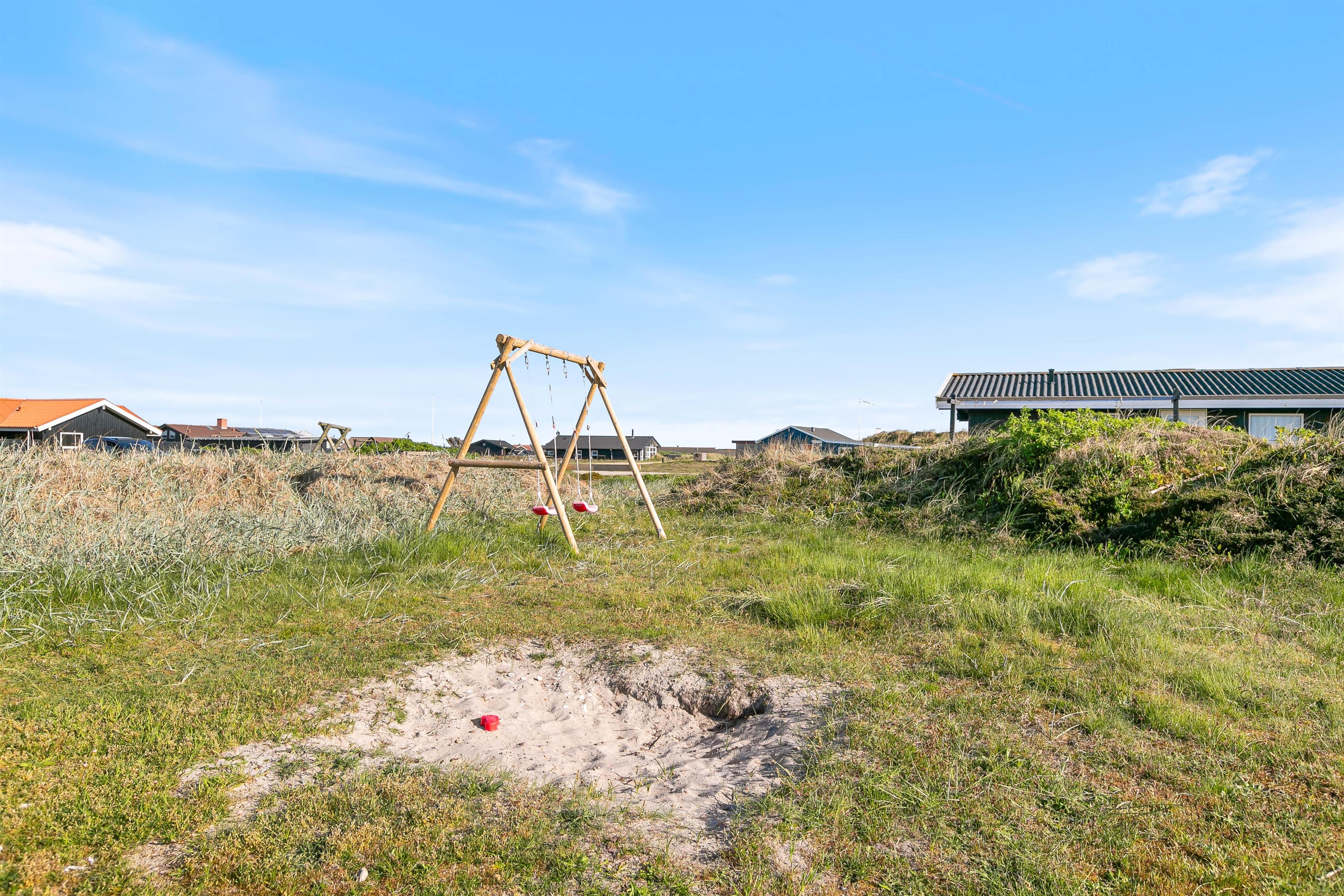 Rundt om sommerhuset finder I flere hyggelige, afskærmede terrasser med gode havemøbler, liggestole og grill. For de mindste er der både gyngestativ og sandkasse på naturgrunden. Fra alle terrasser kan I nyde udsigten til det skønne landskab, som indbyder til en travetur med børn og hund.
