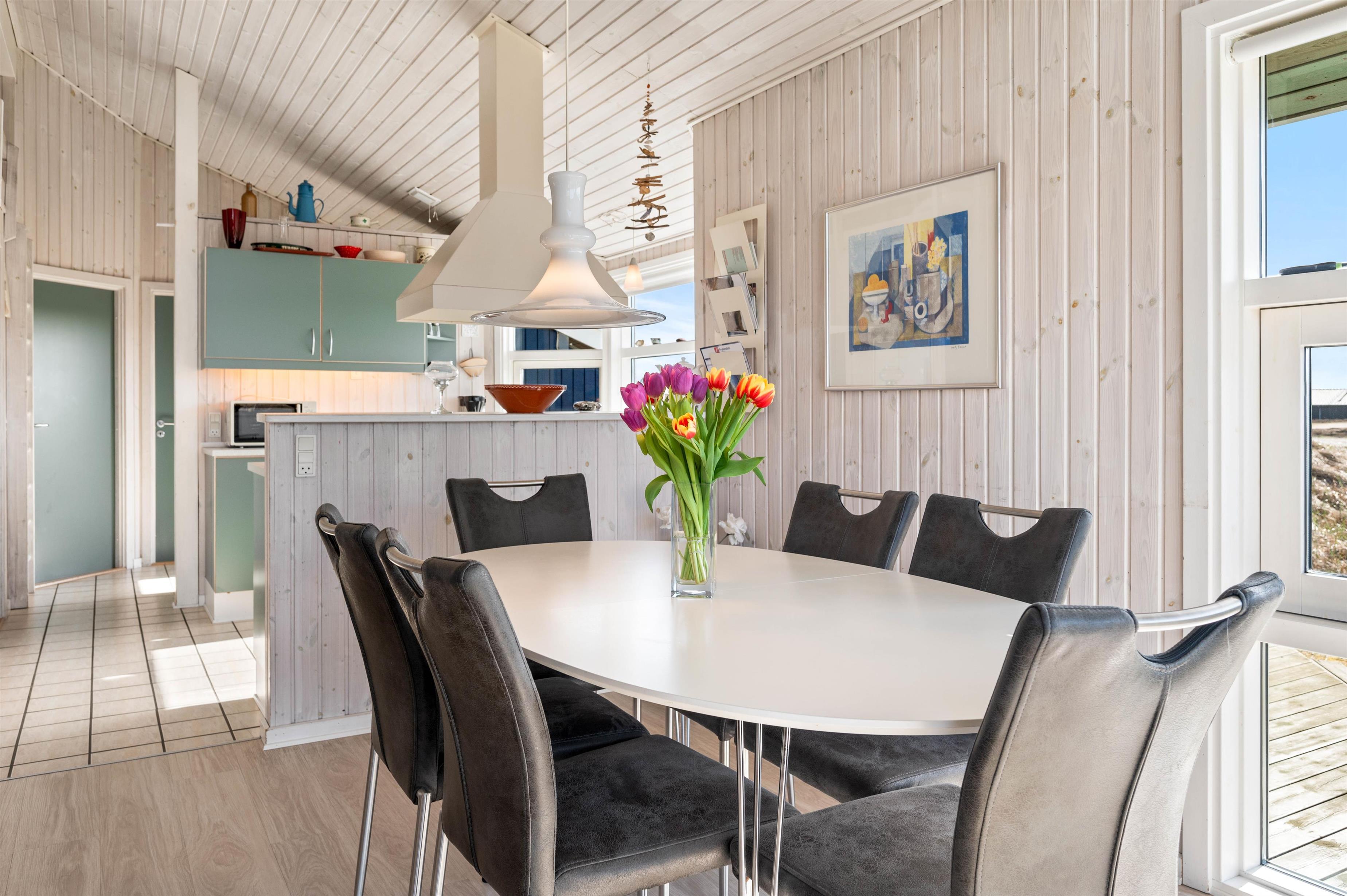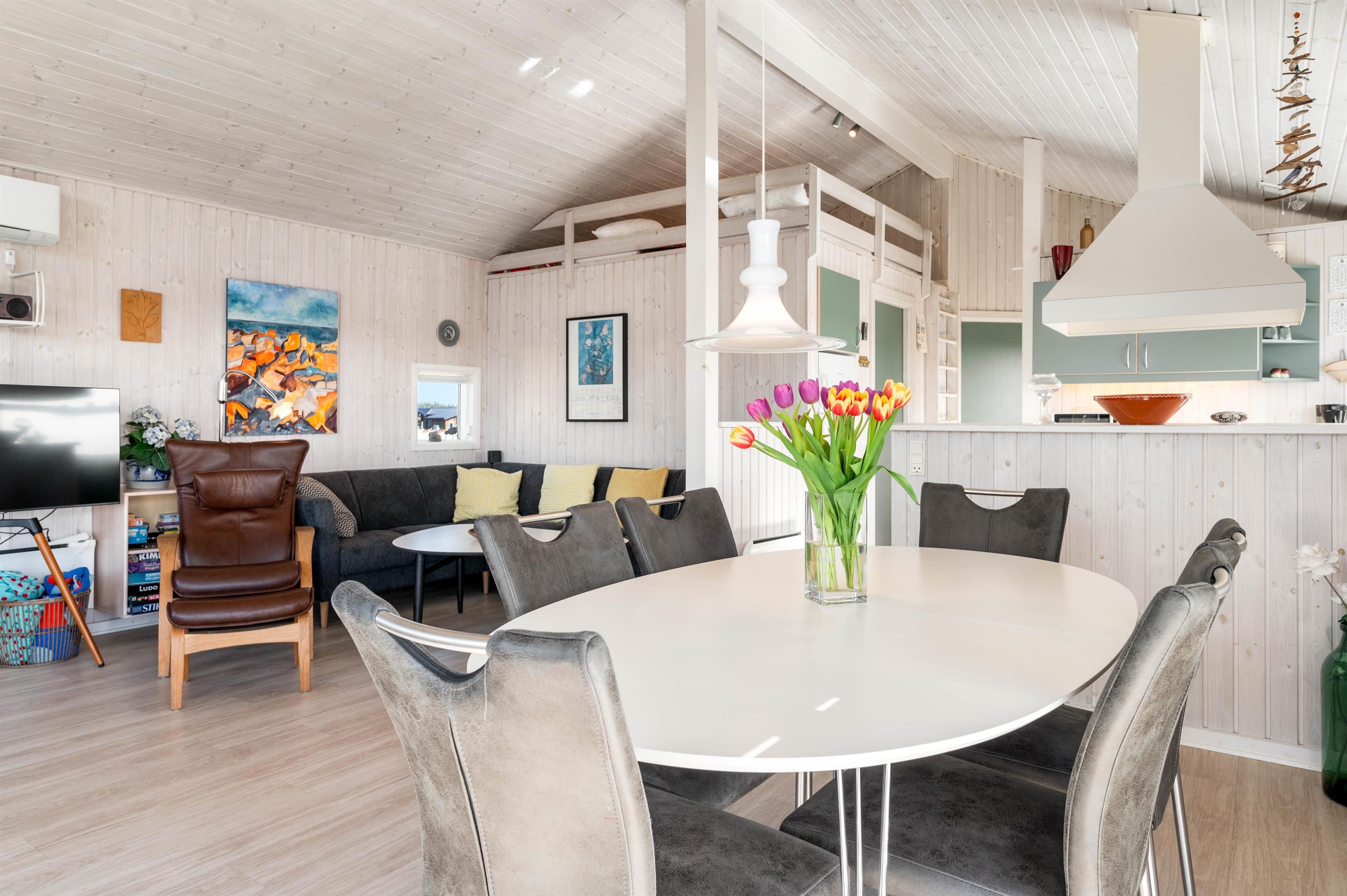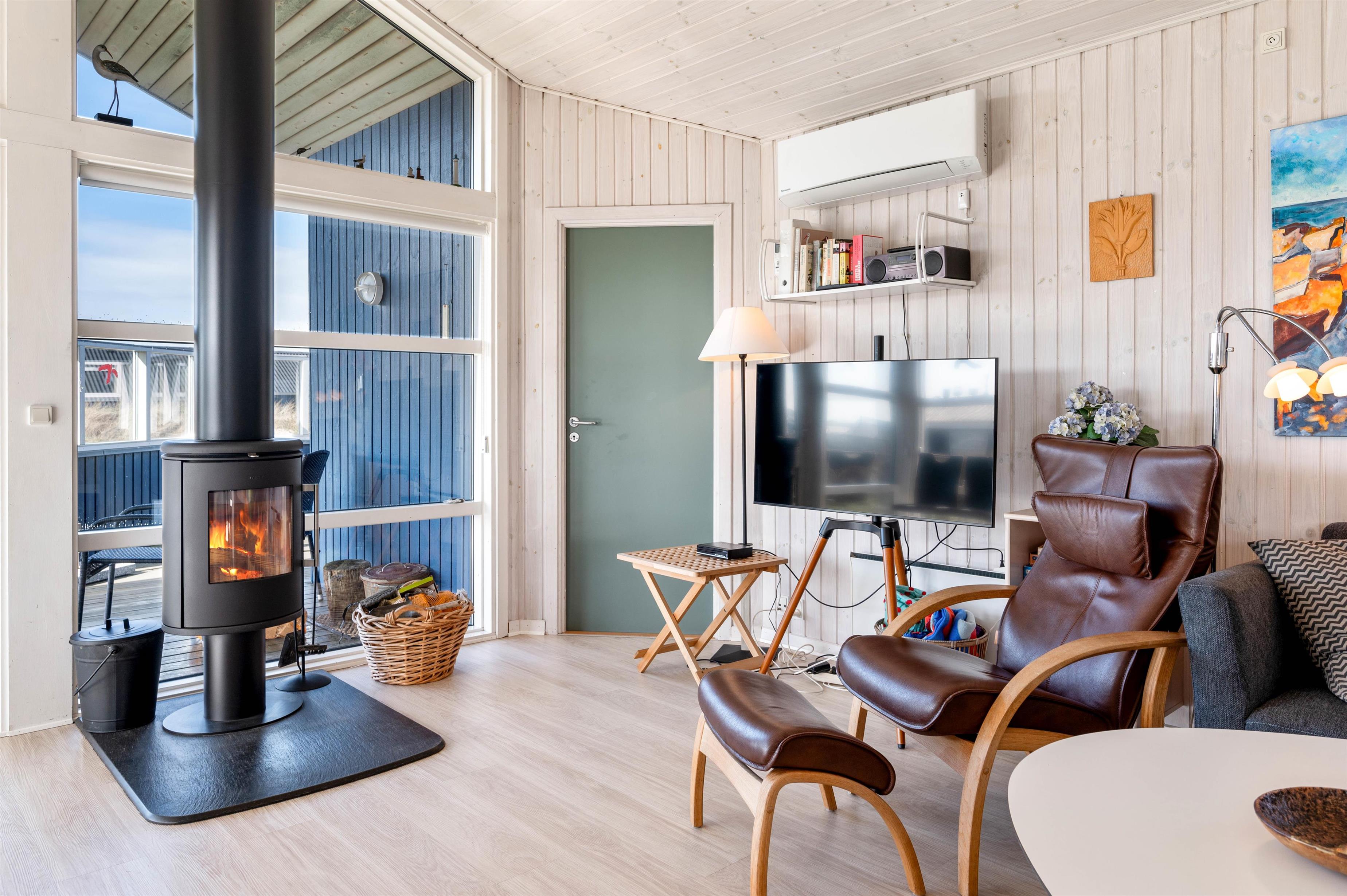 Dette lyse og venlige feriehus er flot indrettet med loft til kip og lyse træbeklædte vægge. Det veludstyrede køkken står i åben forbindelse med den store og hyggelige stue, hvor brændeovnen skaber ægte sommerhushygge. Herfra kan I nyde udsigten over det smukke naturområde ved Arvidvej i Bjerregård. Her får I gratis trådlåst internet samt en energibesparende varmepumpe, der sørger for et behageligt indeklima.