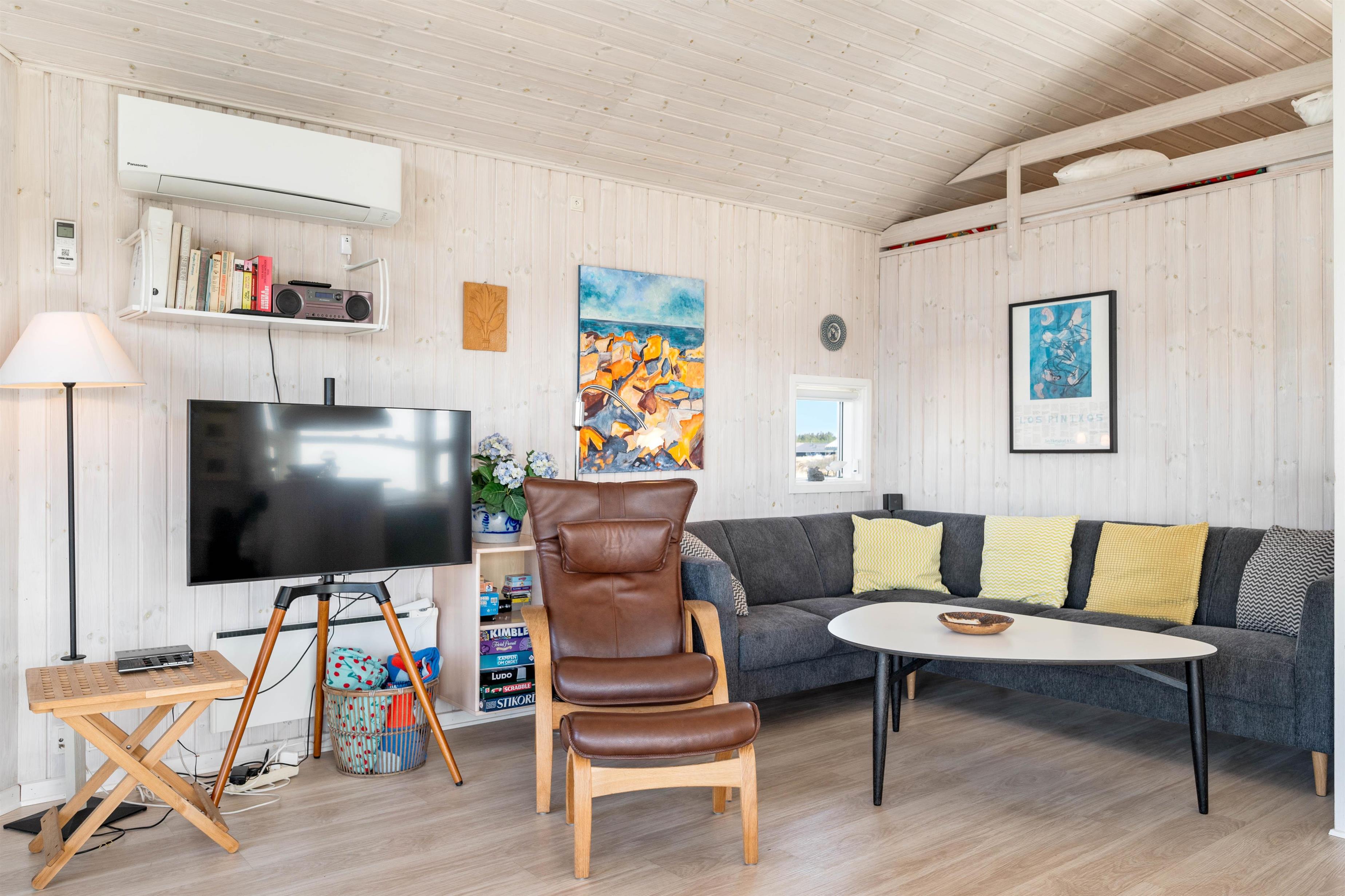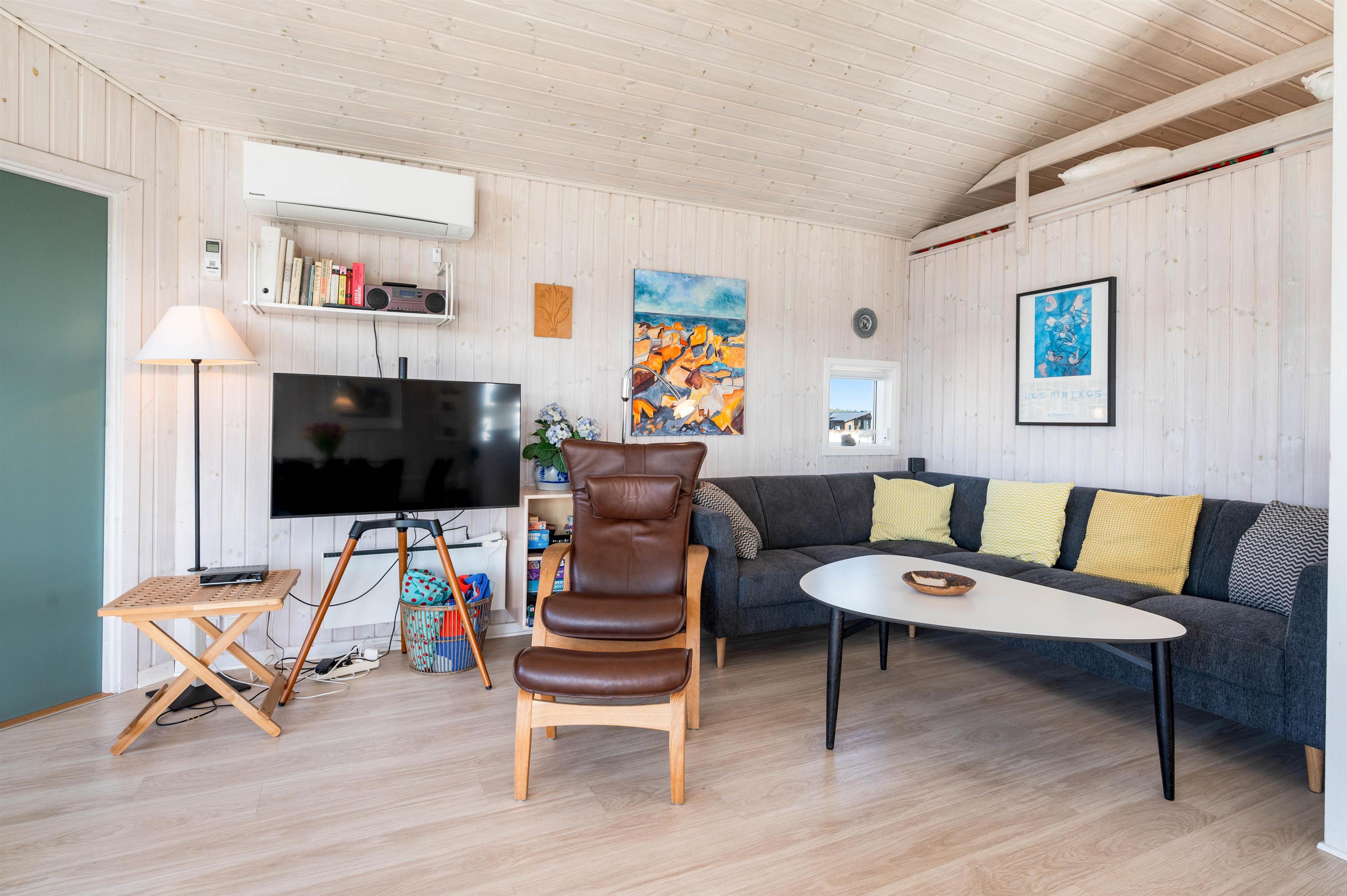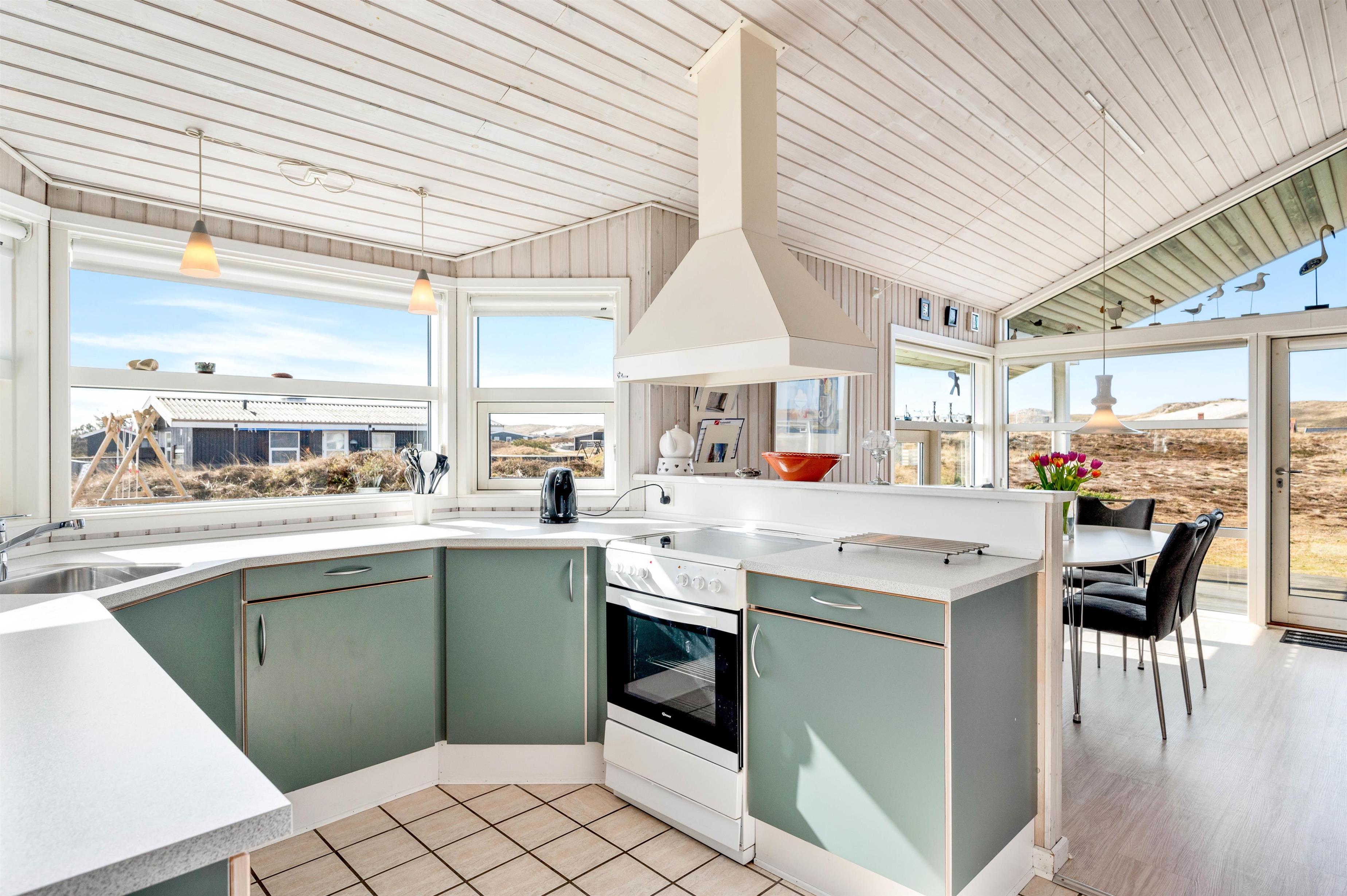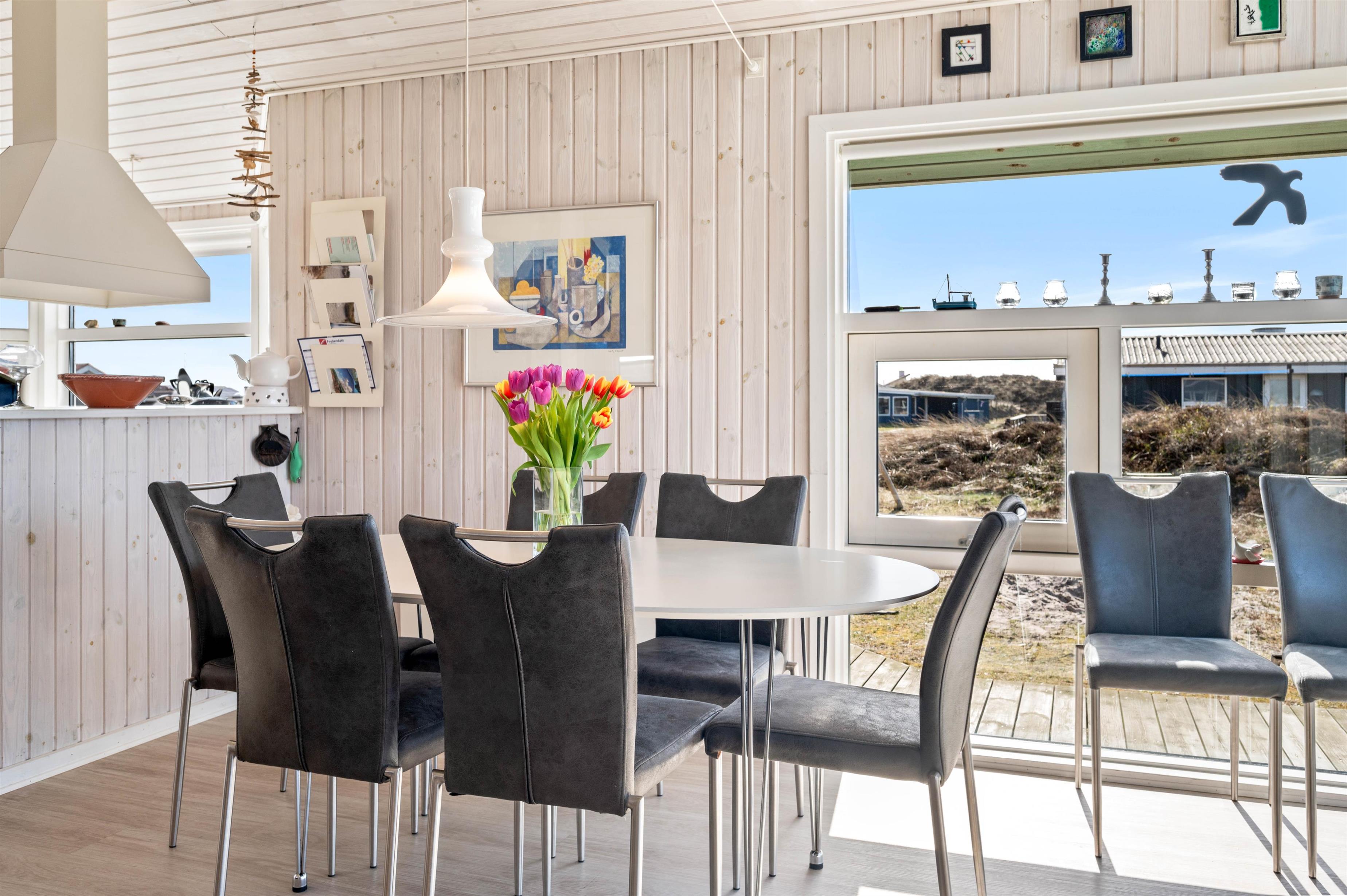 Dette lyse og venlige feriehus er flot indrettet med loft til kip og lyse træbeklædte vægge. Det veludstyrede køkken står i åben forbindelse med den store og hyggelige stue, hvor brændeovnen skaber ægte sommerhushygge. Herfra kan I nyde udsigten over det smukke naturområde ved Arvidvej i Bjerregård. Her får I gratis trådlåst internet samt en energibesparende varmepumpe, der sørger for et behageligt indeklima.