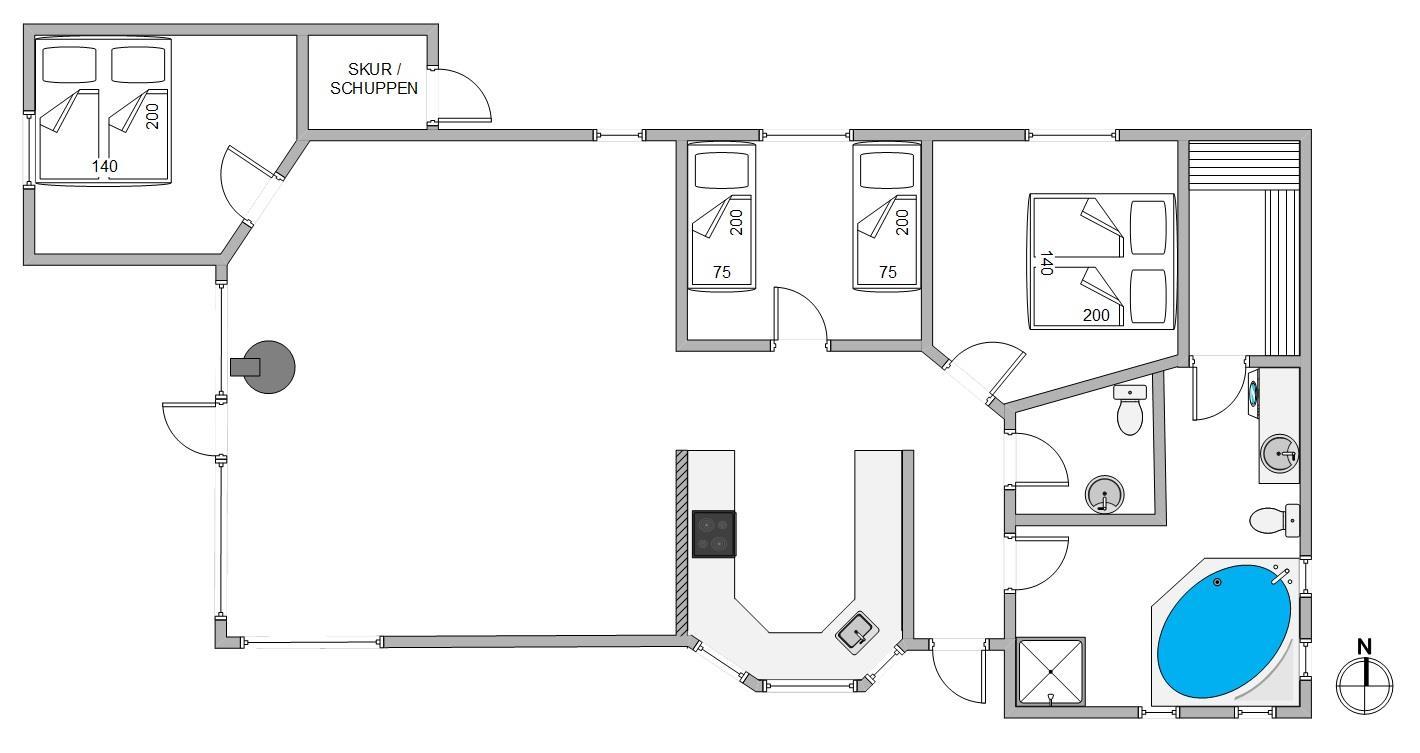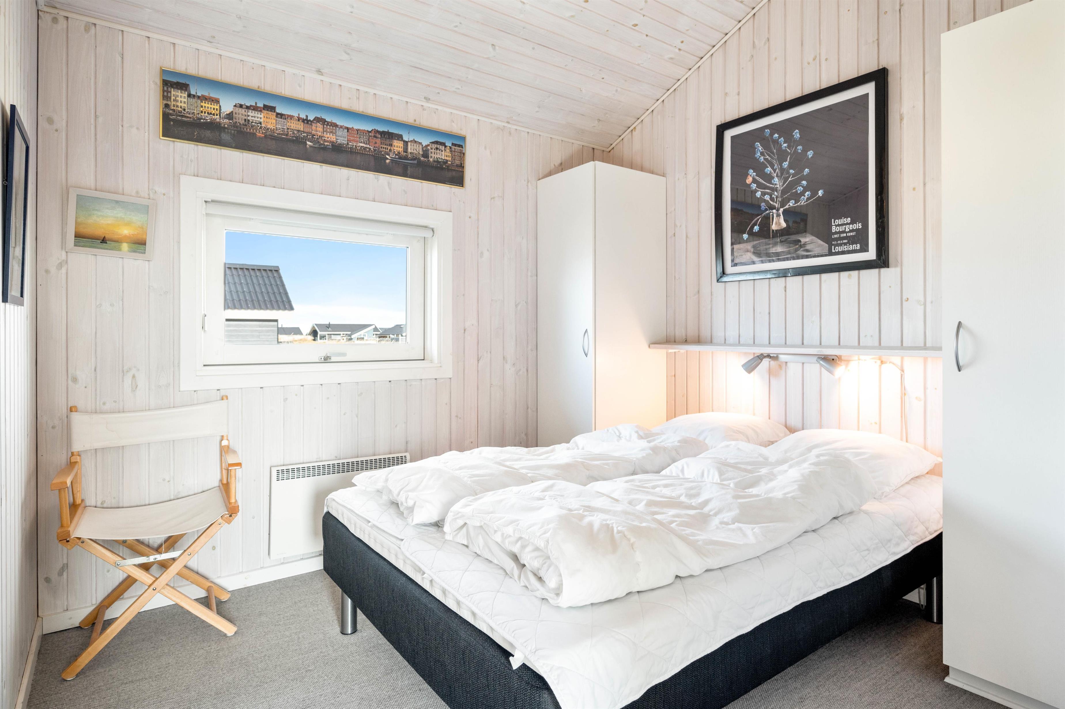 Sommerhuset har 3 gode soverum og en hems, så der er rigeligt med sovepladser at vælge i mellem. 2 værelser er med dobbeltsenge, et værelse med 2 enkeltsenge. Hemsen vil familiens store børn helt sikkert sætte pris på.