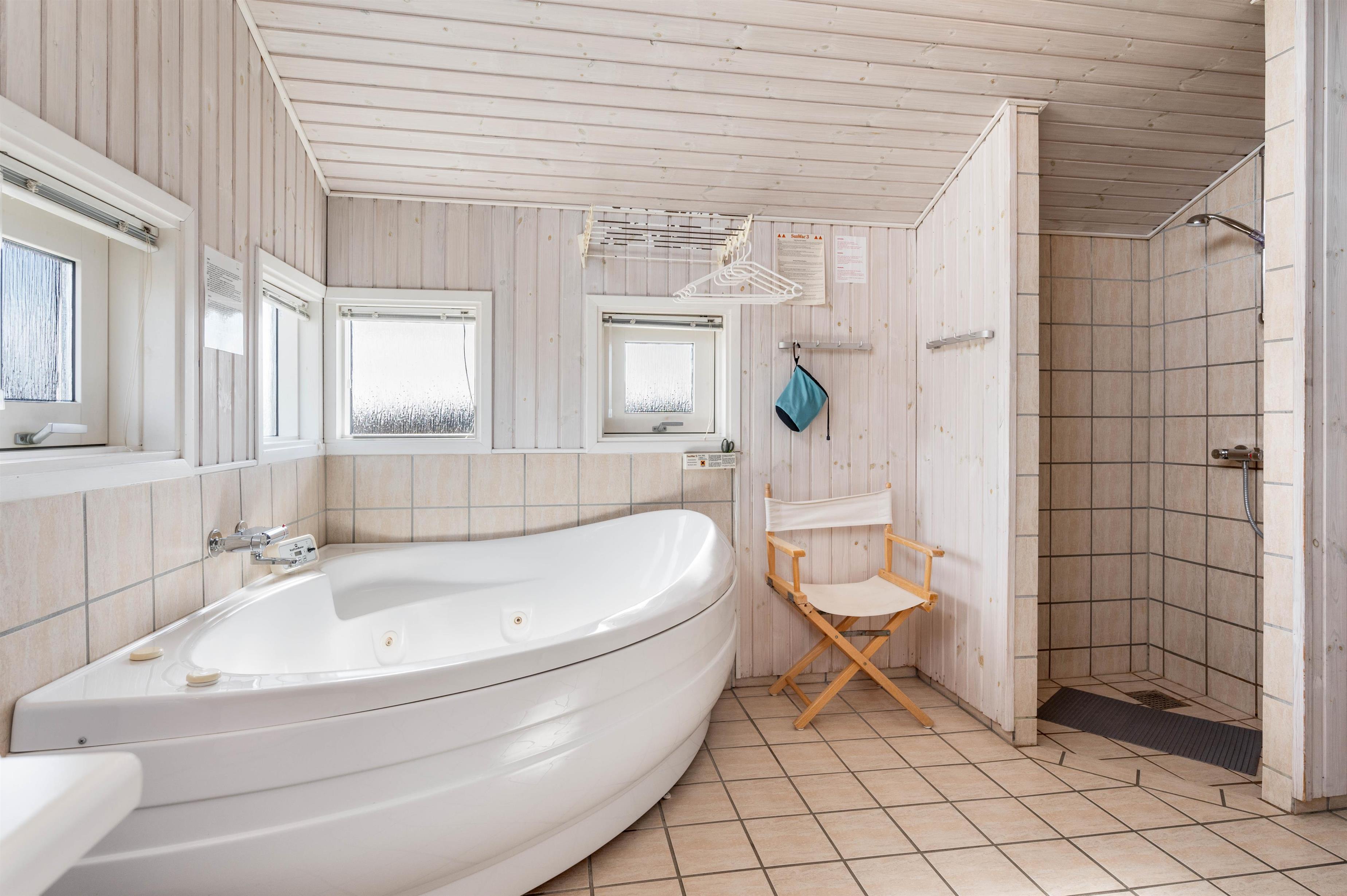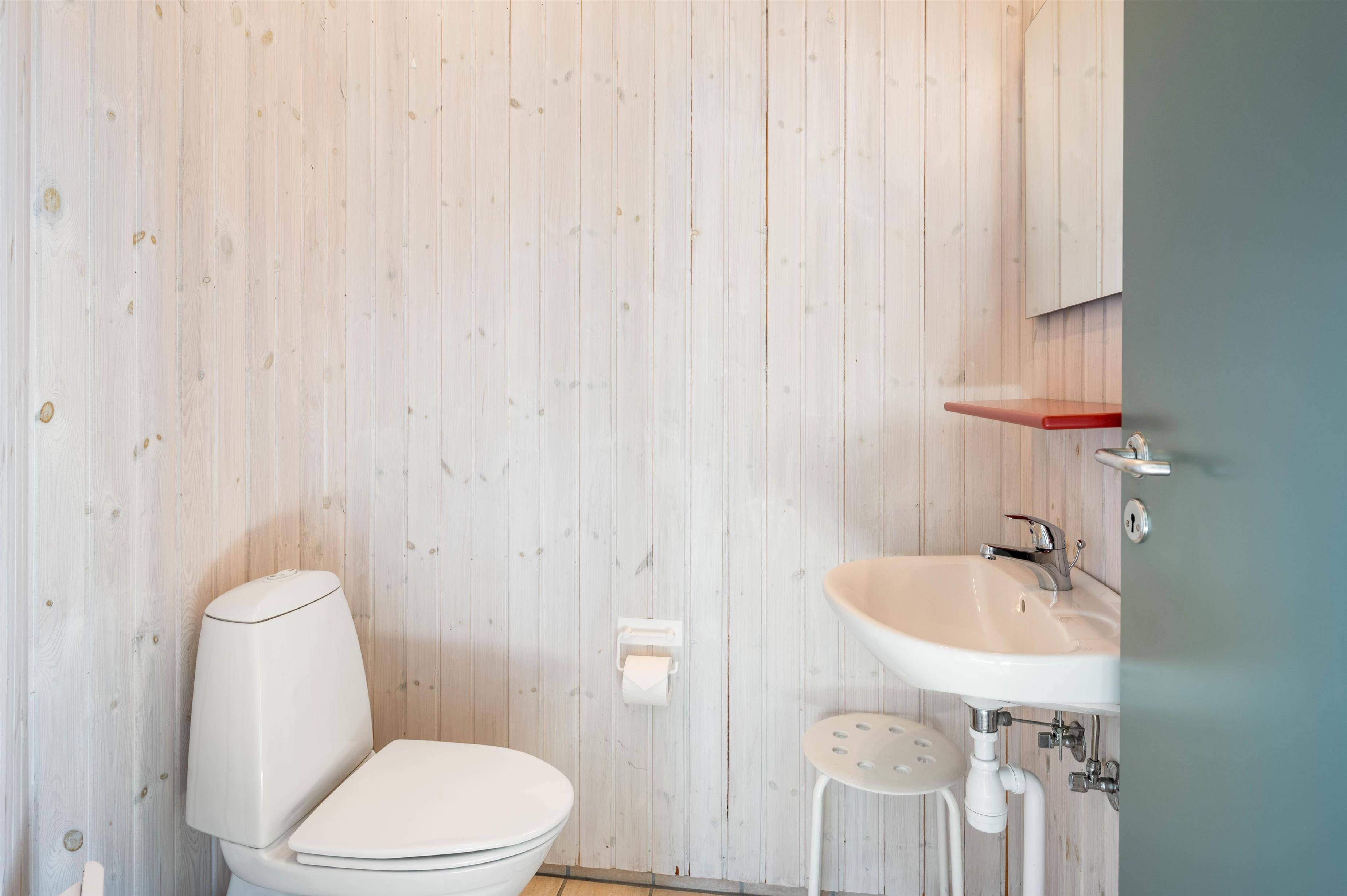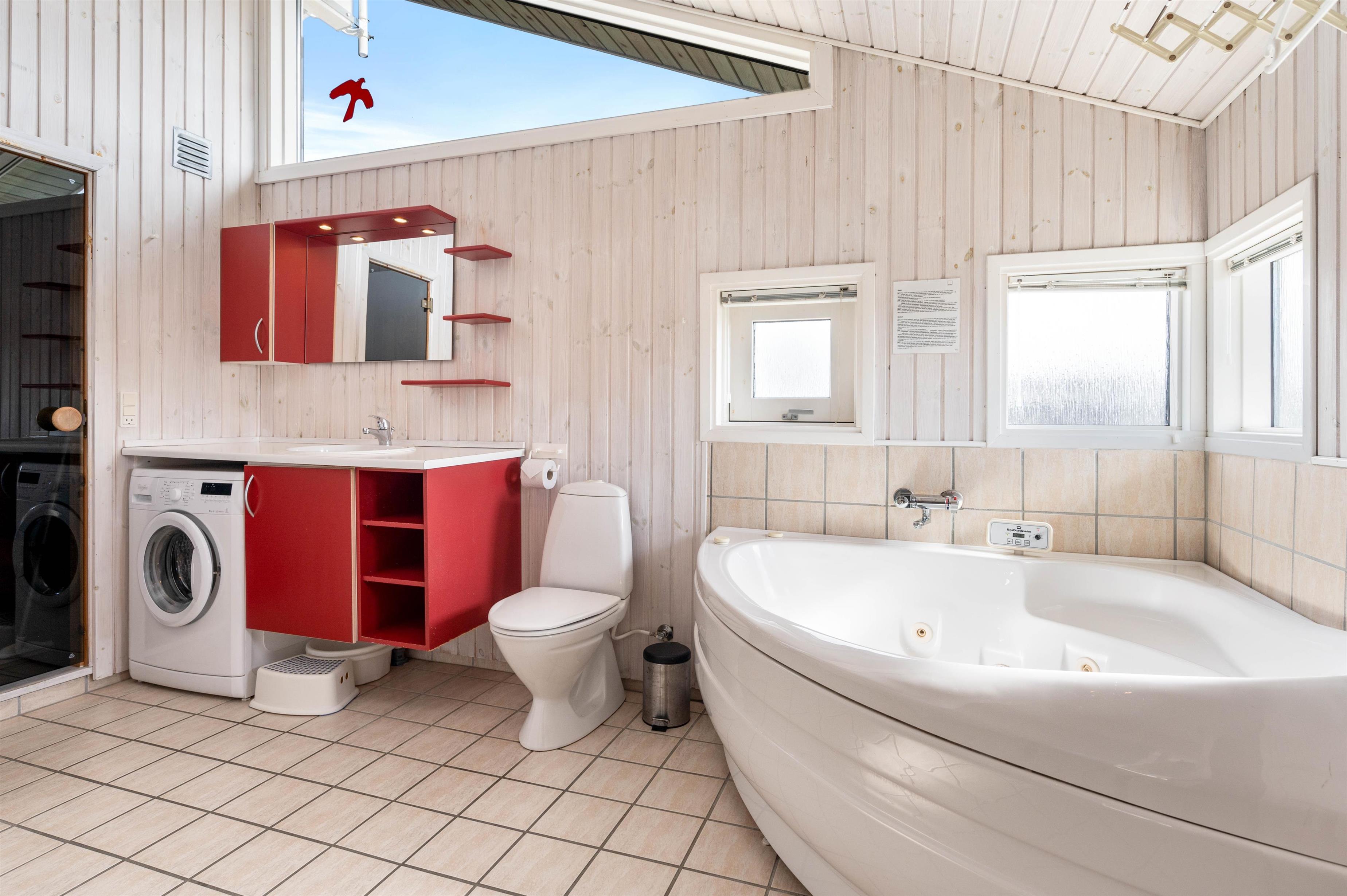 Det store badeværelse, som er udstyret med 2-personers spa og stor sauna, har gulvvarme. Her findes både vaskemaskine og tørretumbler. Desuden har sommerhuset et praktisk gæstetoilet, så der ikke opstår kø fra morgenstunden.