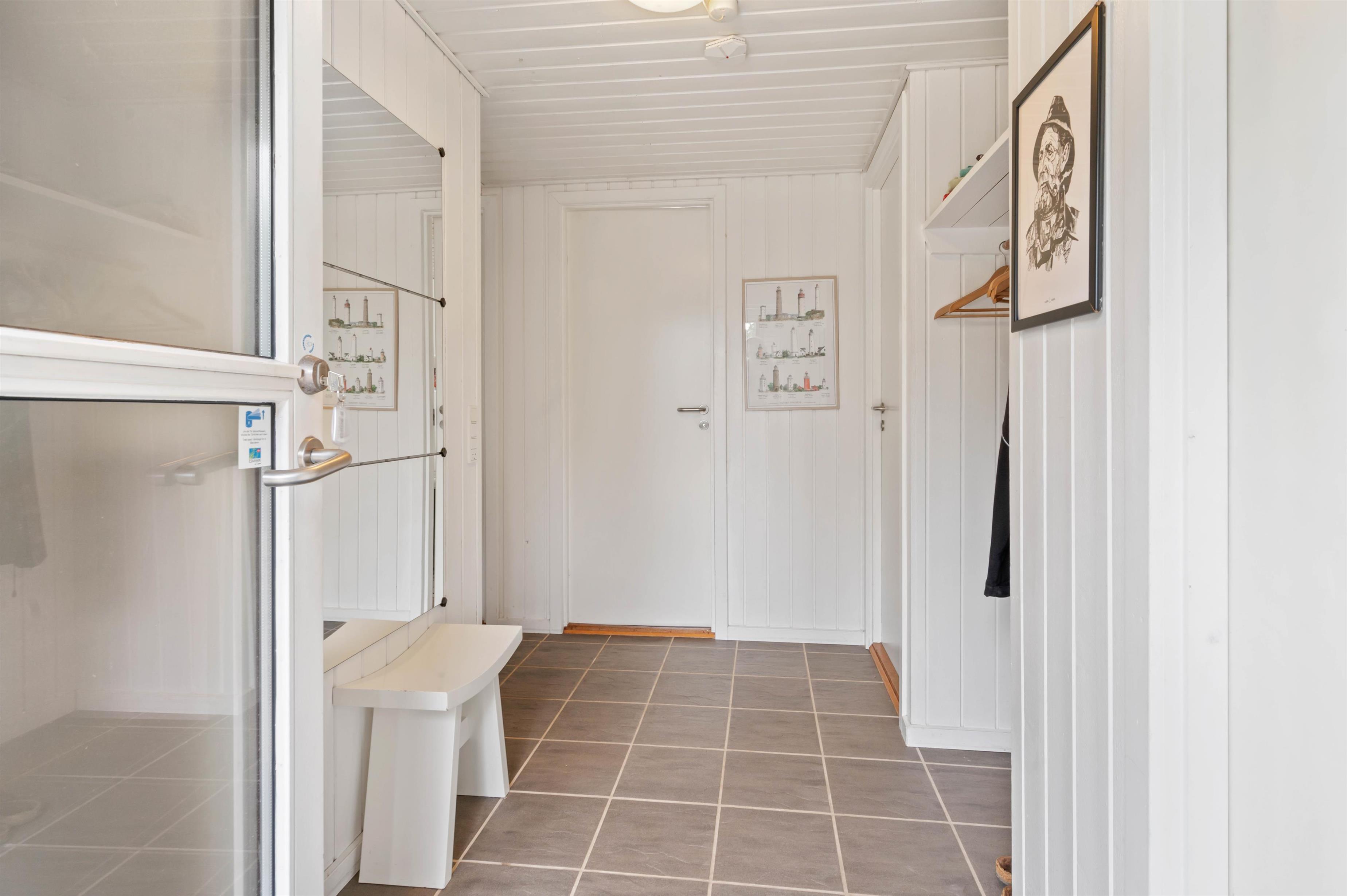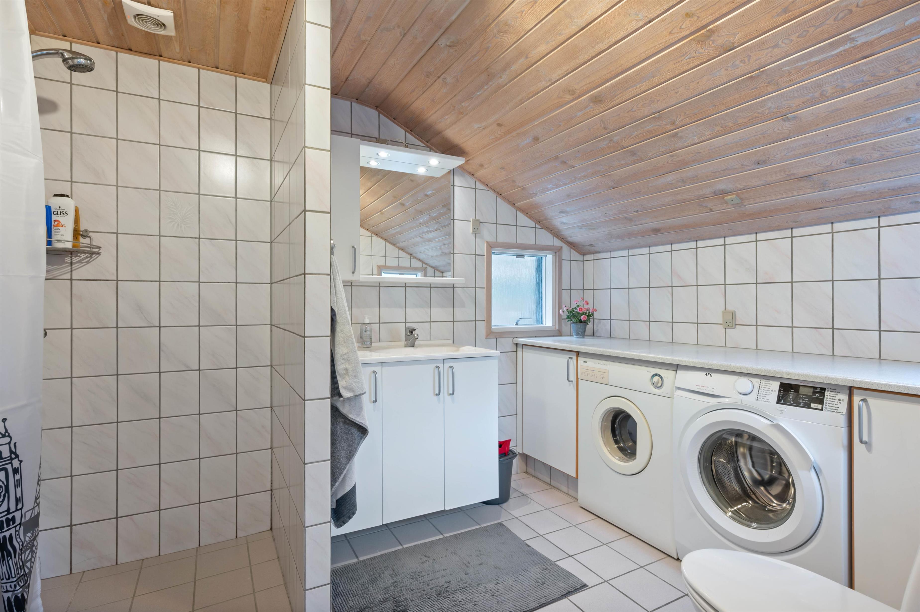 Her er et stort og flot badeværelse med gulvvarme og bruseniche. Desuden finder I både vaskemaskine samt tørretumbler i sommerhuset, så I altid kan have nyvaskede håndklæder til morgendagens tur på stranden.