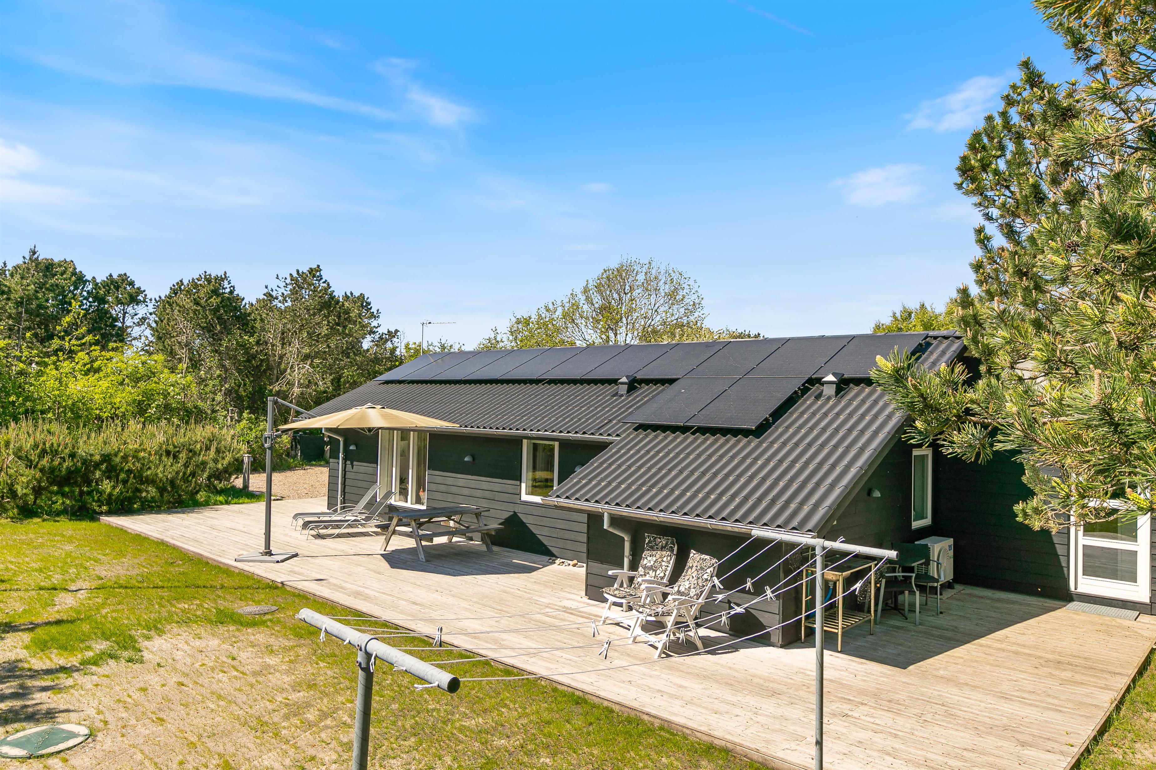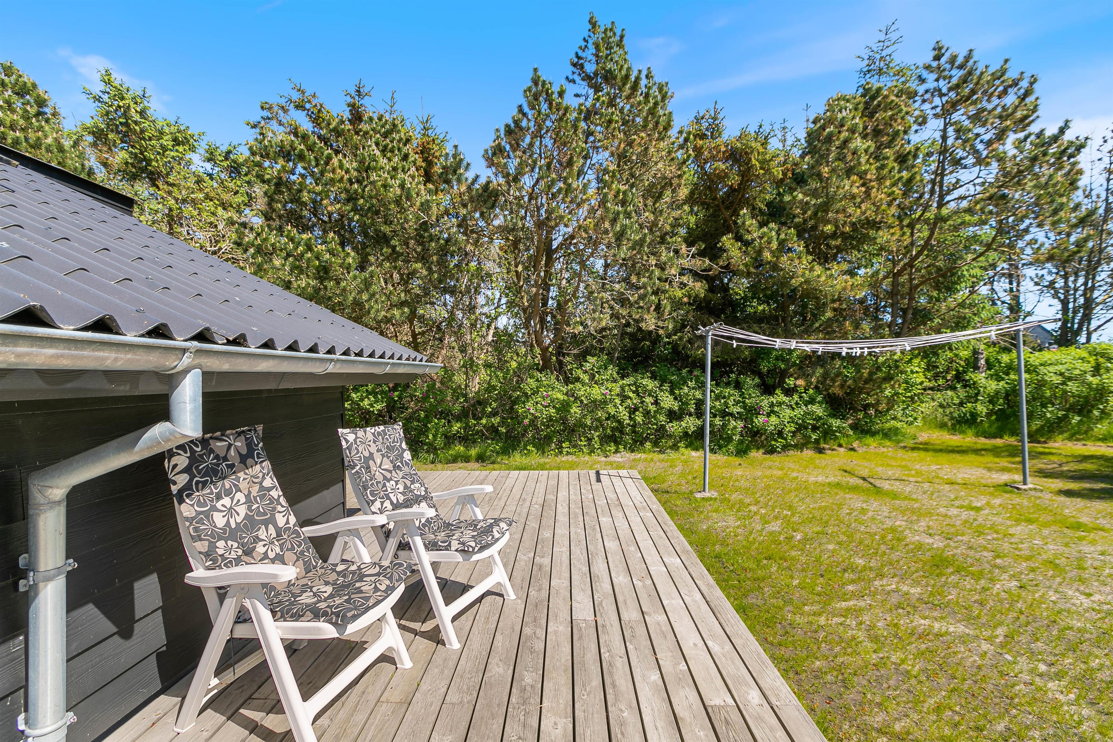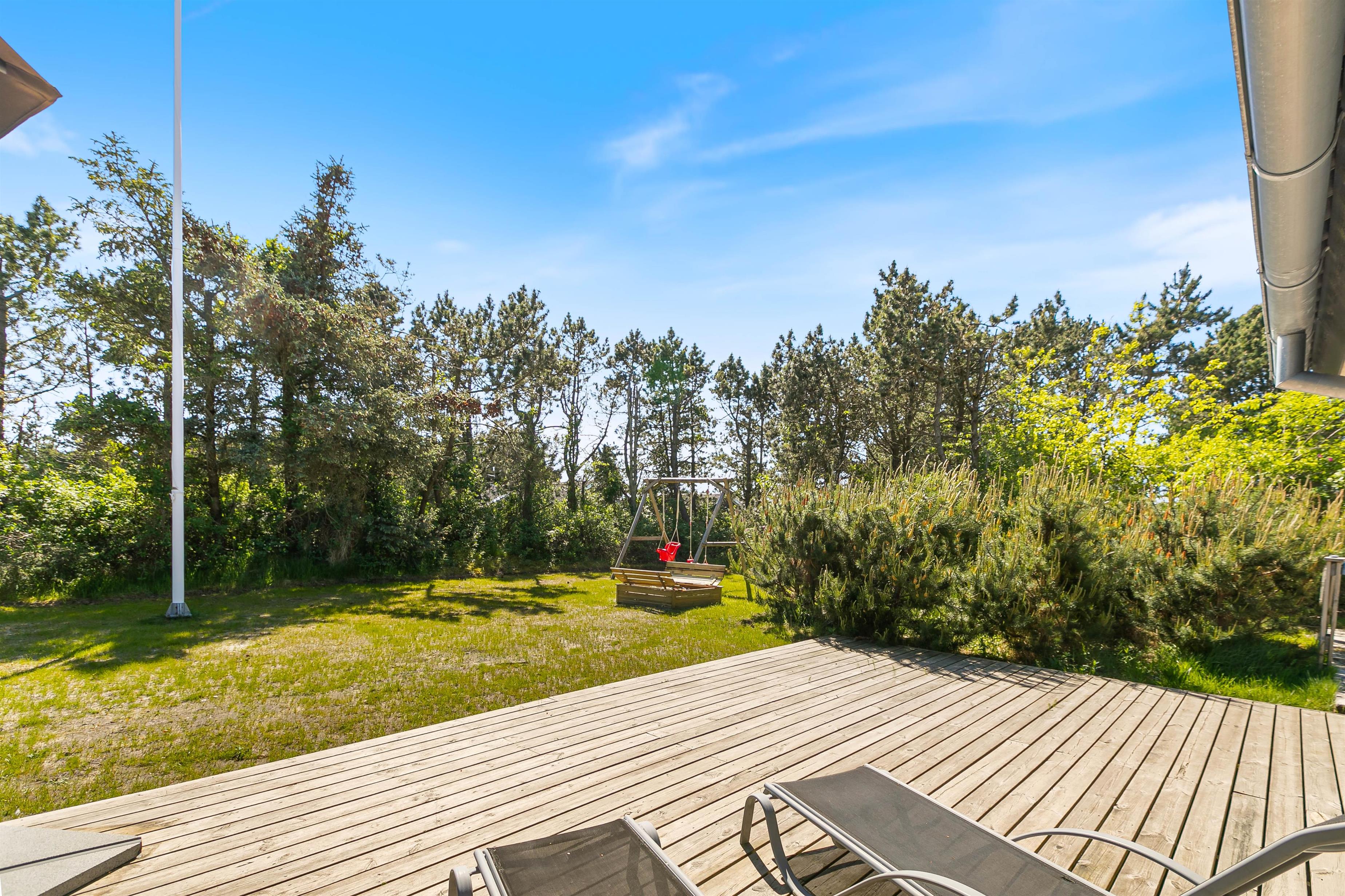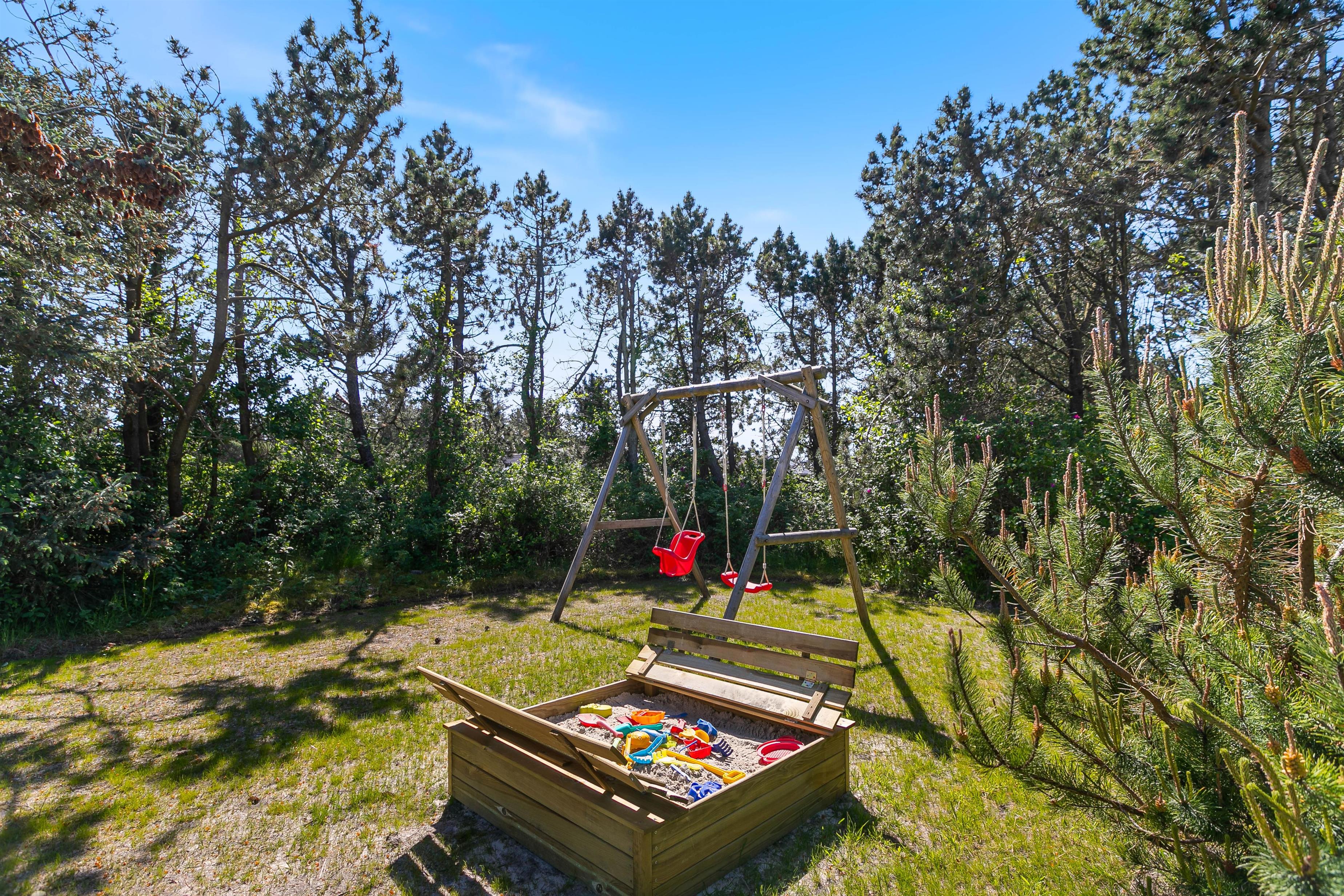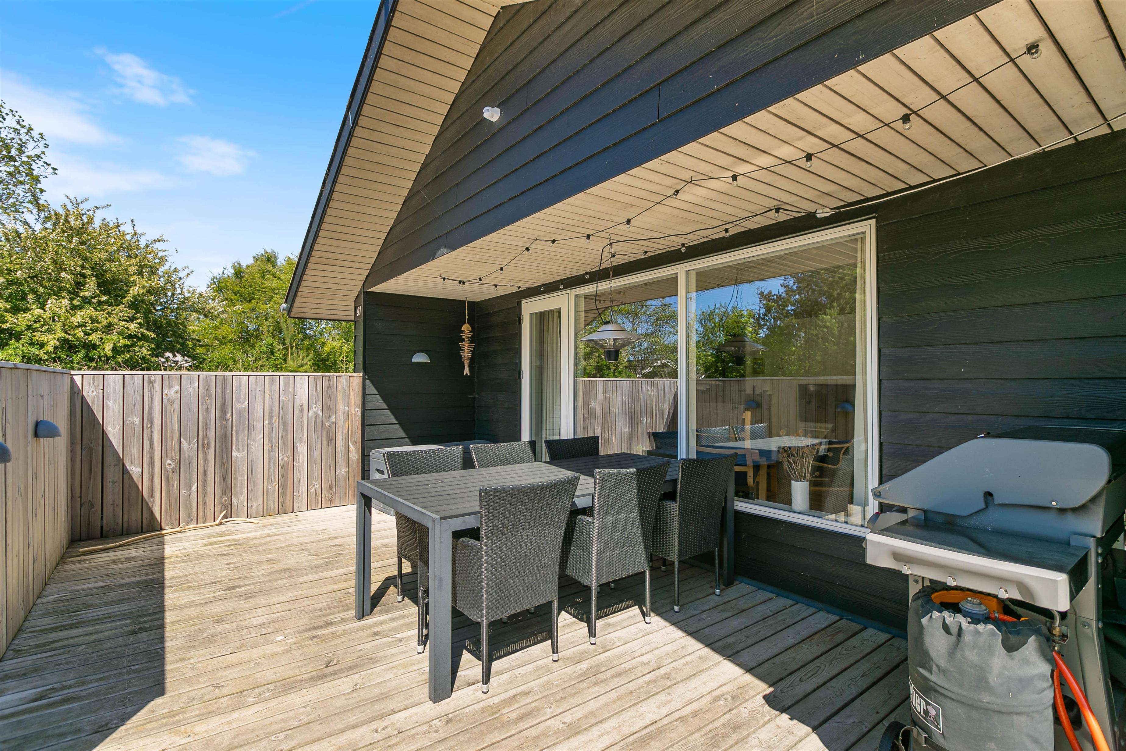 Terrassen er afskærmet, delvist overdækket og helt uforstyrret. Den er udstyret med havemøbler, liggestole og gasgrill. På grunden er der god plads til leg og boldspil - Til familiens yngste er der både sandkasse og gyngestativ.