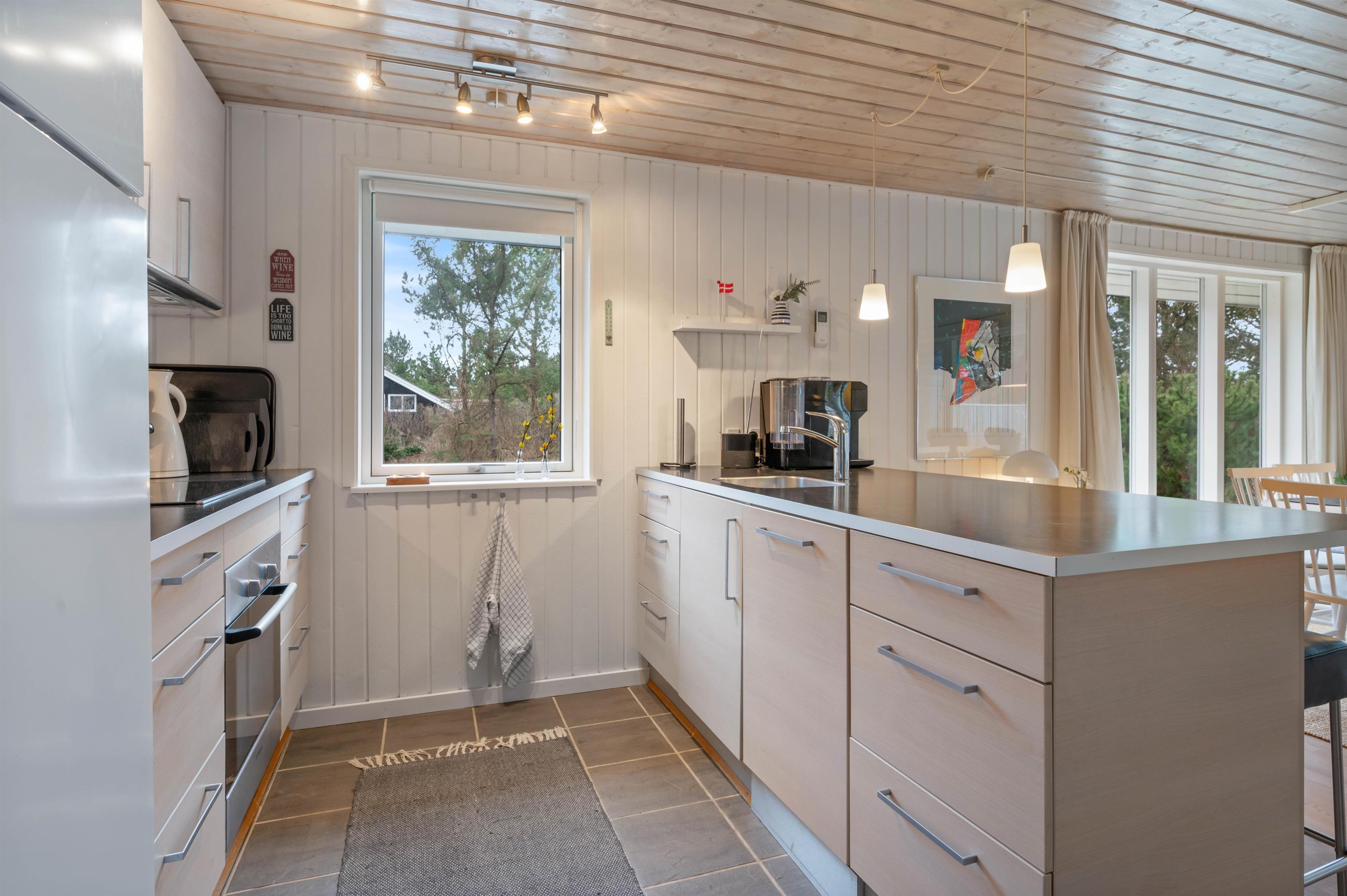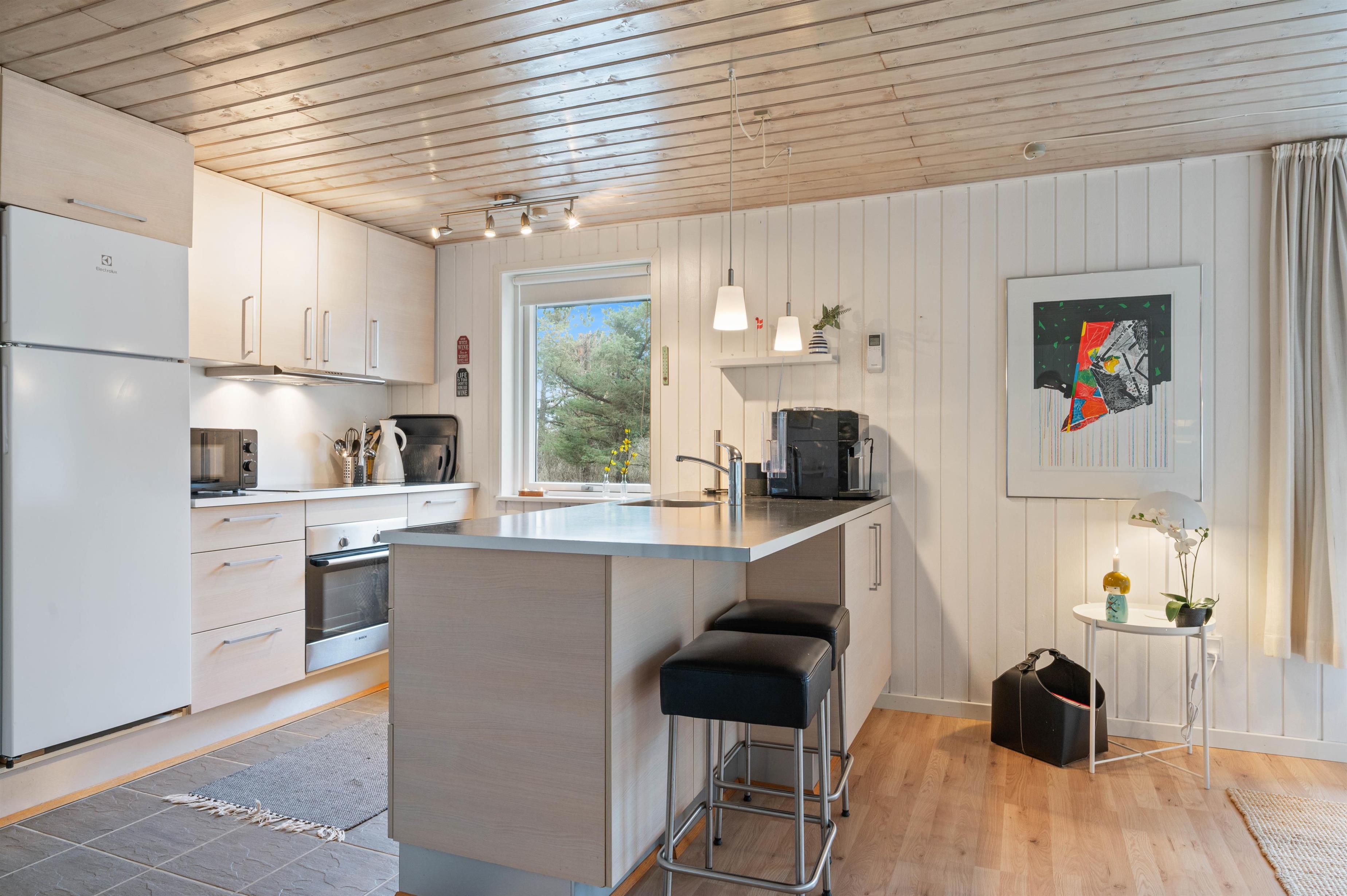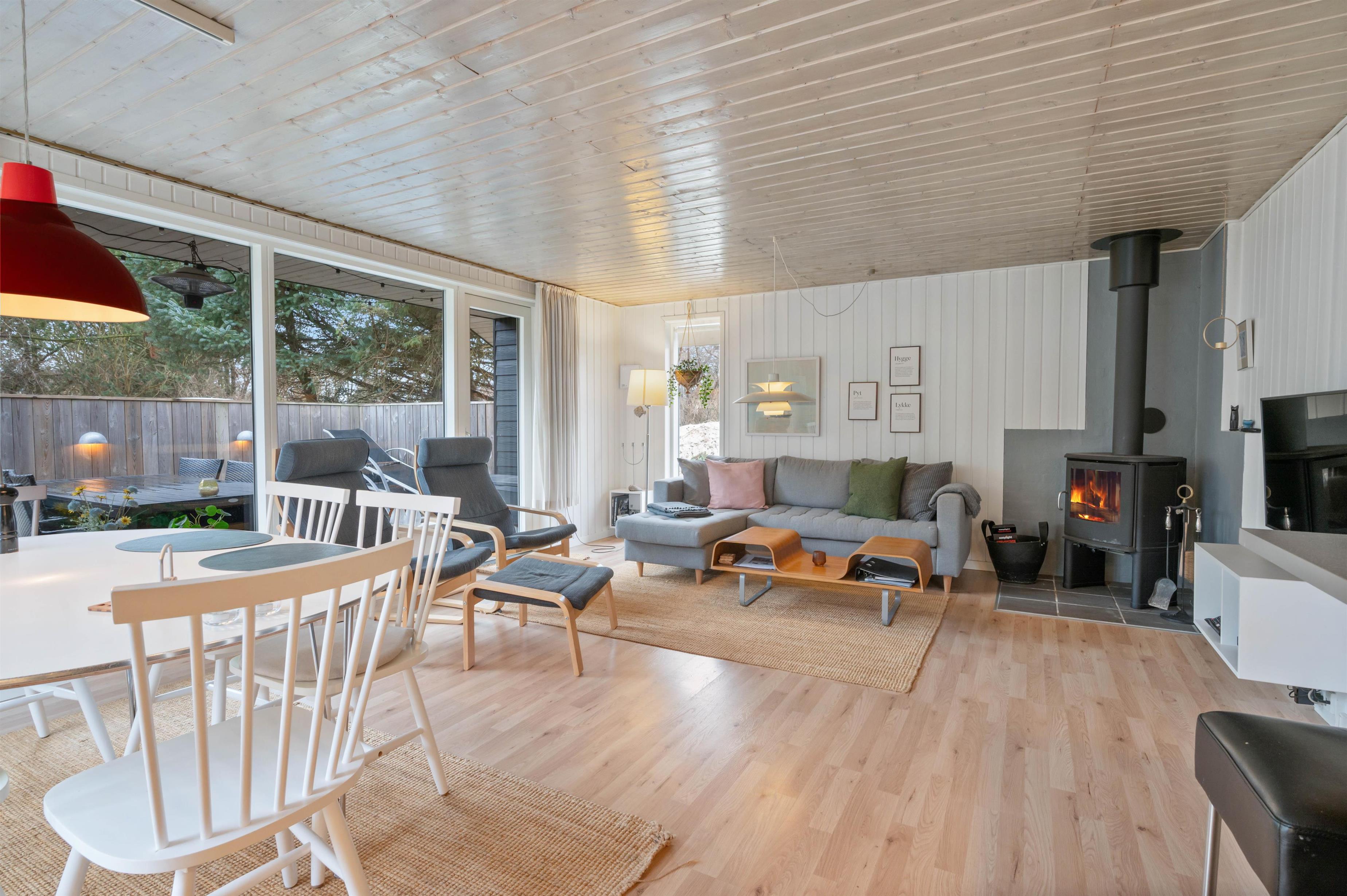 Sommerhusets køkken har alt i hårde hvidevarer, f.eks. opvaskemaskine og fryser. Stuen er hyggeligt indrettet med komfortable møbler, hvorfra i kan nyde varmen fra den knitrende brændeovn. I sommerhuset er der en energibesparende varmepumpe, som I med fordel kan benytte jer af.