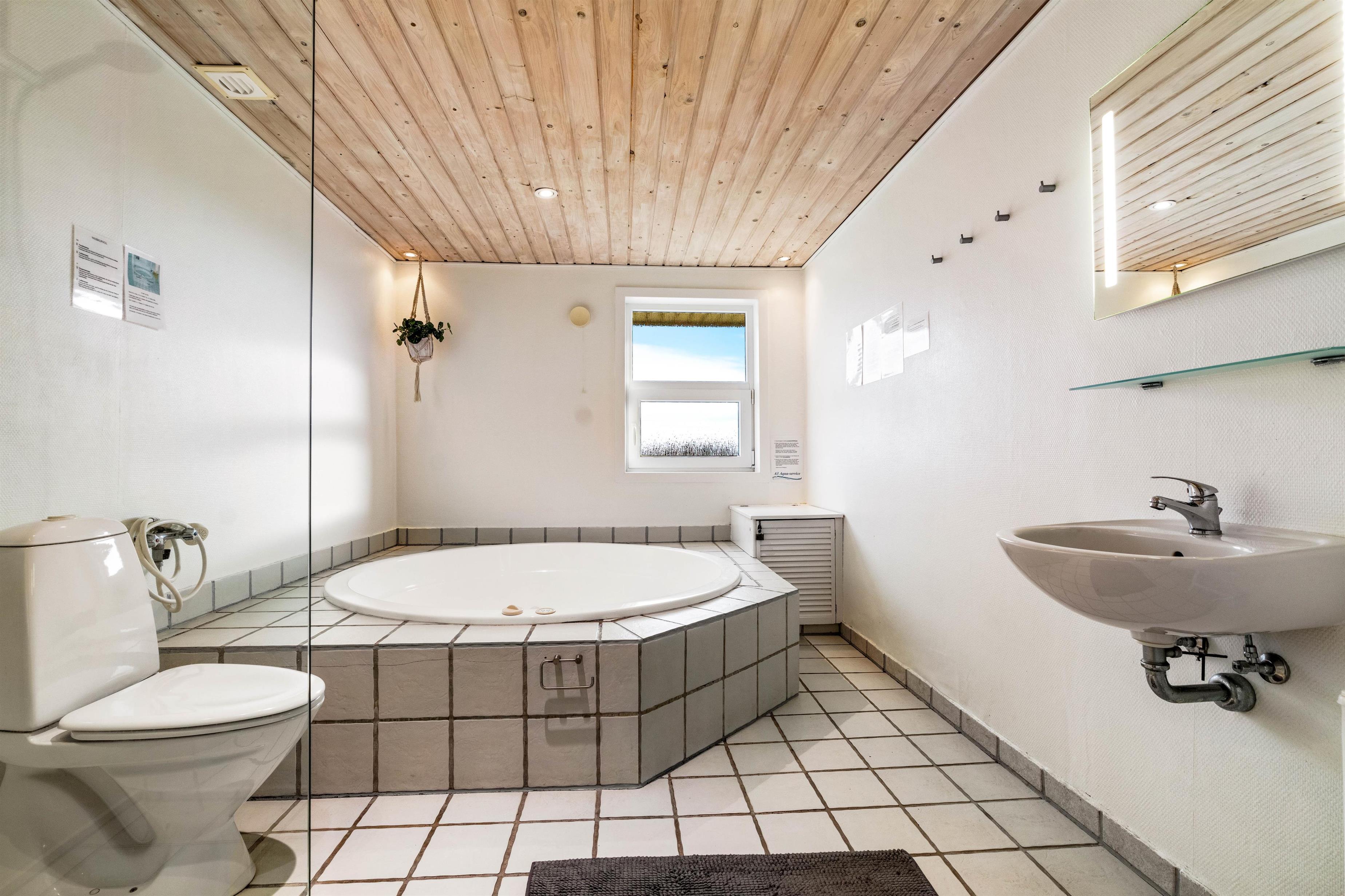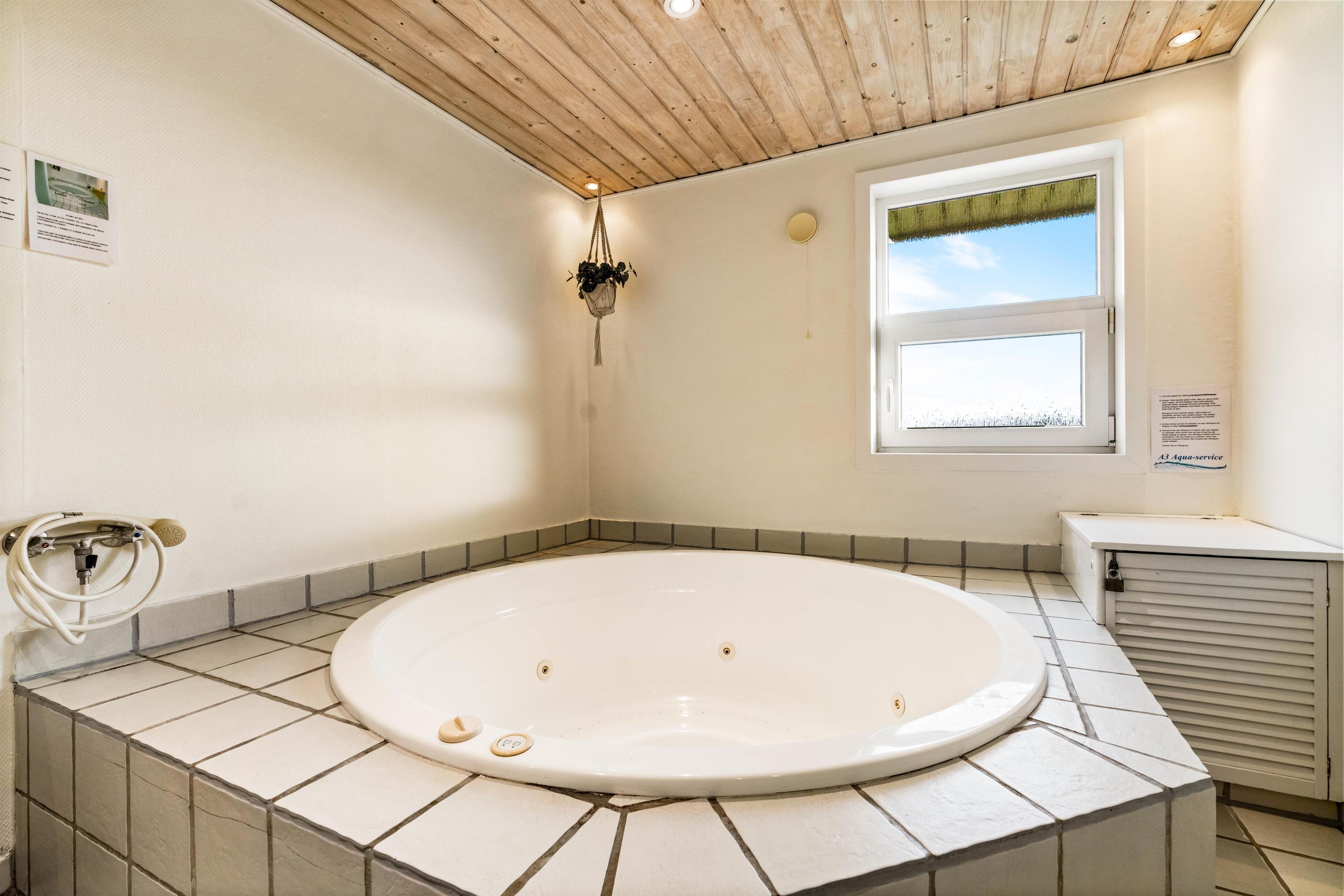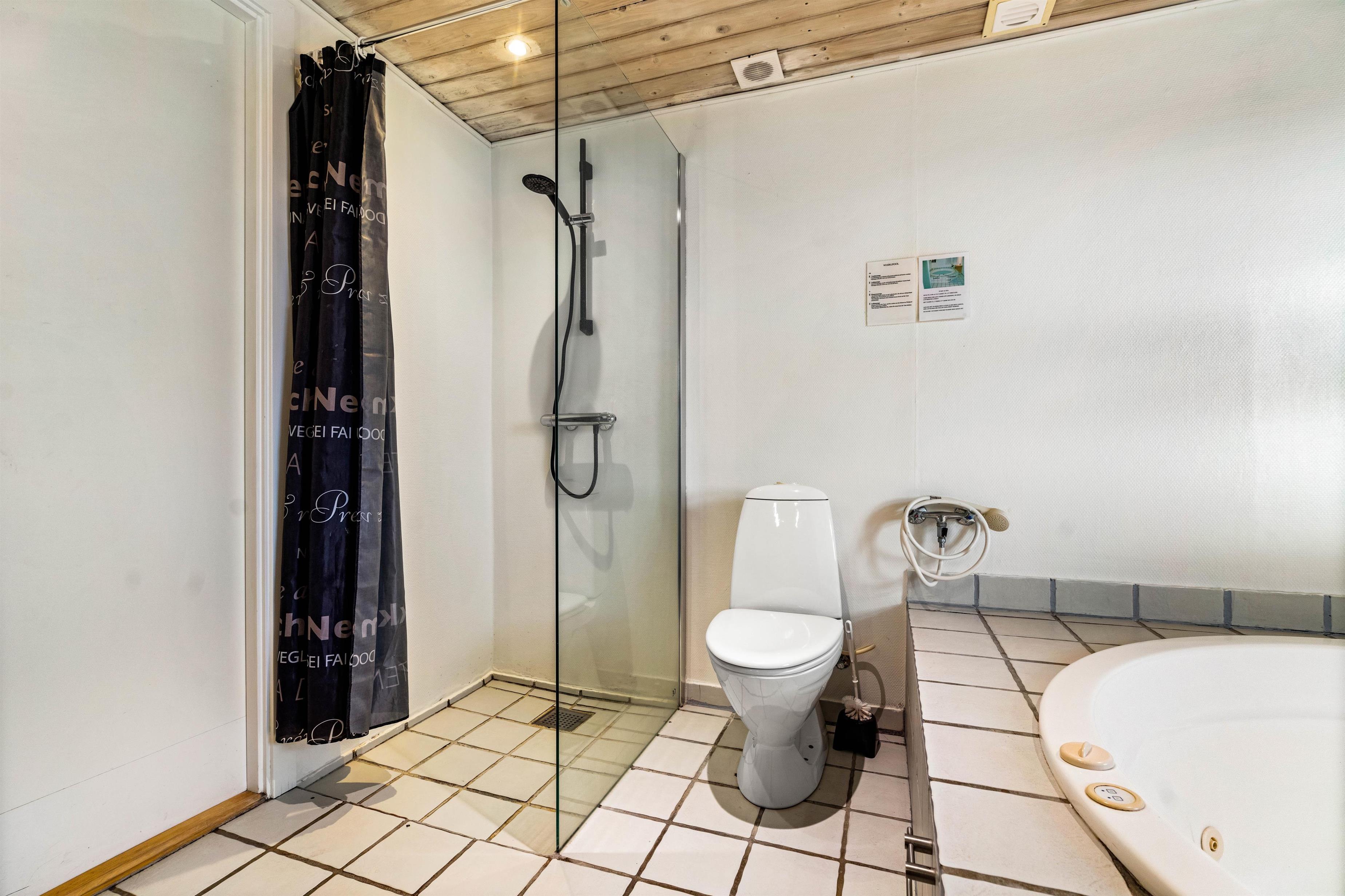 På det store badeværelse er der installeret et stort standvands spabad med plads til fire personer, så I her rigtig kan hygge jer eller lade børnene boltre sig i de varme bobler. Sommerhuset har også en god sauna, så der er rig lejlighed til at forkæle jer selv og slappe helt af.