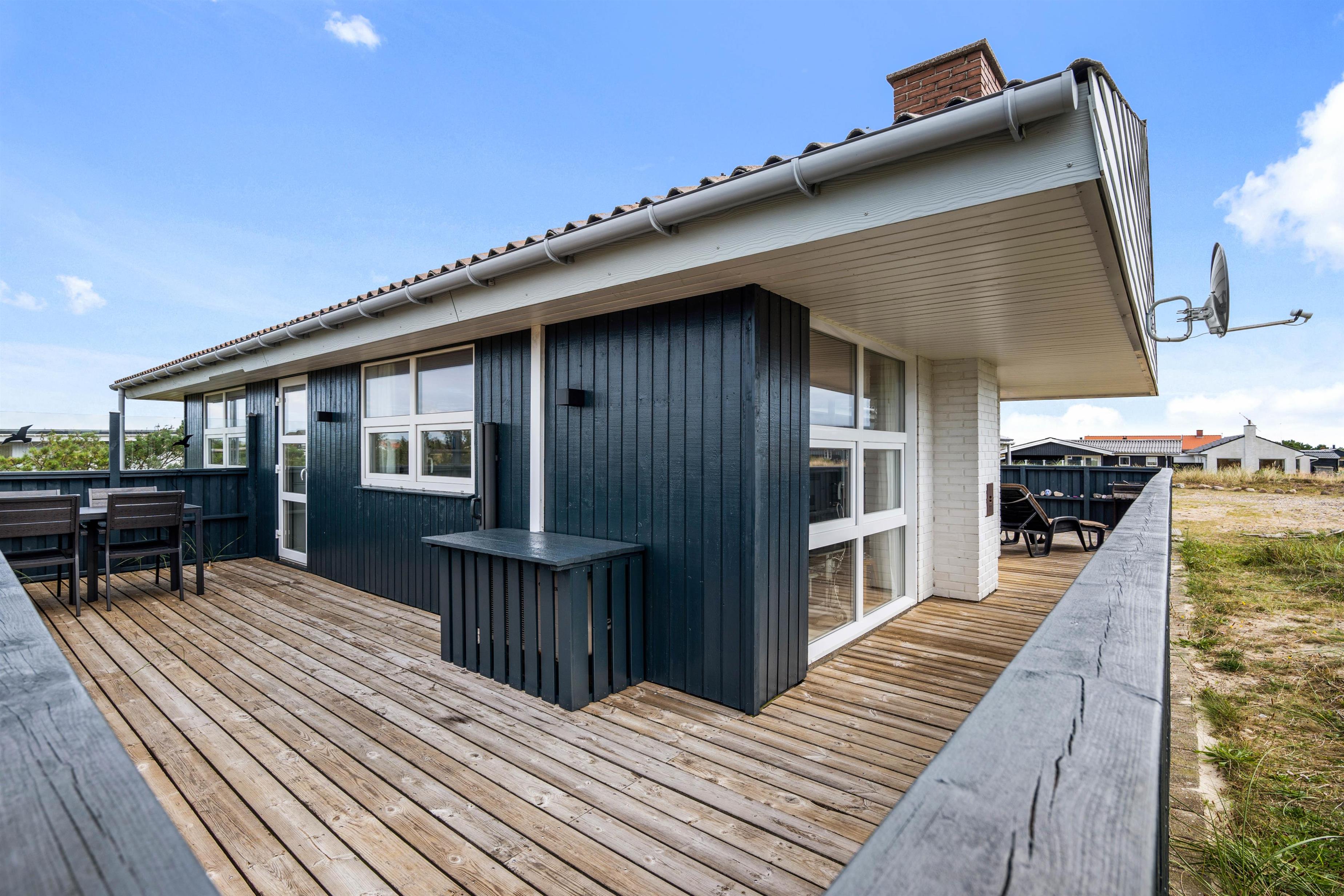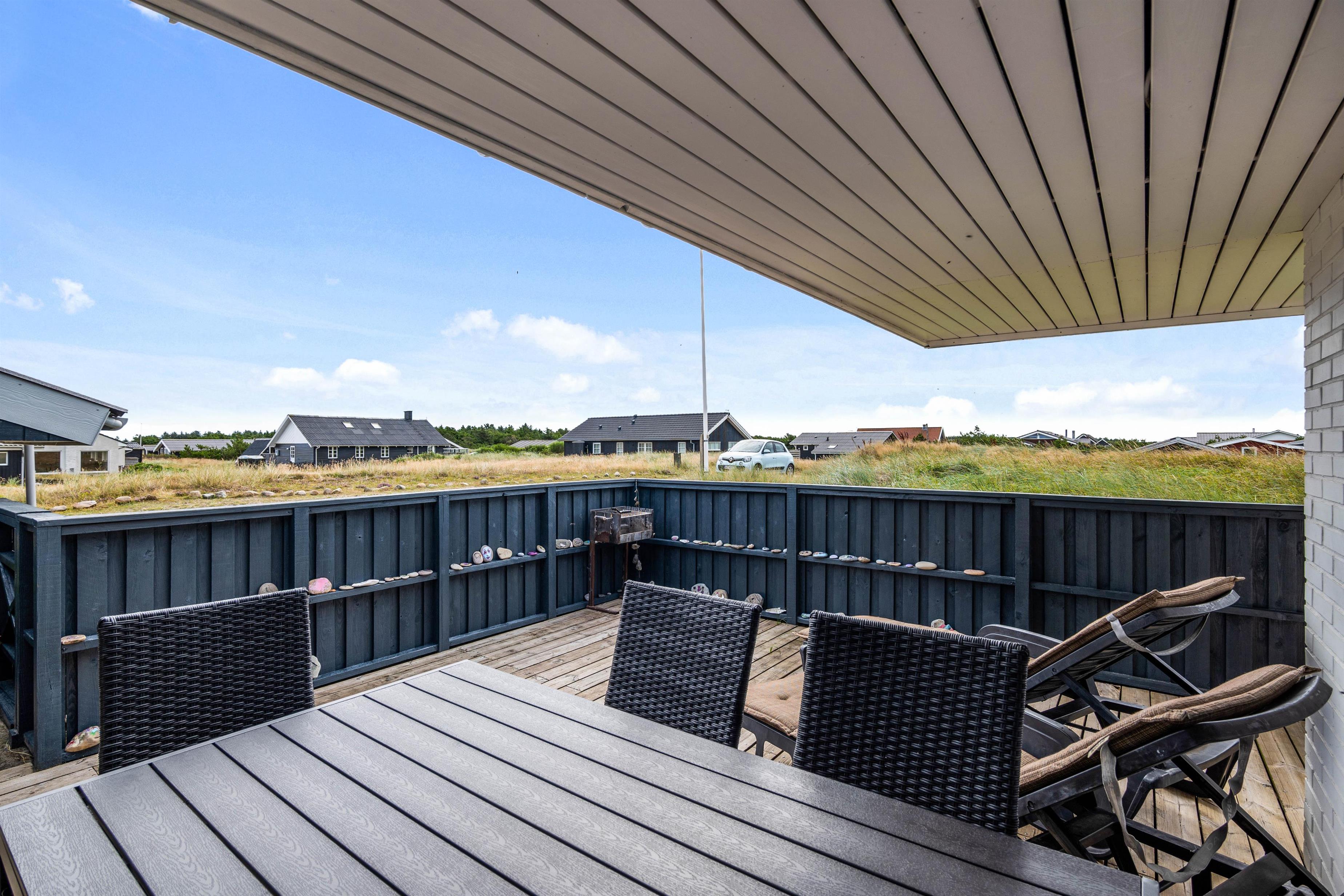 Terrassen er dejlig stor, så der er god plads til både solbadning og grillhygge. Og da terrassen strækker sig omkring sommerhuset, kan man flere steder finde god læ. Og skulle det danske sommervejr blive drilsk, kan man sætte sig under terrassens overdækning, og stadig nyde den friske luft på terrassen.
