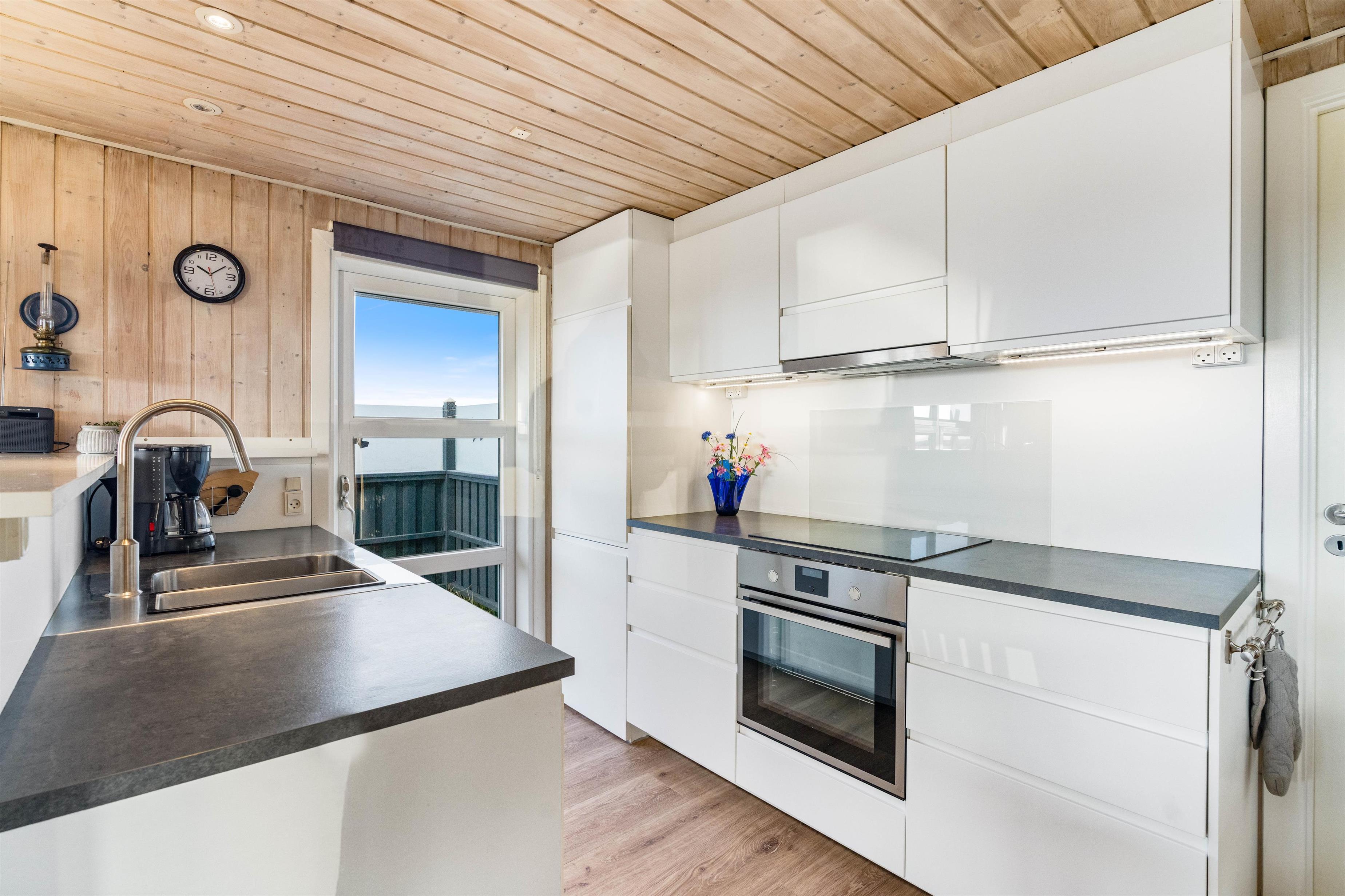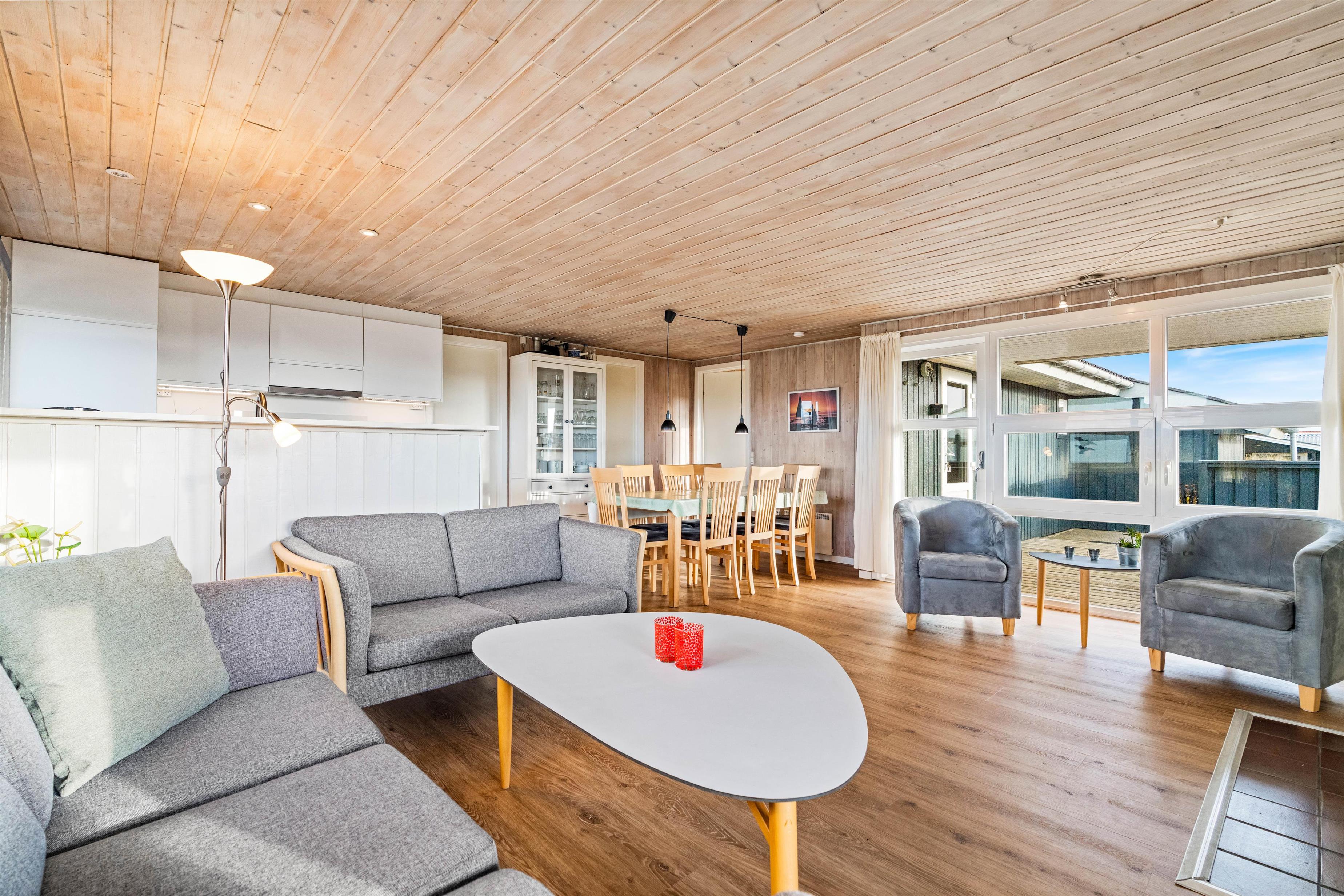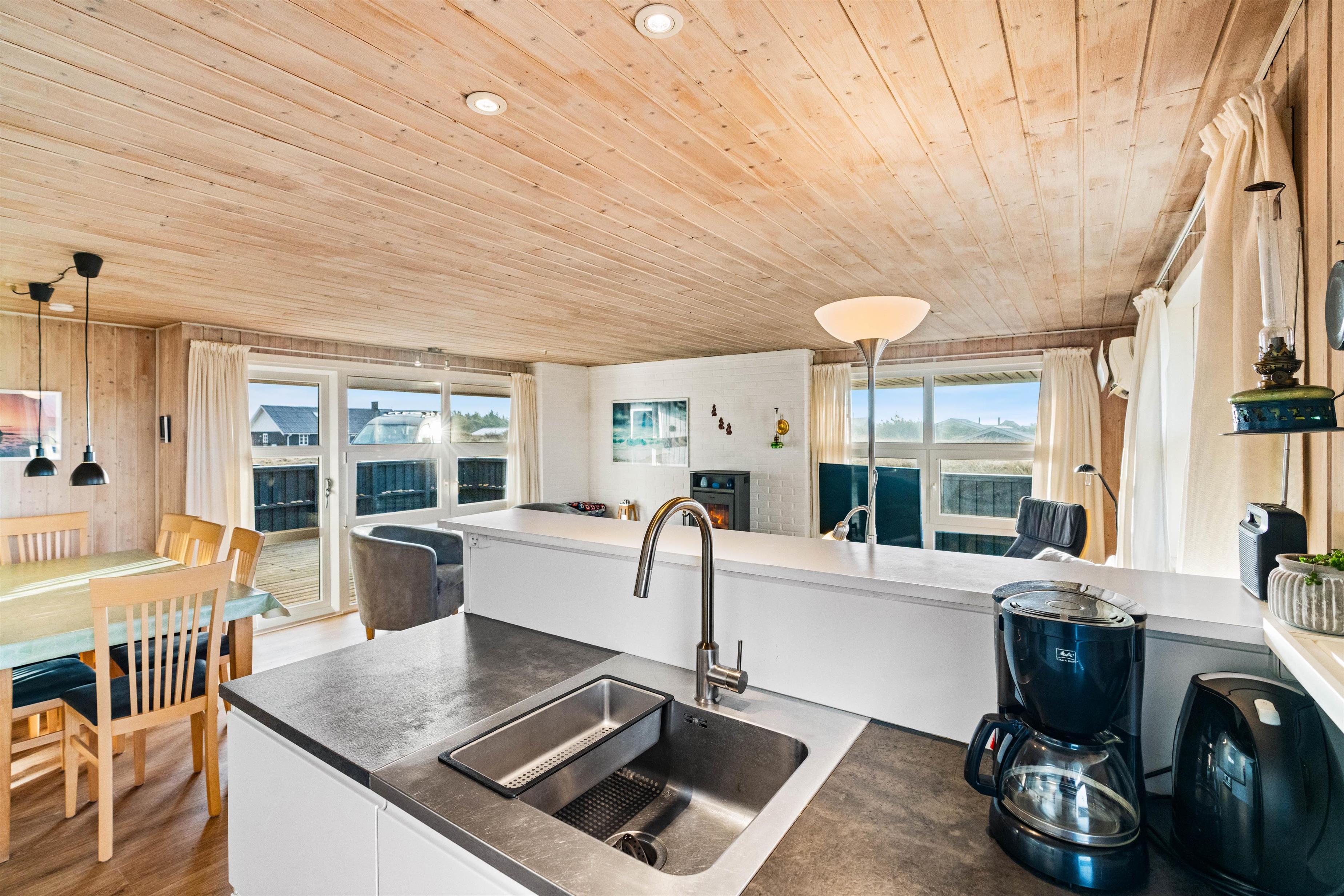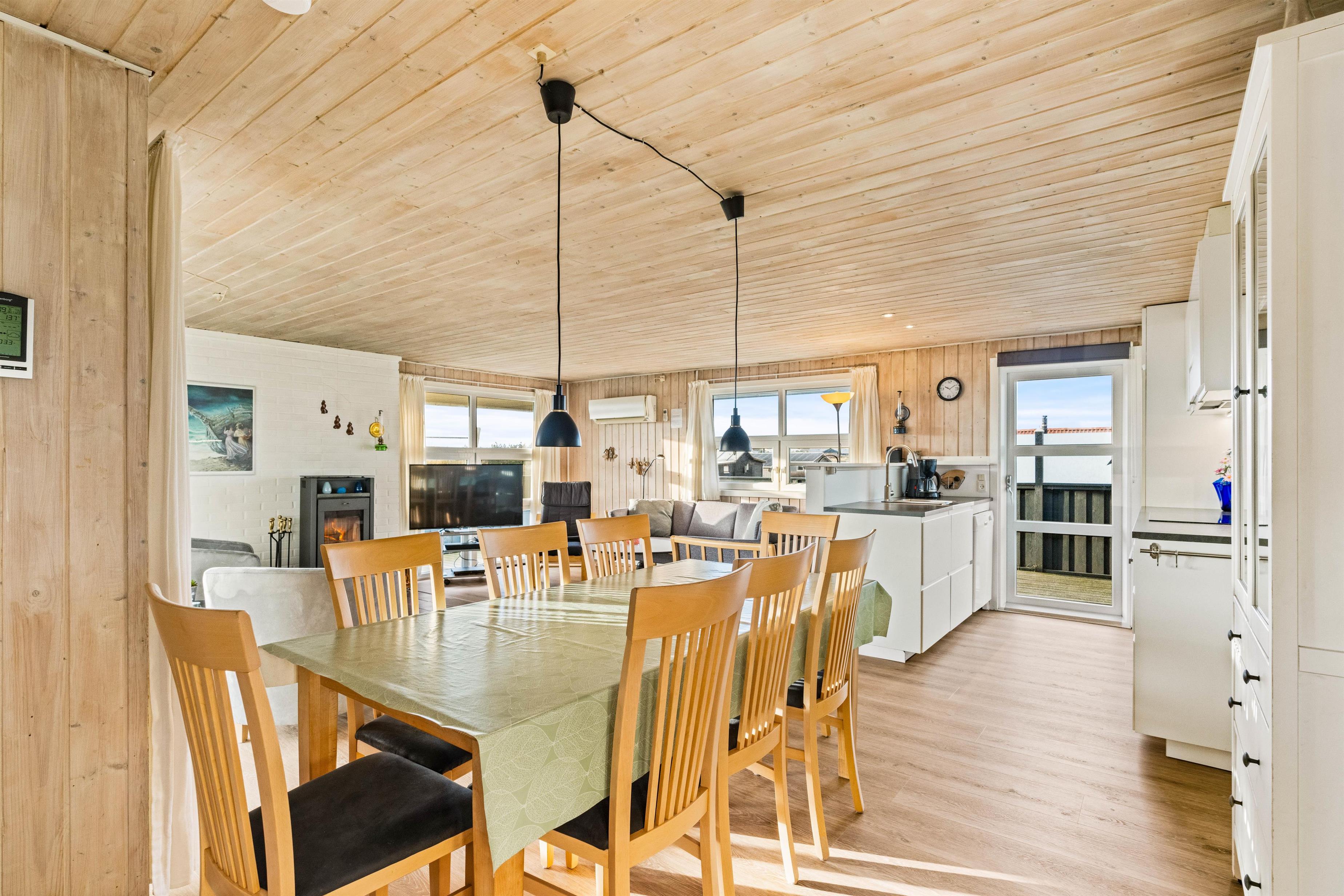 Sommerhuset er velholdt, hyggeligt og godt indrettet med brændeovn, så der er plads til selv den store familie og to hunde.