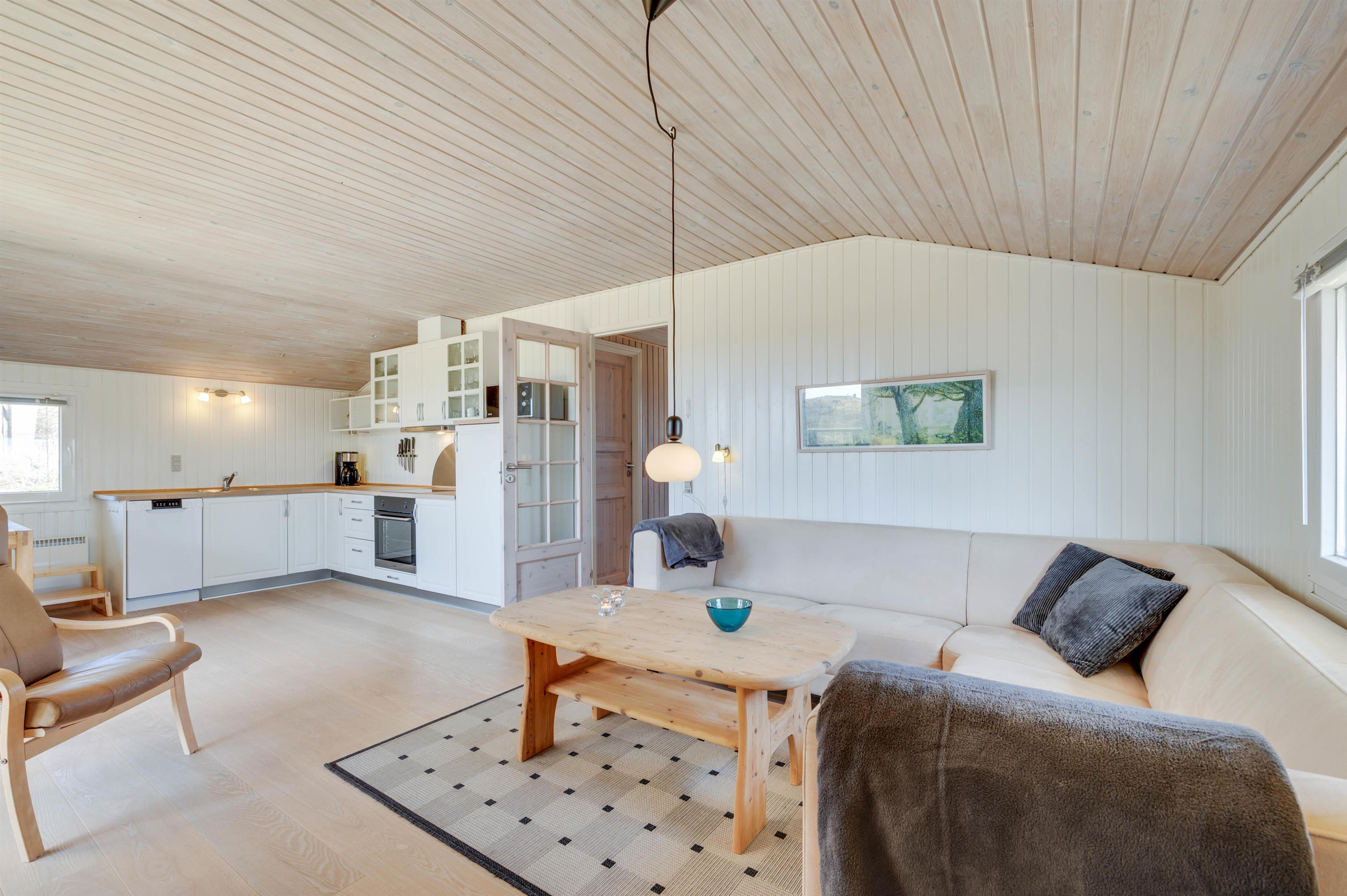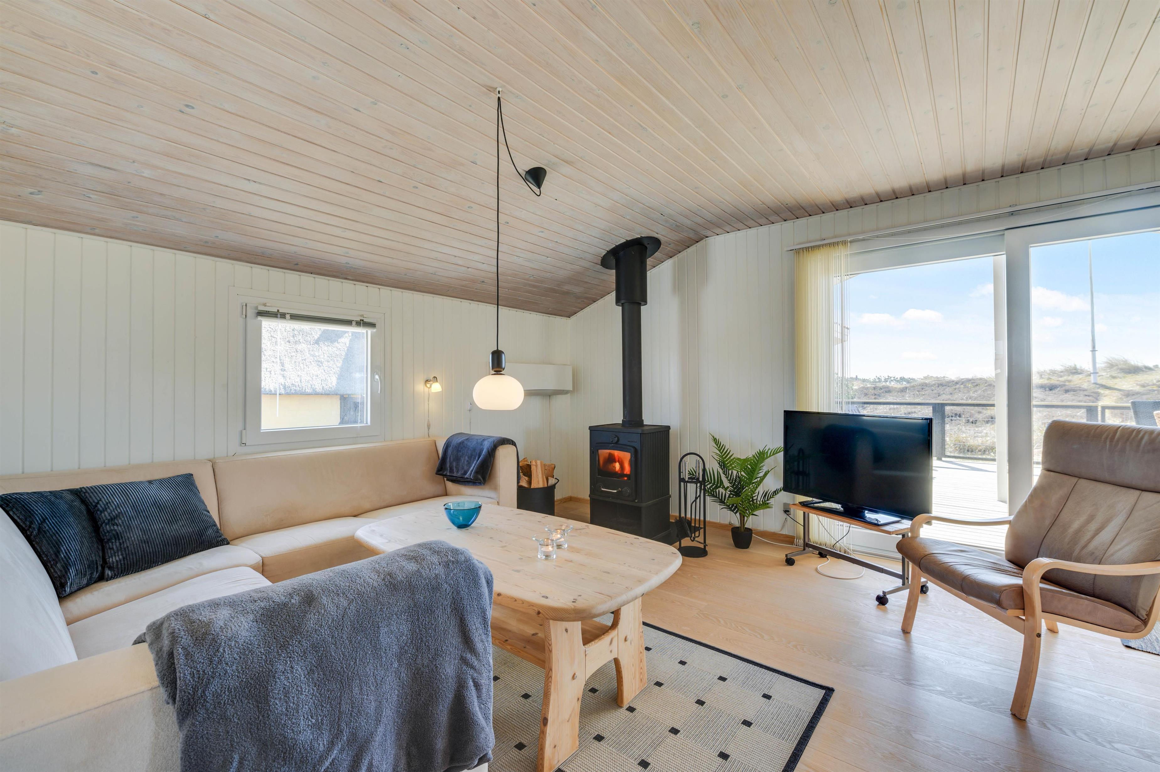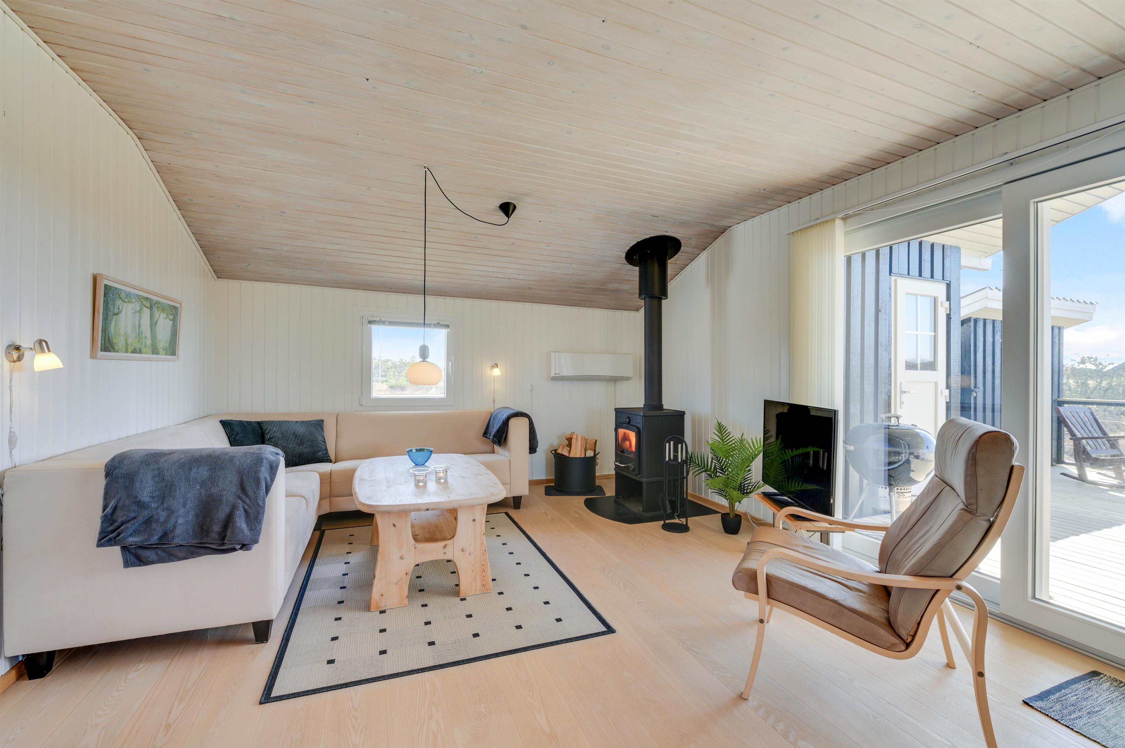 Sommerhusets samlingspunkt er stuen, som ligger i direkte forbindelse med køkkenet. Her kan I have mange hyggelige stunder med jeres nærmeste. Feriestemningen kommer helt i top, når der tændes op i brændeovnen. Den giver både varme og skaber ekstra hygge. I stuen er der en varmepumpe, som I med fordel kan bruge, og på badeværelset er der gulvvarme.
