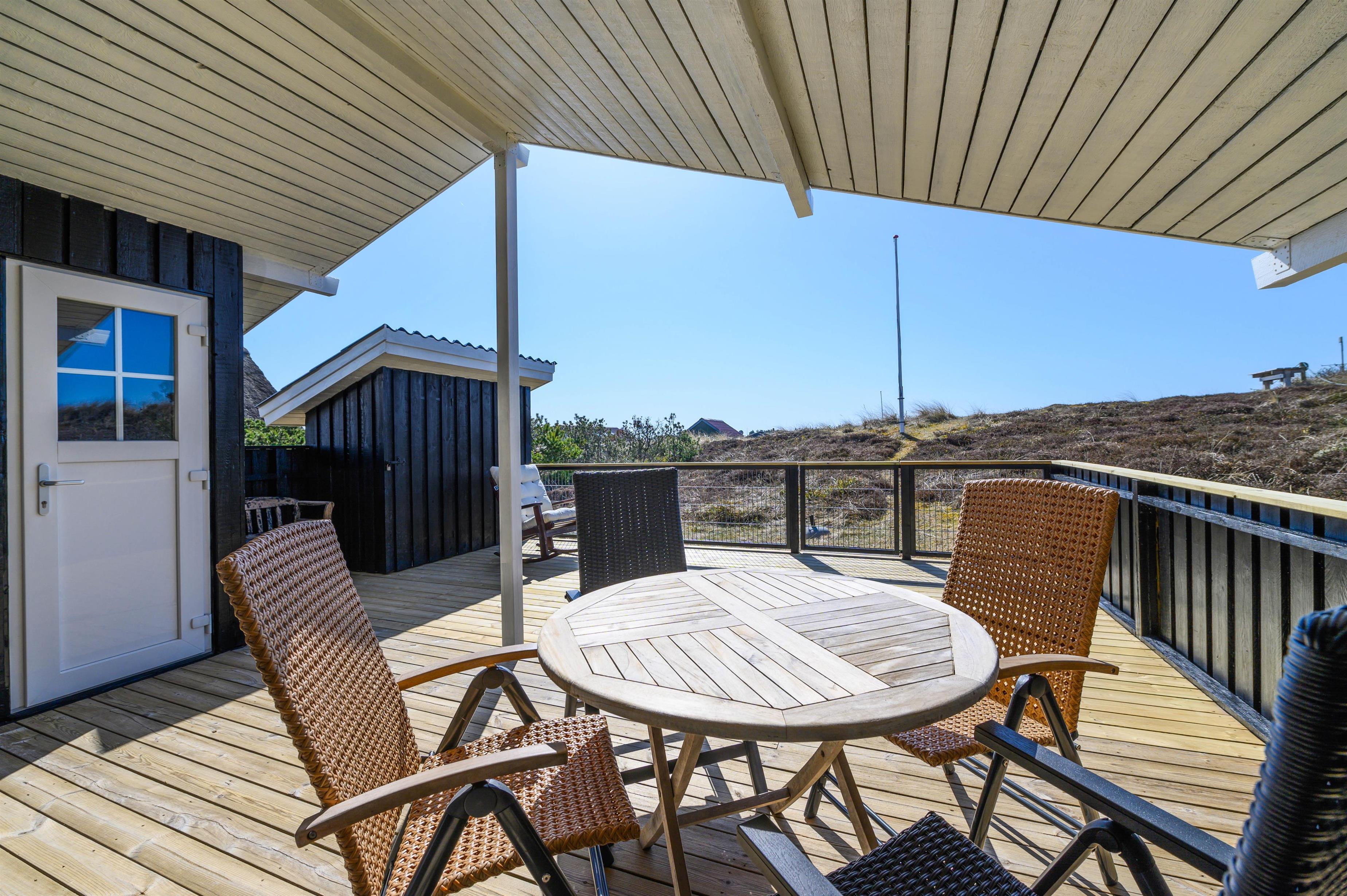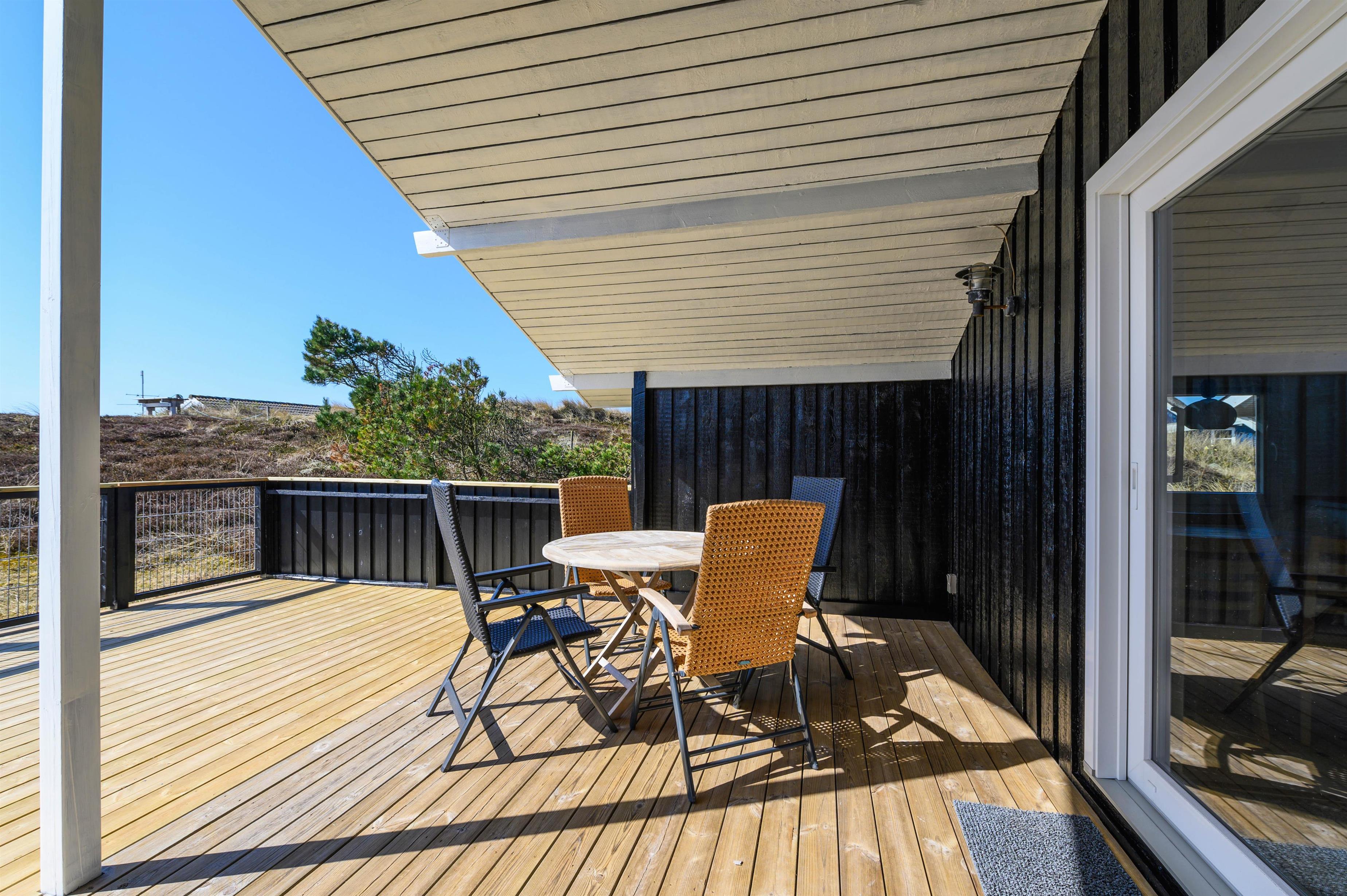 Fra opholdsrummet kan I gå ud på den skønne sydvendte terrasse, hvorfra I har en fin udsigt til naturen. Her kan I sidde i ly for vind og vejr; den er nemlig afskærmet og delvist overdækket. Her kan hunden også gå frit, da terrassen er lukket.