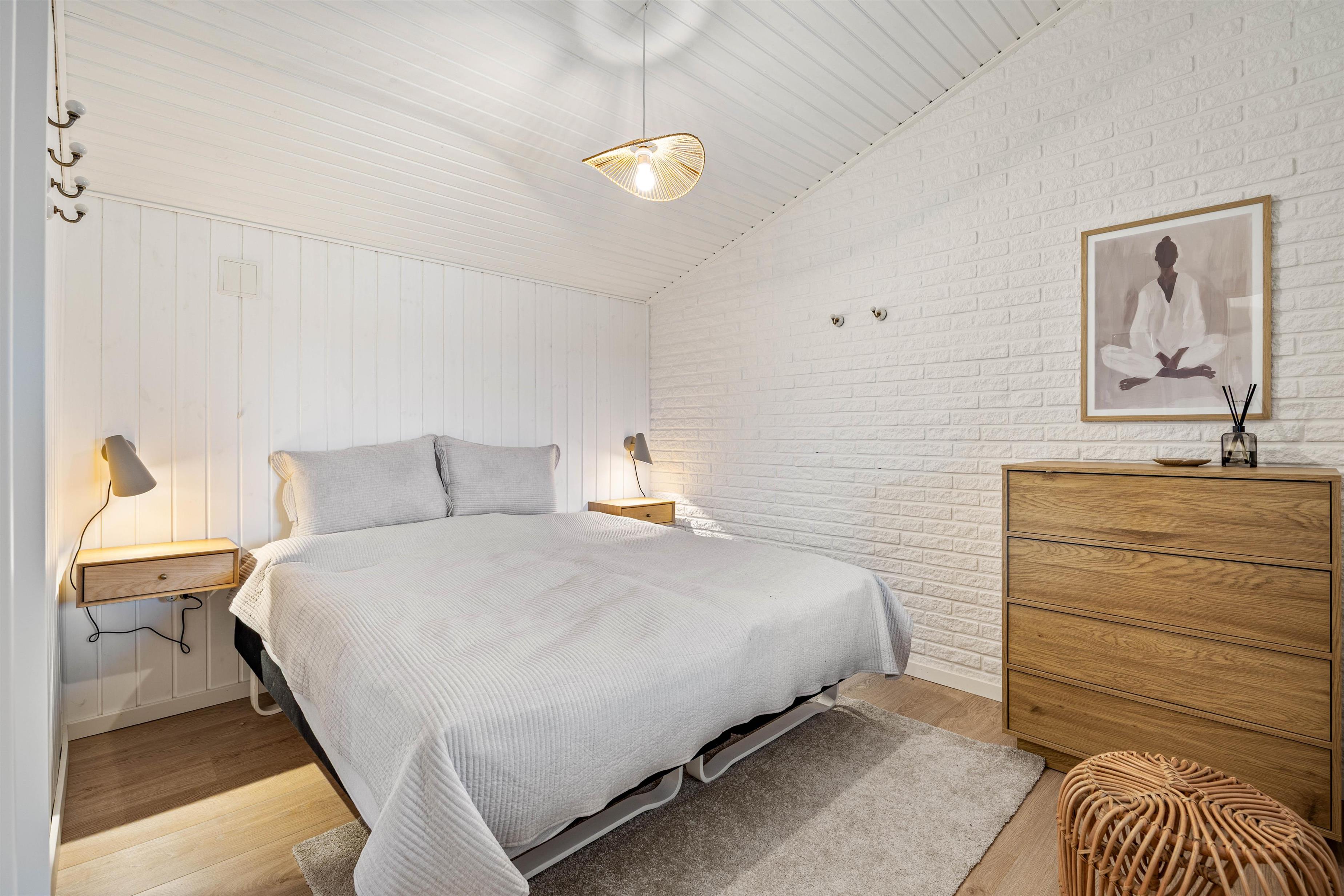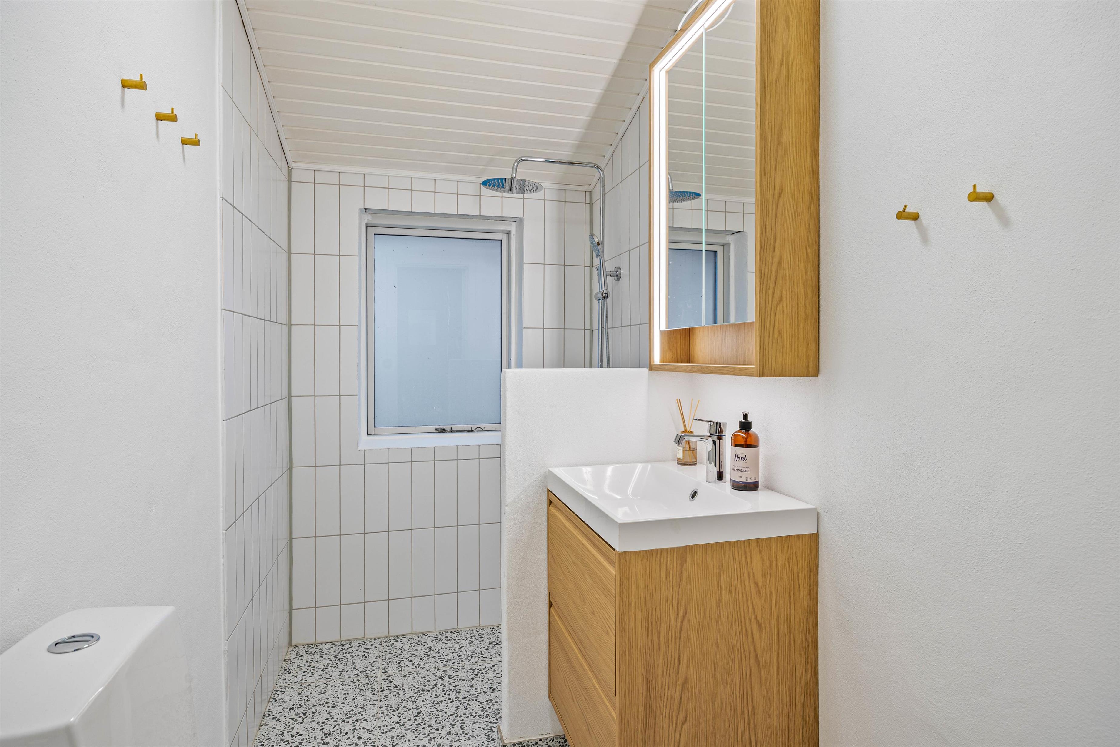 Badeværelset er udstyret med gulvvarme, hvilket giver ekstra komfort året rundt. En energibesparende varmepumpe bidrager til et behageligt indeklima, uanset årstid, og gør opholdet både komfortabelt og praktisk.