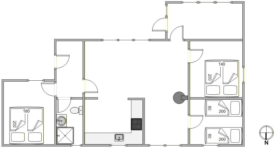 Feriehuset rummer med sine 78 kvadratmeter 3 soveværelser, som sikrer jer fleksible sovemuligheder og god nattesøvn. 2 soveværelser er indrettet med en dobbeltseng og i det sidste værelse finder I 2 enkeltsenge.