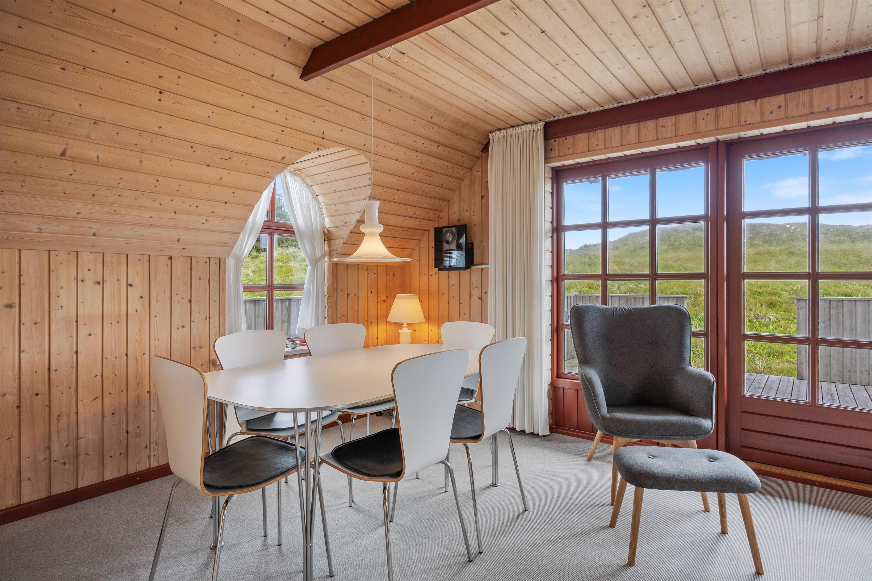 Indenfor mærker man straks feriestemningen med den knitrende ild i brændeovnen. Det store vinduesparti giver et fint lysindfald og åbner op for panoramaudsigten over det omkringliggende klitlandskab. Varmepumpen sikrer et behageligt indeklima året rundt, mens du hygger dig i sofaen.