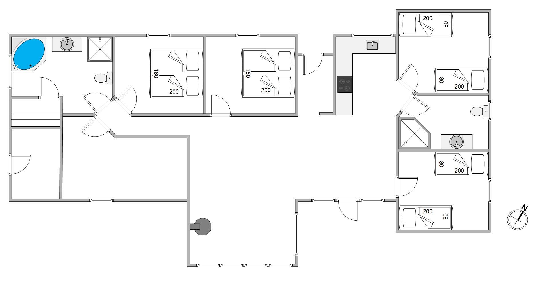 Sommerhusets 8 sovepladser er fordelt på 4 gode soveværelser, hvoraf de 2 er indrettet med dobbeltsenge. På de sidste 2 soveværelser finder i 2 enkeltsenge i hver.