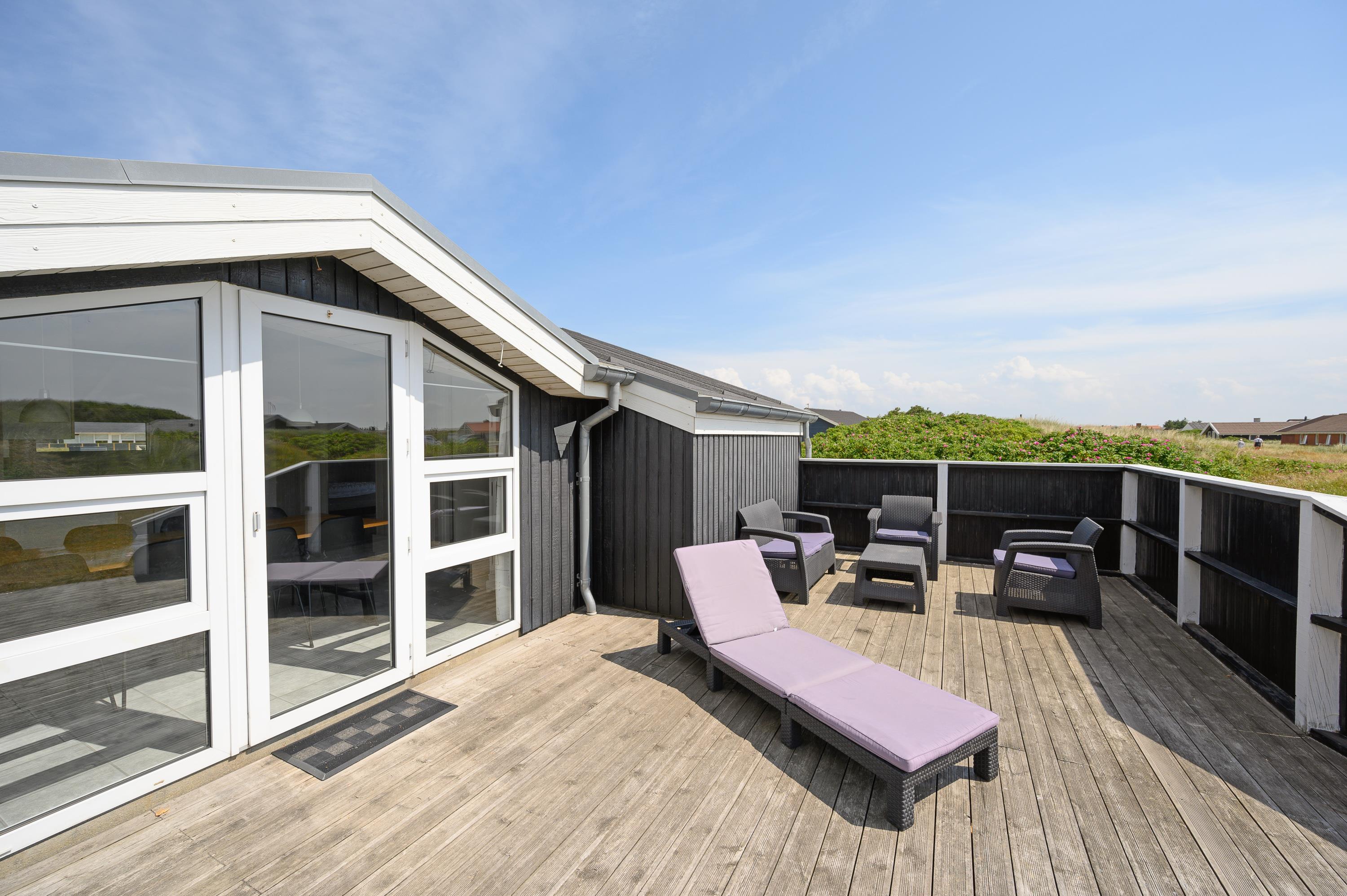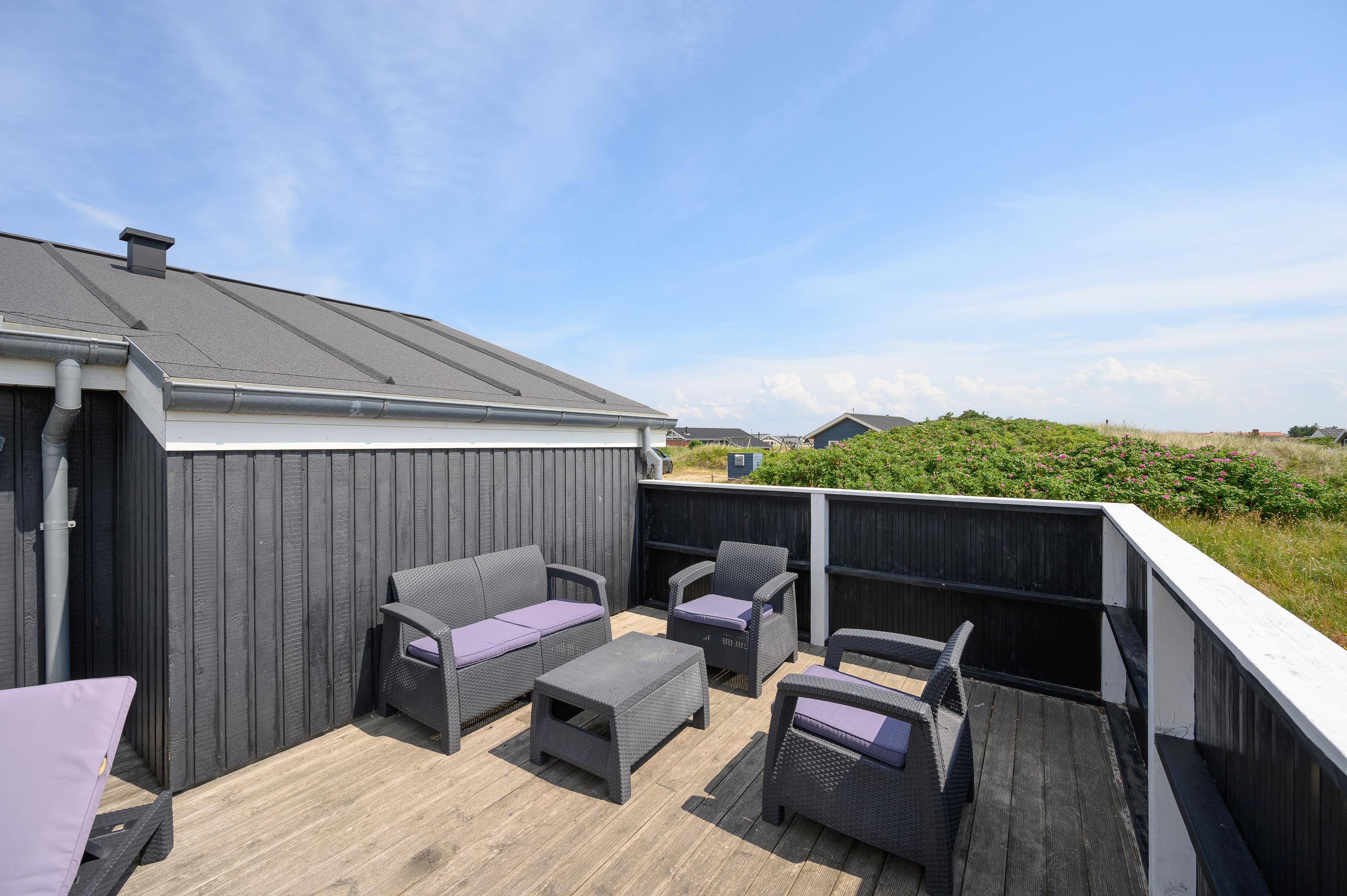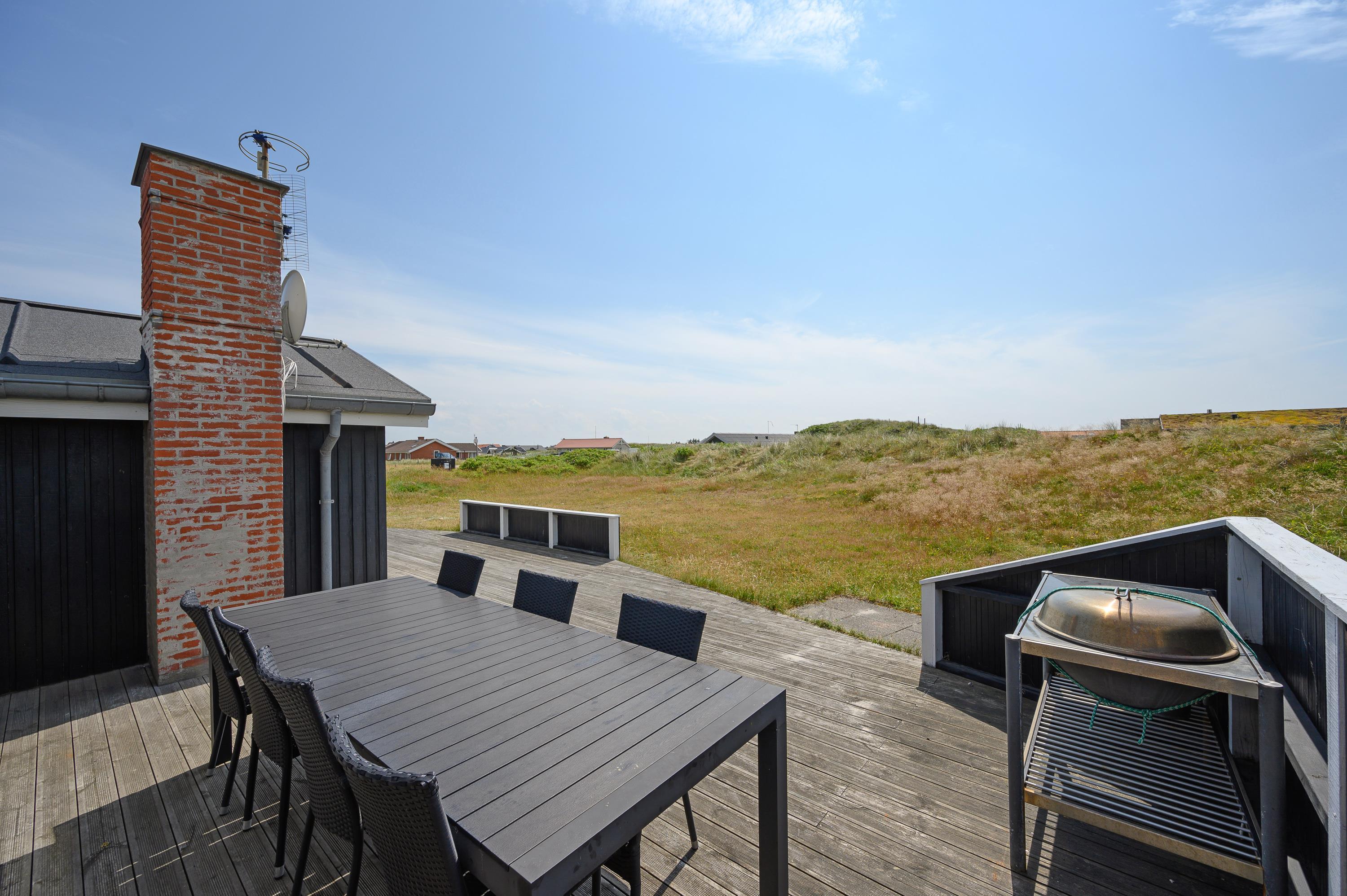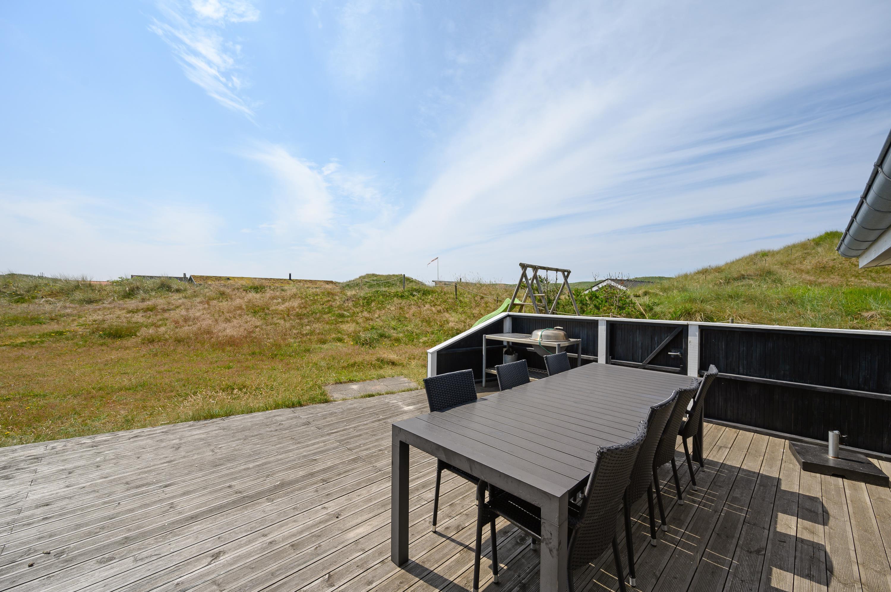 Sommerhuset ligger på en skøn naturgrund, og fra opholdsrummet er der direkte udgang til den sydvendte træterrasse. Her kan sommersolen nydes, mens børnene leger ved sandkassen eller gyngestativet. En oplevelsesrig dag kan afsluttes med en hyggelig grillaften i den friske havluft, mens solen går ned bag klitterne.