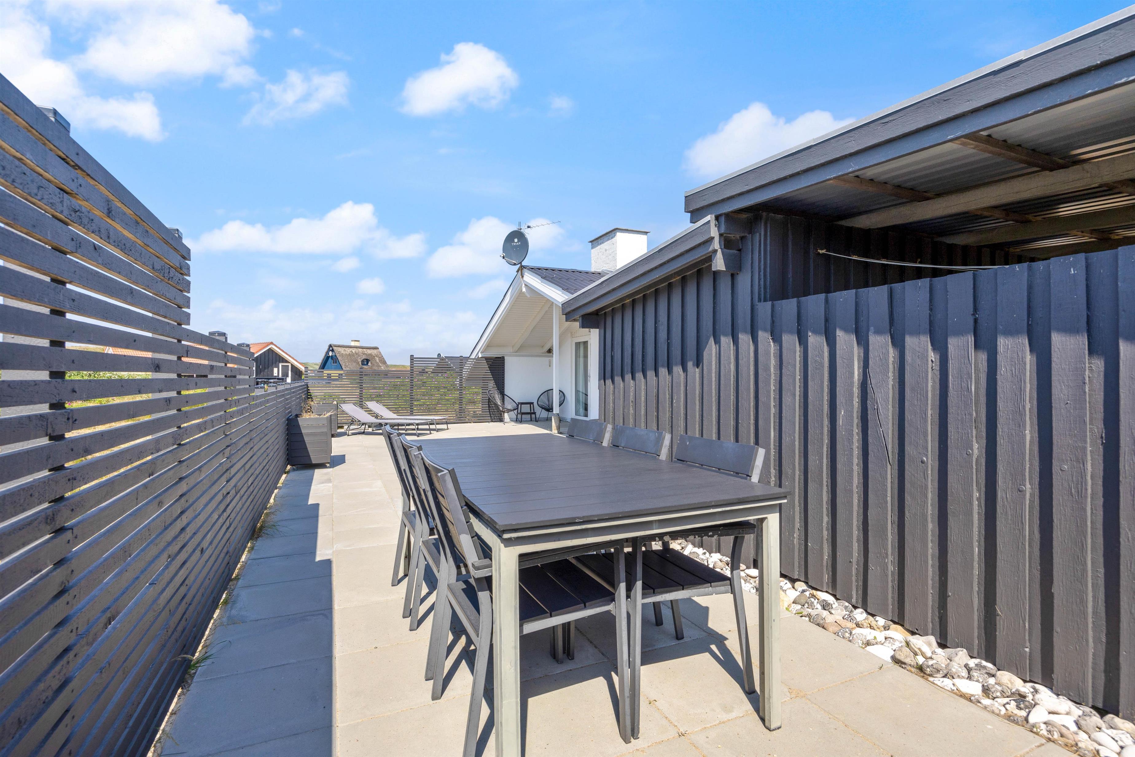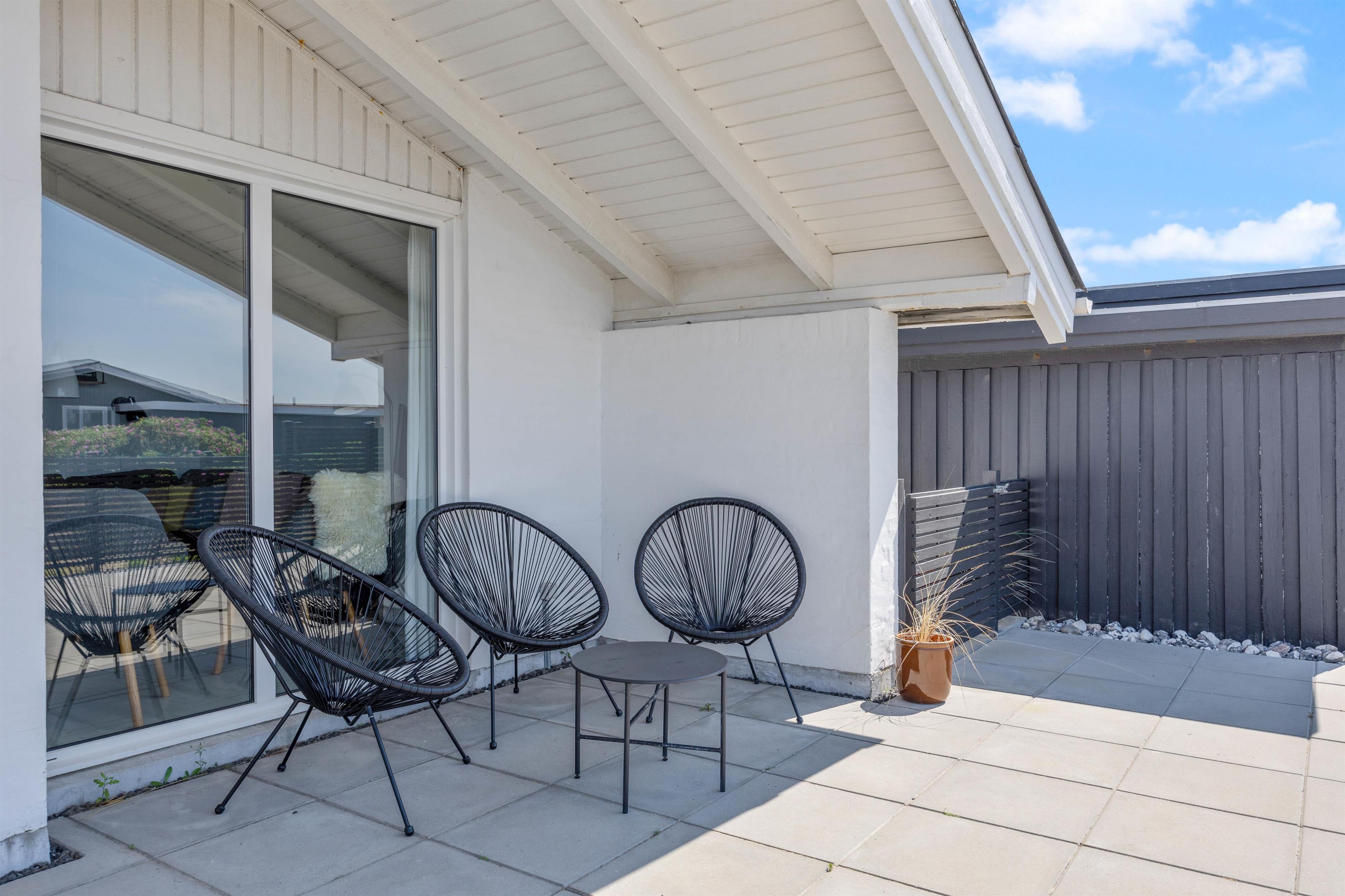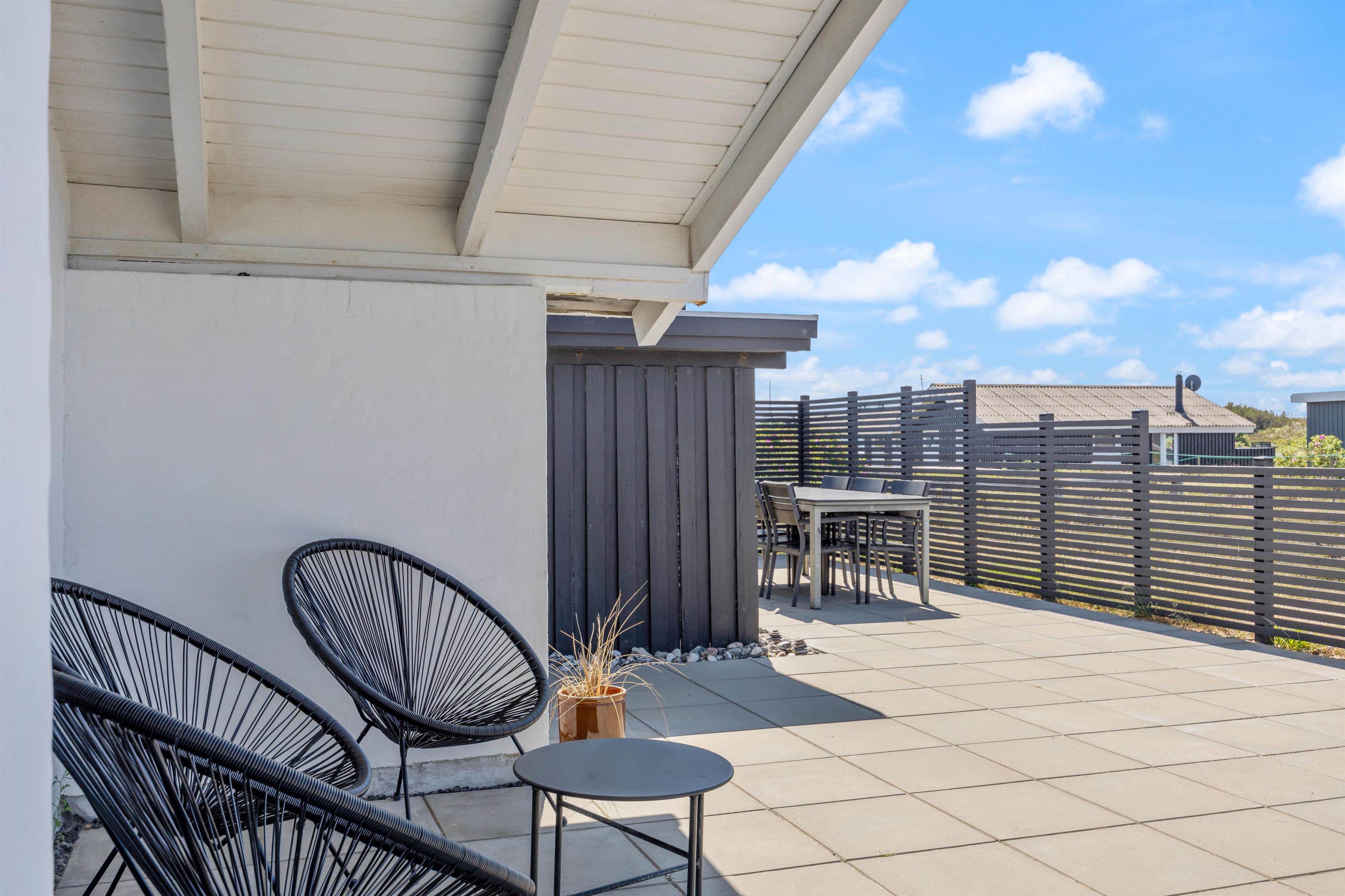 Den store lukkede terrasse mod syd udgør hele 70m², så den er helt perfekt til familier, der har småbørn eller måske en hund med på ferie. Terrassen er delvist overdækket og har mange ugenerte og hyggelige kroge, hvor der er rig mulighed for at finde både læ og sol hele dagen, afhængigt af ens ønsker og behov. Desuden er den ideel til hyggelige grillaftener, og der er gode havemøbler, liggestole og grill.