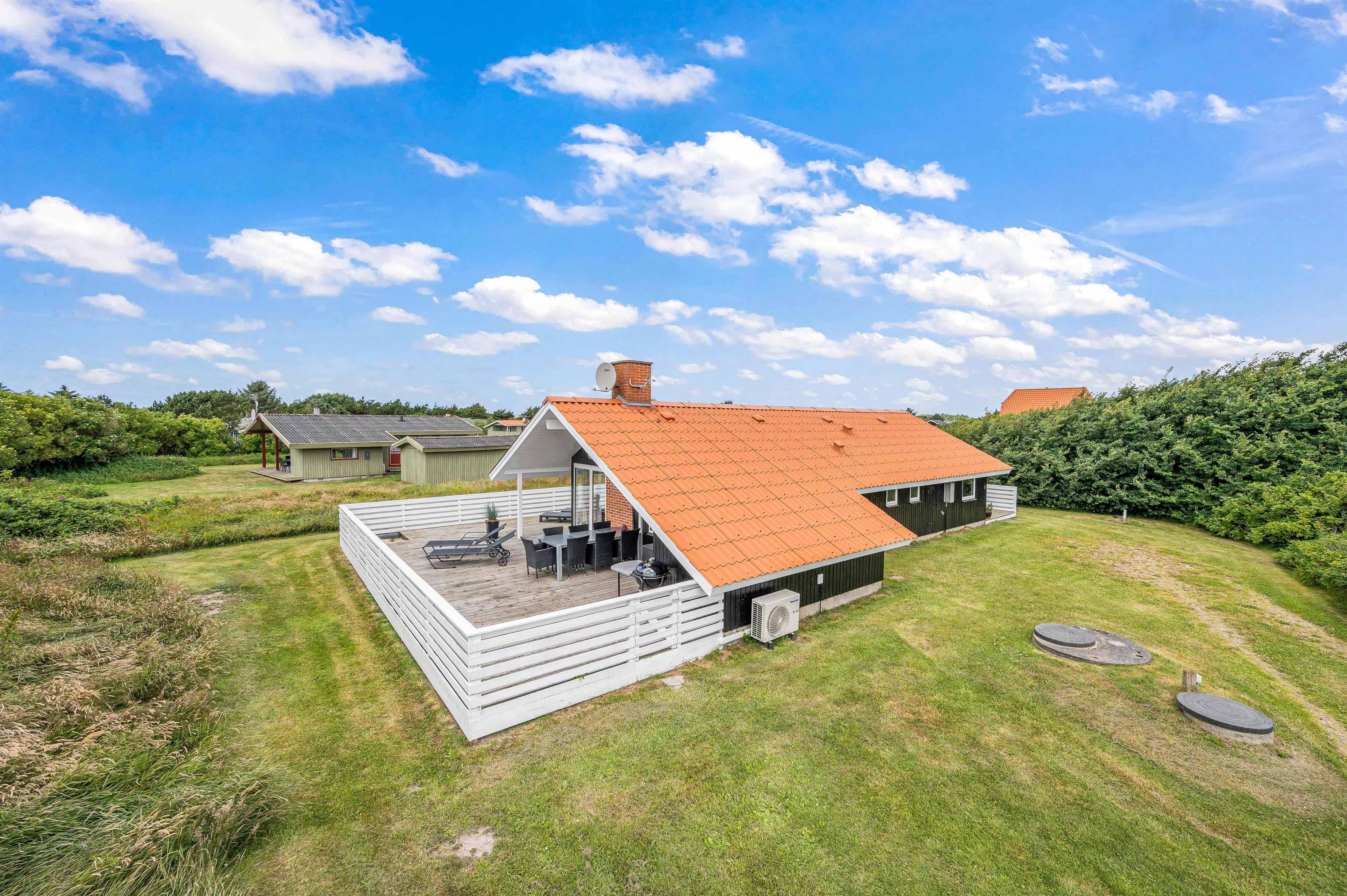Den store lukkede terrasse er placeret mod syd og sydvest. Den er delvist overdækket og er ideel til hyggelige grillaftener. Terrassen er særdeles børnevenlig og derfor helt ideel, hvis I har mindre børn med. Mod nord er der også en skøn terrasse, der er velegnet til brug i formiddagstimerne. Der er 1 kilometer til hav og strand og kun 400 meter til nærmeste købmand.