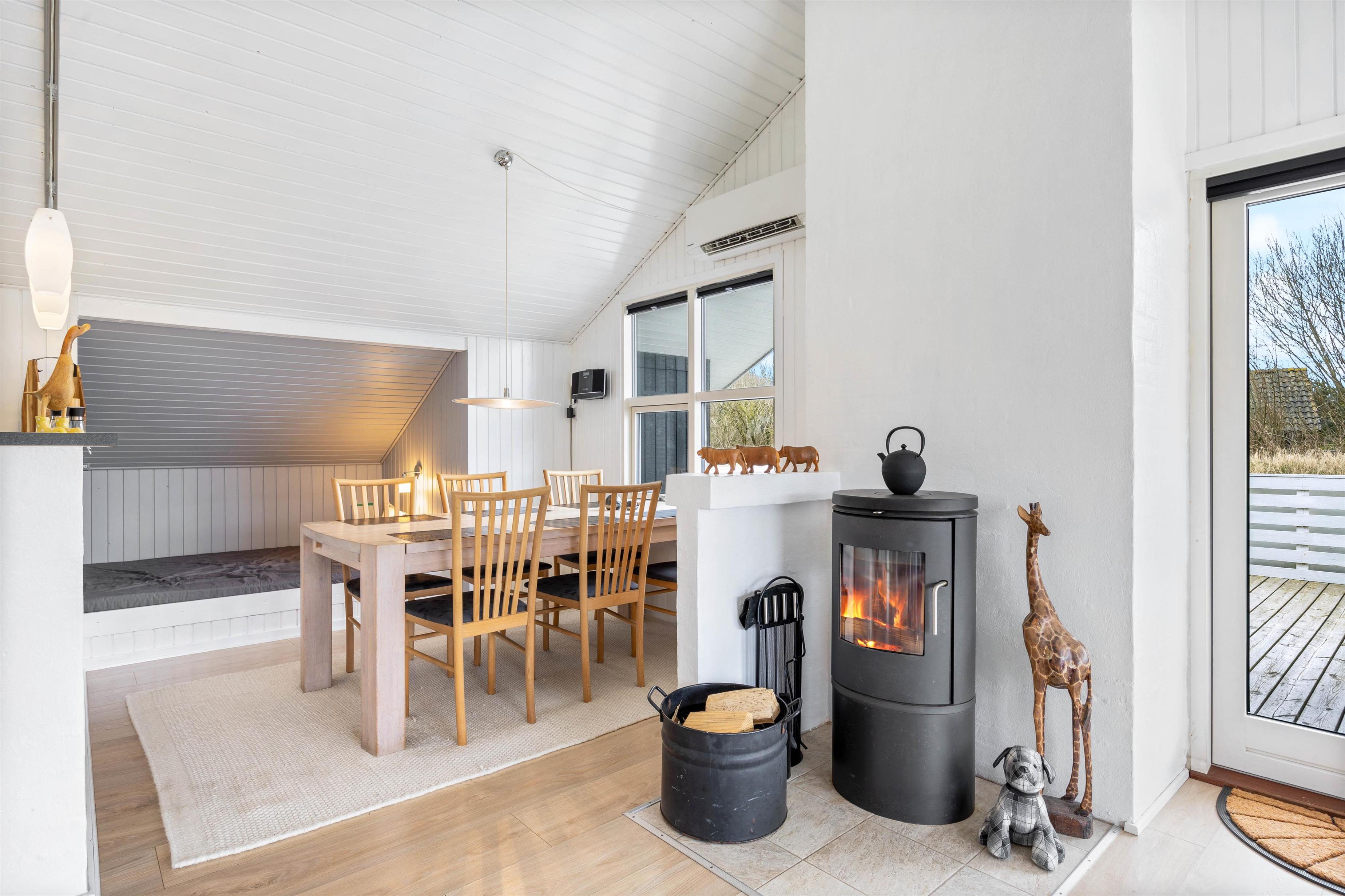 Sommerhuset fremstår lyst og indbydende, og der er trælofter til kip i stue og køkken. Køkkenet er godt indrettet med bl.a. opvaskemaskine, mikroovn og en fryser på 50 L. Stuen ligger i forbindelse med køkkenet, det er velmøbleret og med trælaminat på gulvene. Desuden er der en hyggelig alkove, brændeovn, en fladskærm, DVD og gratis fibernet.