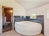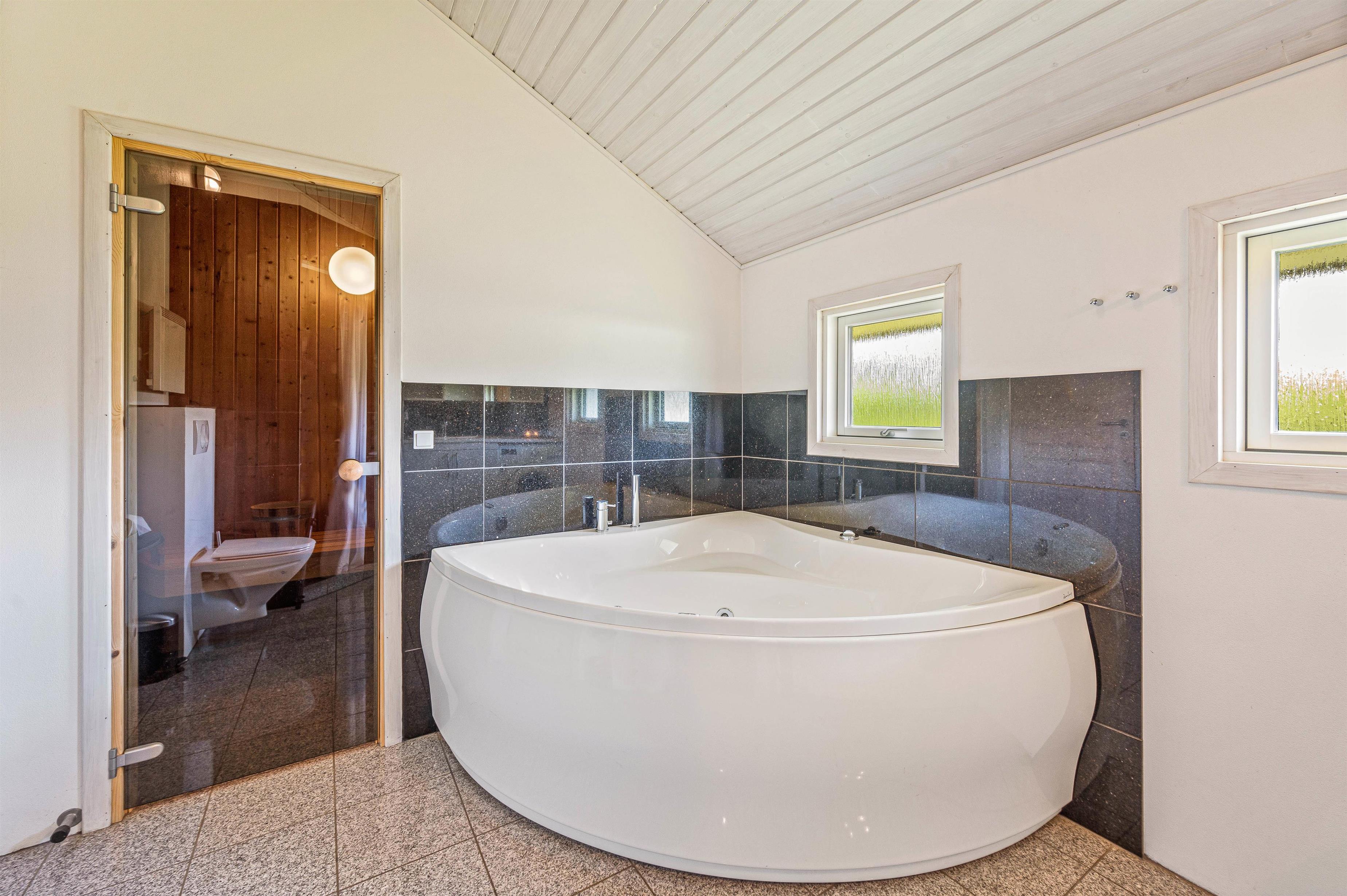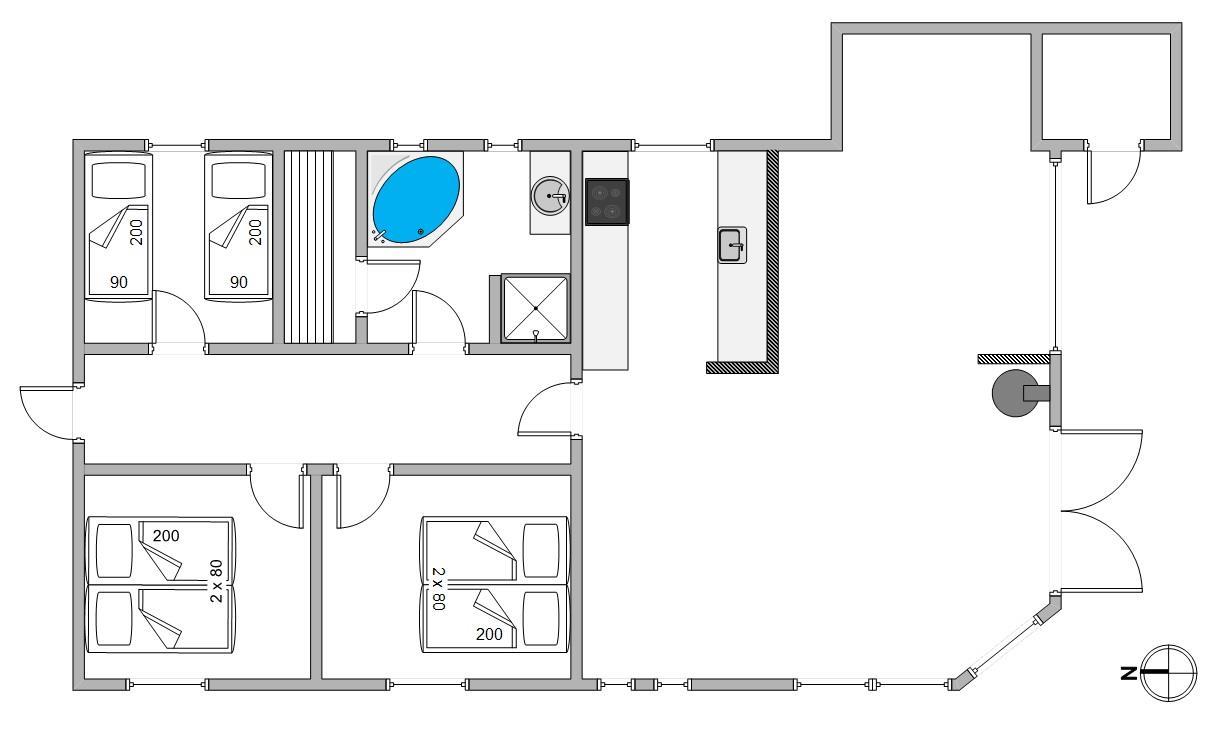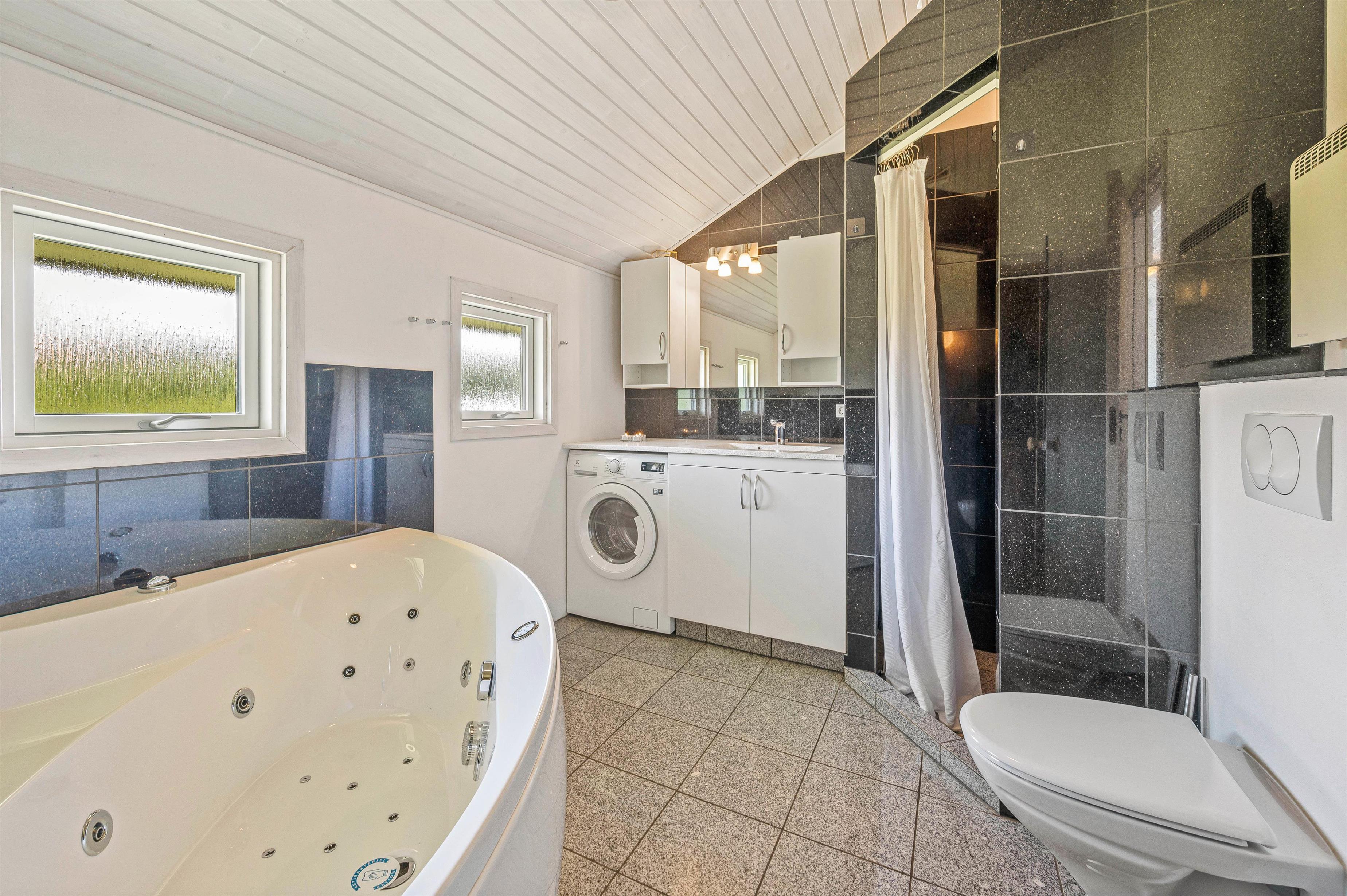 Der er 3 soveværelser, hvoraf de 2 værelser har dobbeltseng og det sidste 2 enkeltsenge. I badeværelset er der gulvvarme, bruseniche, hjørnespa og indgang til sauna. Derudover er der vaskemaskine i sommerhuset, så I kan vaske lidt tøj, hvis det skulle blive en nødvendighed.