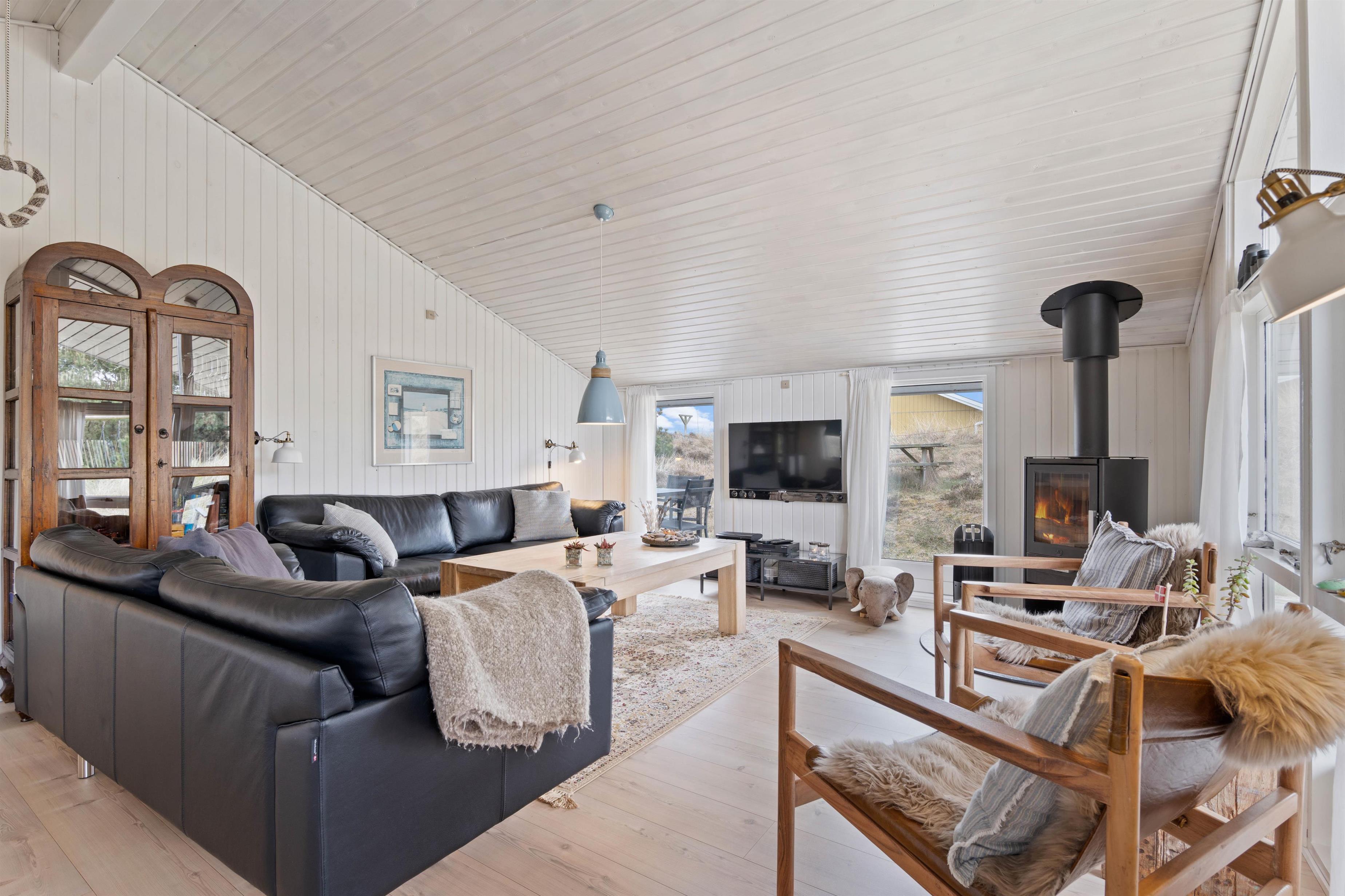 Allerede når I træder ind i det charmerede sommerhus, vil I straks bemærke den kærlige og personlige indretning. Feriehusets naturlige samlingspunkt er uden tvivl det åbne og lyse opholdsrum, som inviterer til gode stunder sammen. Nyd de fælles aftener, mens ilden knitrer i brændeovnen – enten foran fjernsynet med Chromecast eller omkring spisebordet. Til de kolde dage er sommerhuset desuden udstyret med en energibesparende varmepumpe. I sommerhuset finder I også både vaskemaskine og tørretumbler, så I nemt kan vaske tøj eller håndklæder efter en tur på stranden.