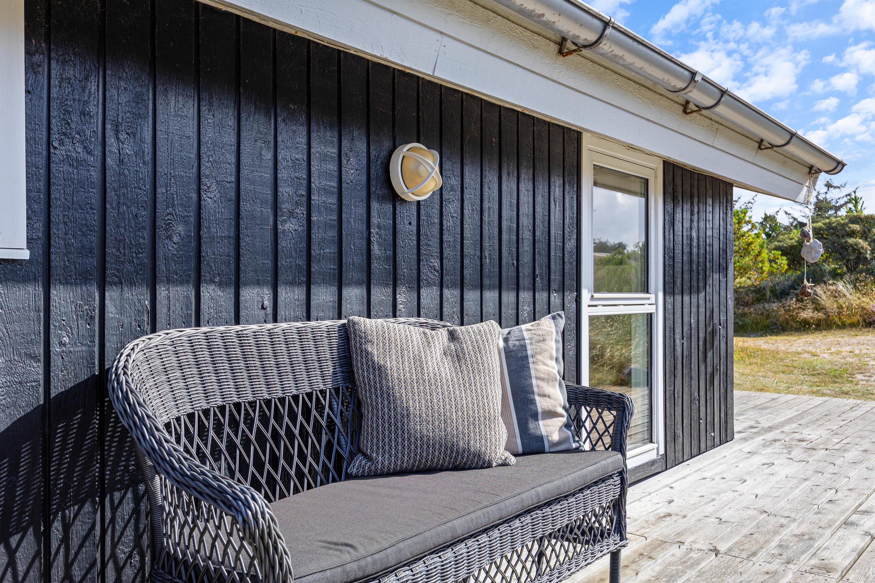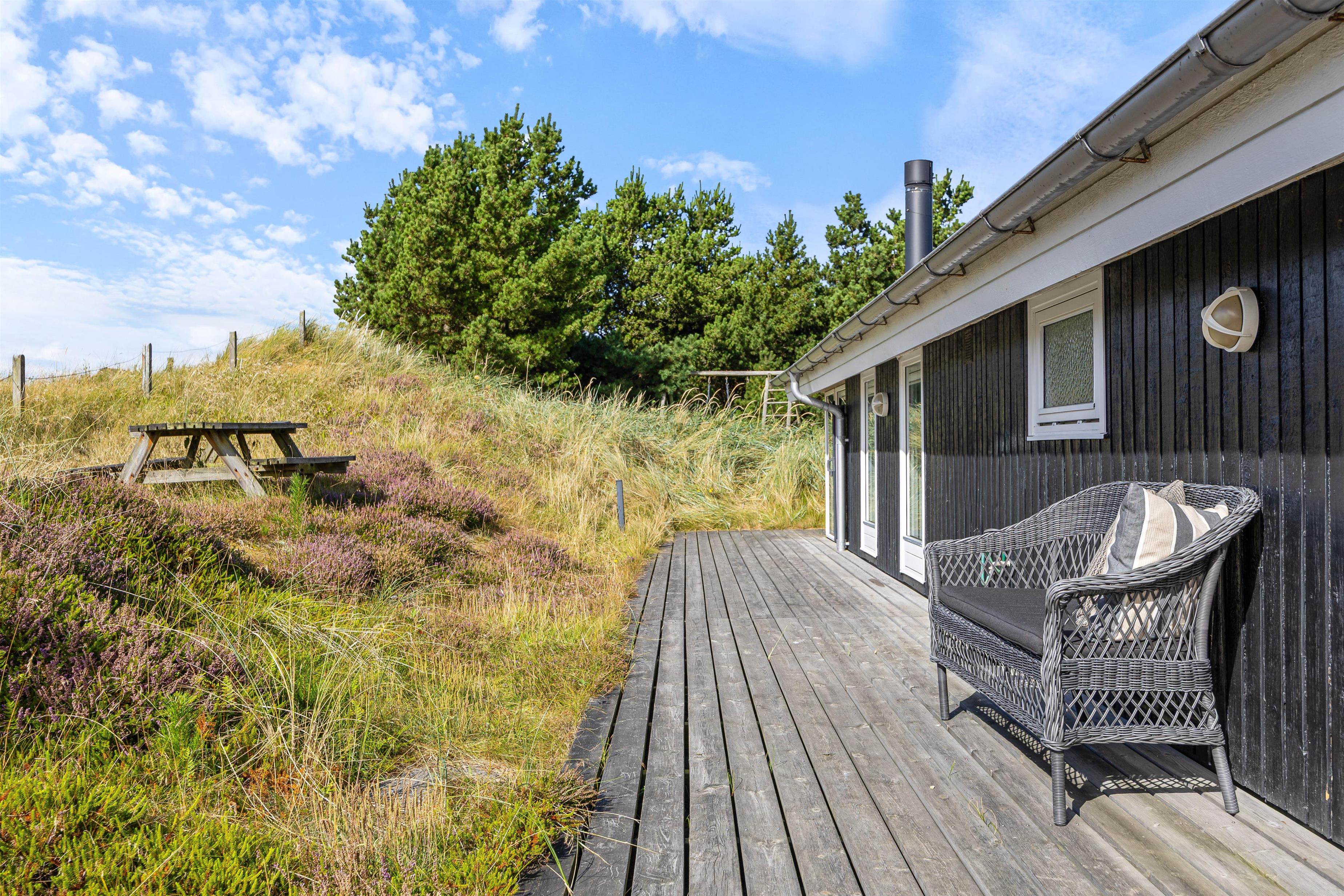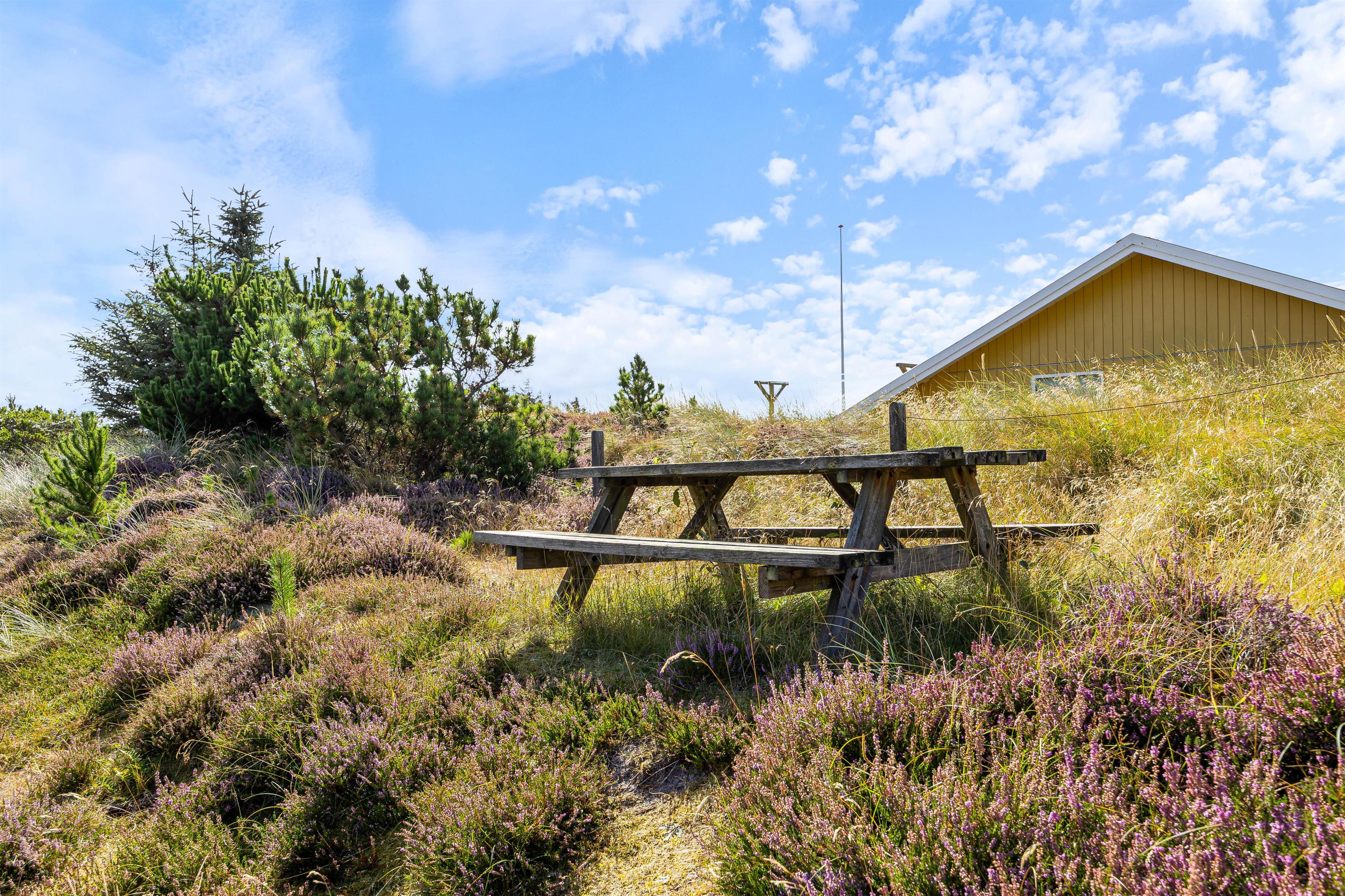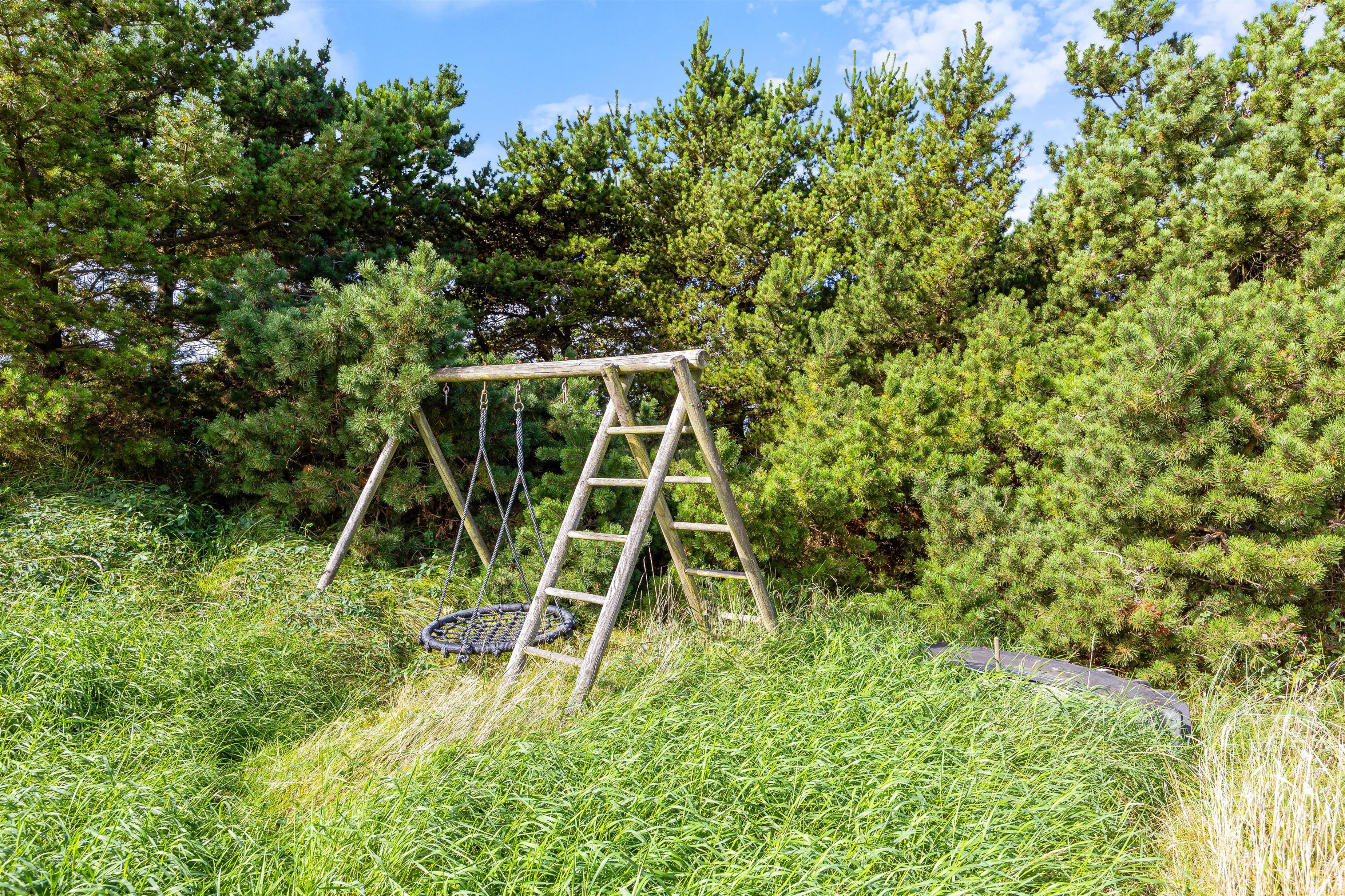Rundt om sommerhuset er der flere store terrasseområder, hvor man kan nyde naturen – hvad enten det er i liggestolen, til måltider udendørs eller til hyggelige grillaftener. Da terrassen går næsten hele vejen rundt om feriehuset, er der altid et lækkert hjørne at finde læ i. Til familiens yngste er der også både gynge og sandkasse, hvor de kan få masser af tid til at gå.