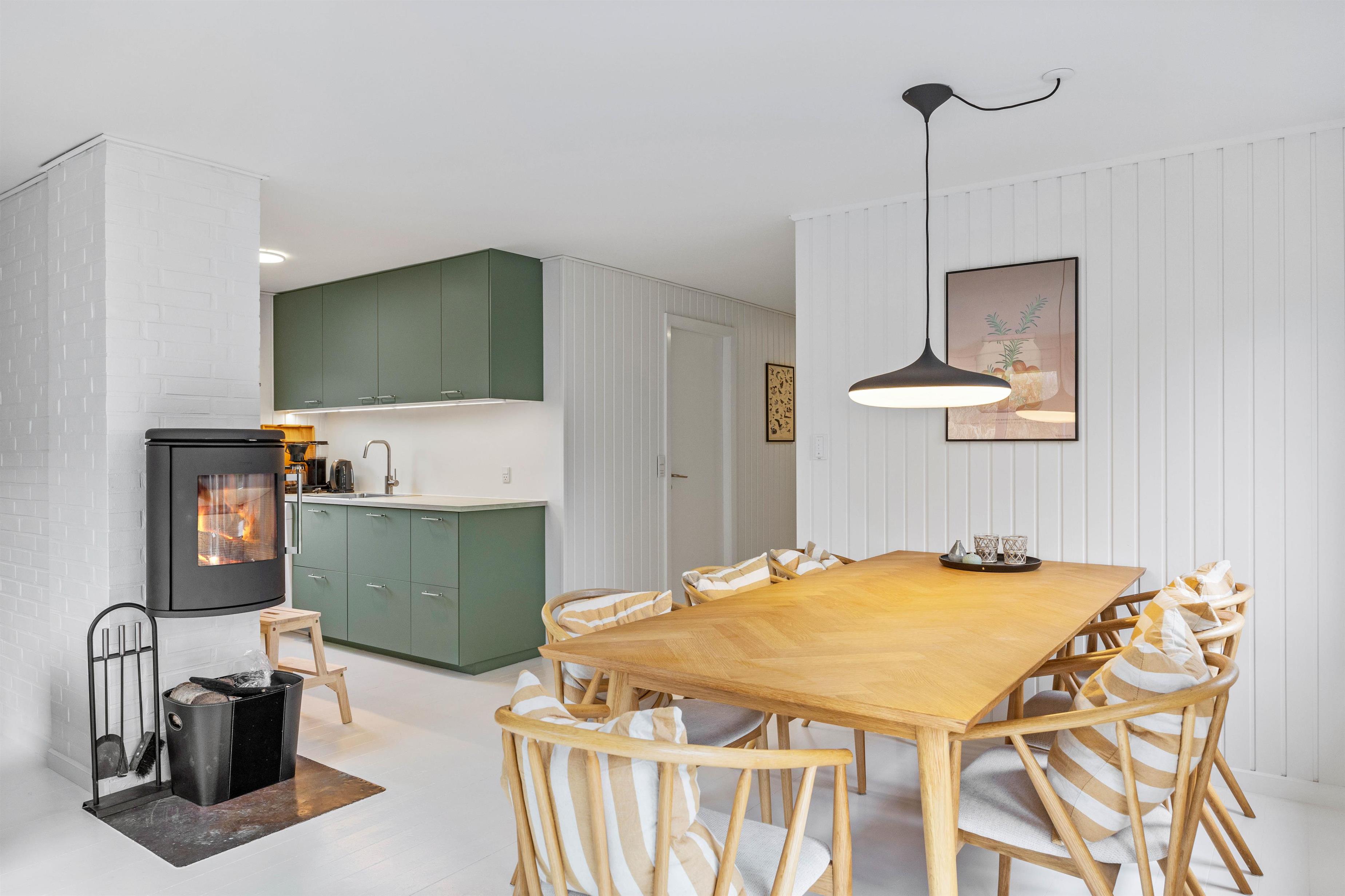 I den oprindelige del af sommerhuset, længst mod vest, finder du køkken, spisestue og en af sommerhusets 2 stuer. Køkkenet er veludstyret med bl.a. opvaskemaskine, mikroovn og en fryser på 30 L. I den smagfuldt indrettede stue er der en hyggelig brændeovn, fladskærms-TV og radio m/CD-afspiller. Desuden en energibesparende varmepumpe.
