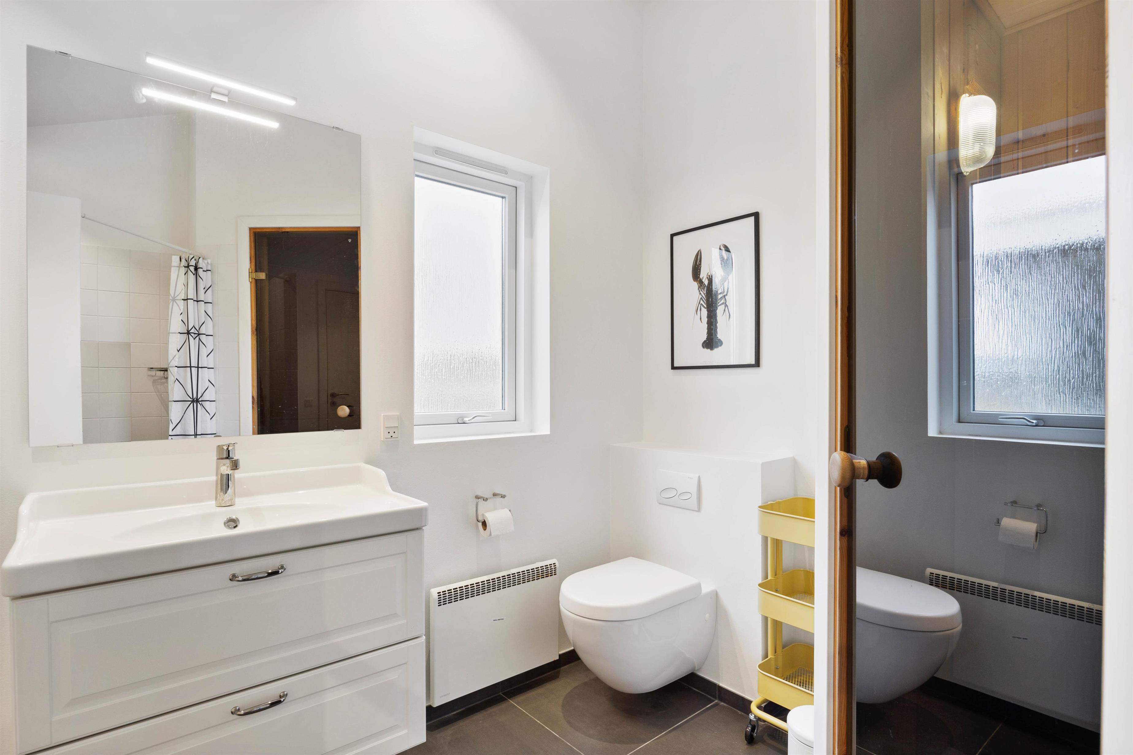 Der er 2 badeværelser i sommerhuset, begge med bruseniche og gulvvarme. I det ene badeværelse er der en skøn sauna, og på terrassen en udendørsbruser, som er perfekt til afkøling efter en tur i saunavarmen. Denne kan benyttes fra april til november.