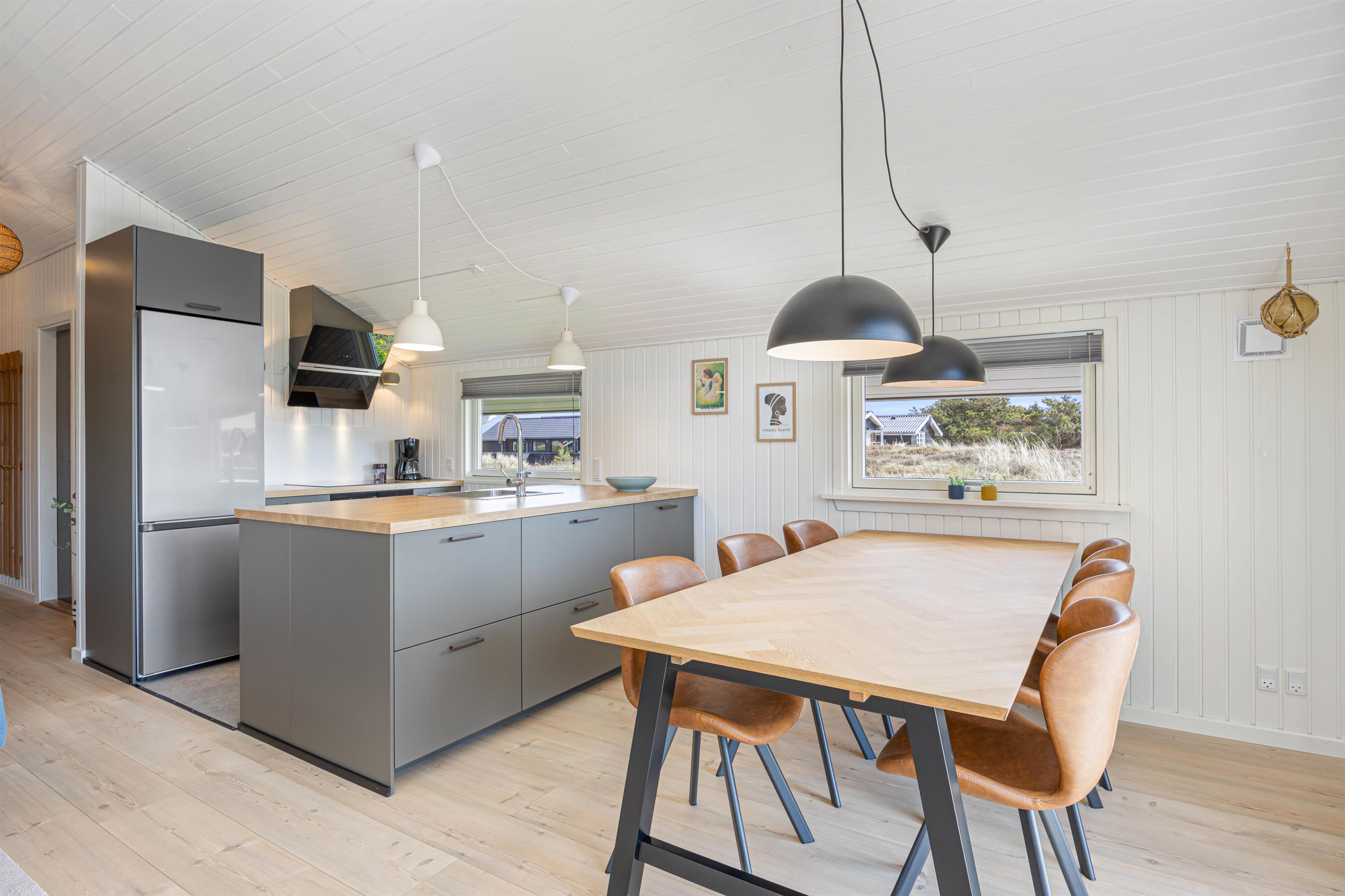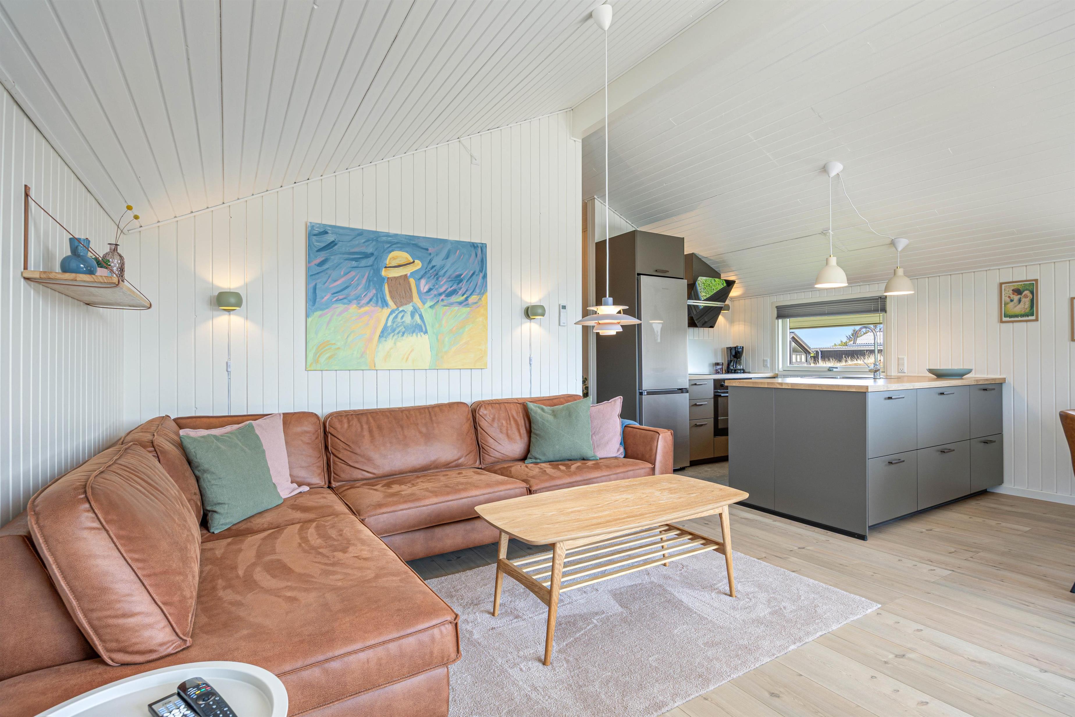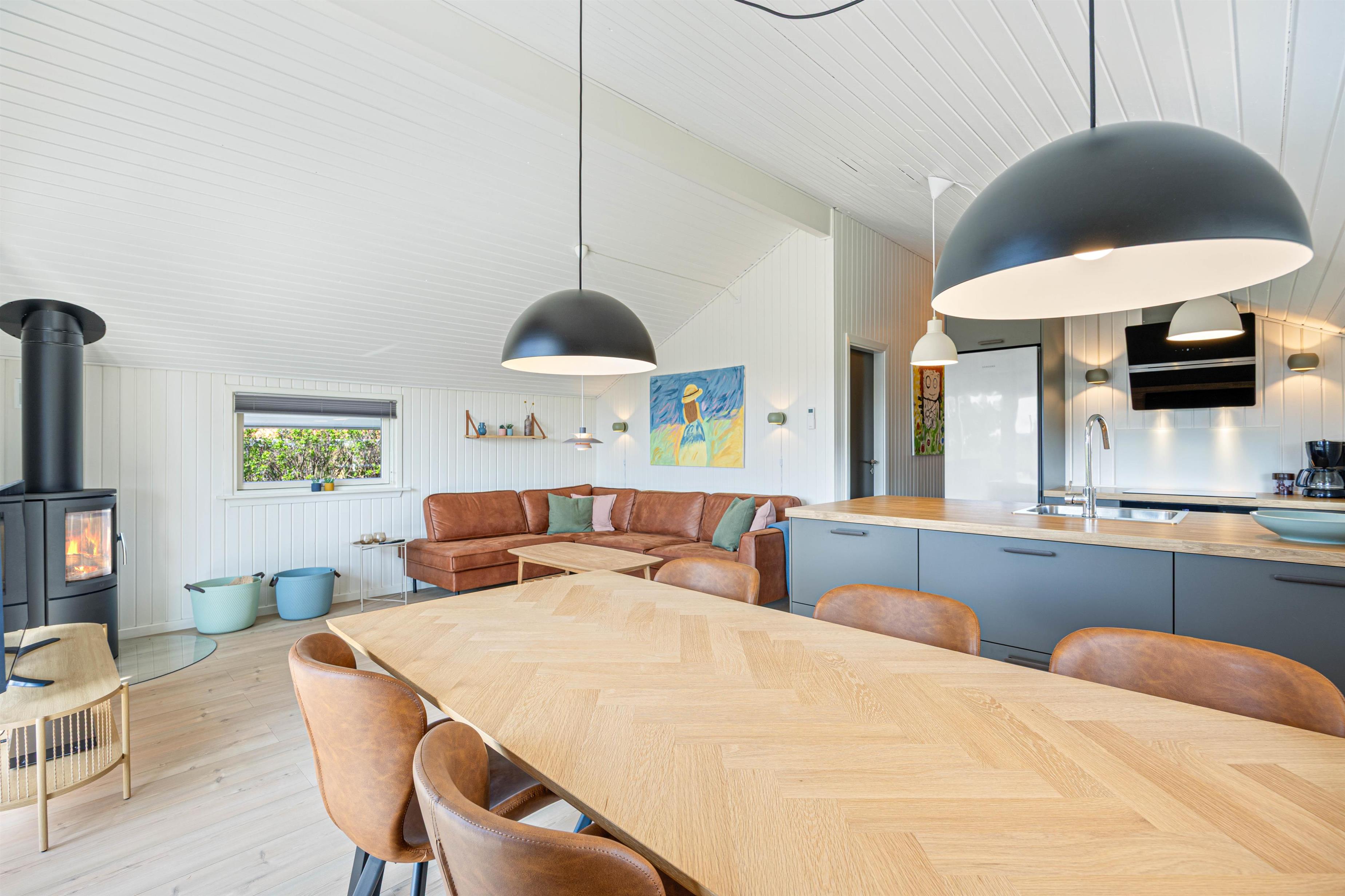 Det hyggelige og lyse sommerhus til 4 personer er kærligt indrettet med lædermøber i den komfortable opholdsstue og en dejlig spiseplads, som ligger i åben forbindelse med det moderne køkken, der er renoveret i 2025. Ved det store spisebord er der plads til alle familiemedlemmer, og du kan afslutte oplevelsesrige feriedage med lækre, hjemmelavede måltider.