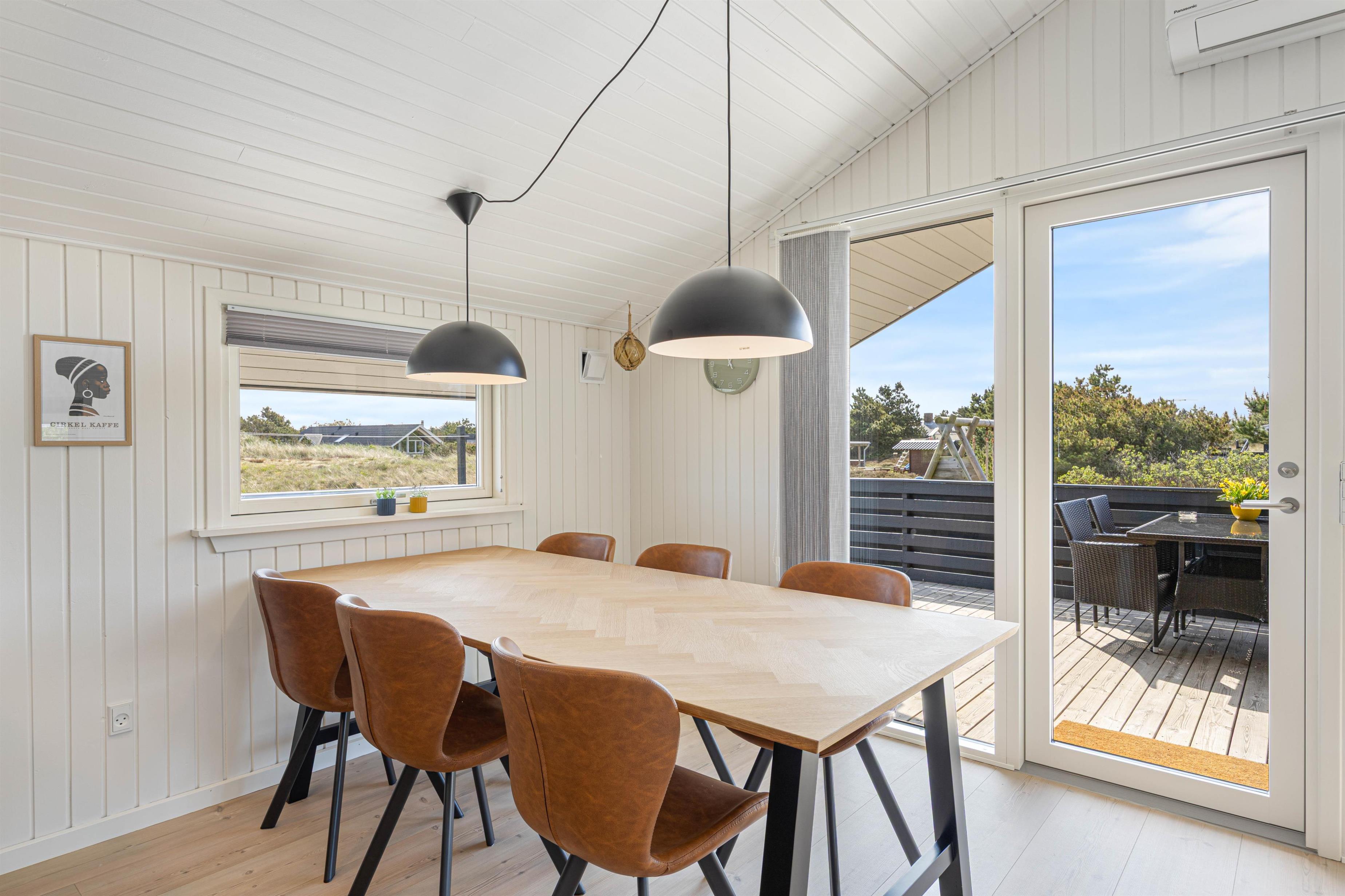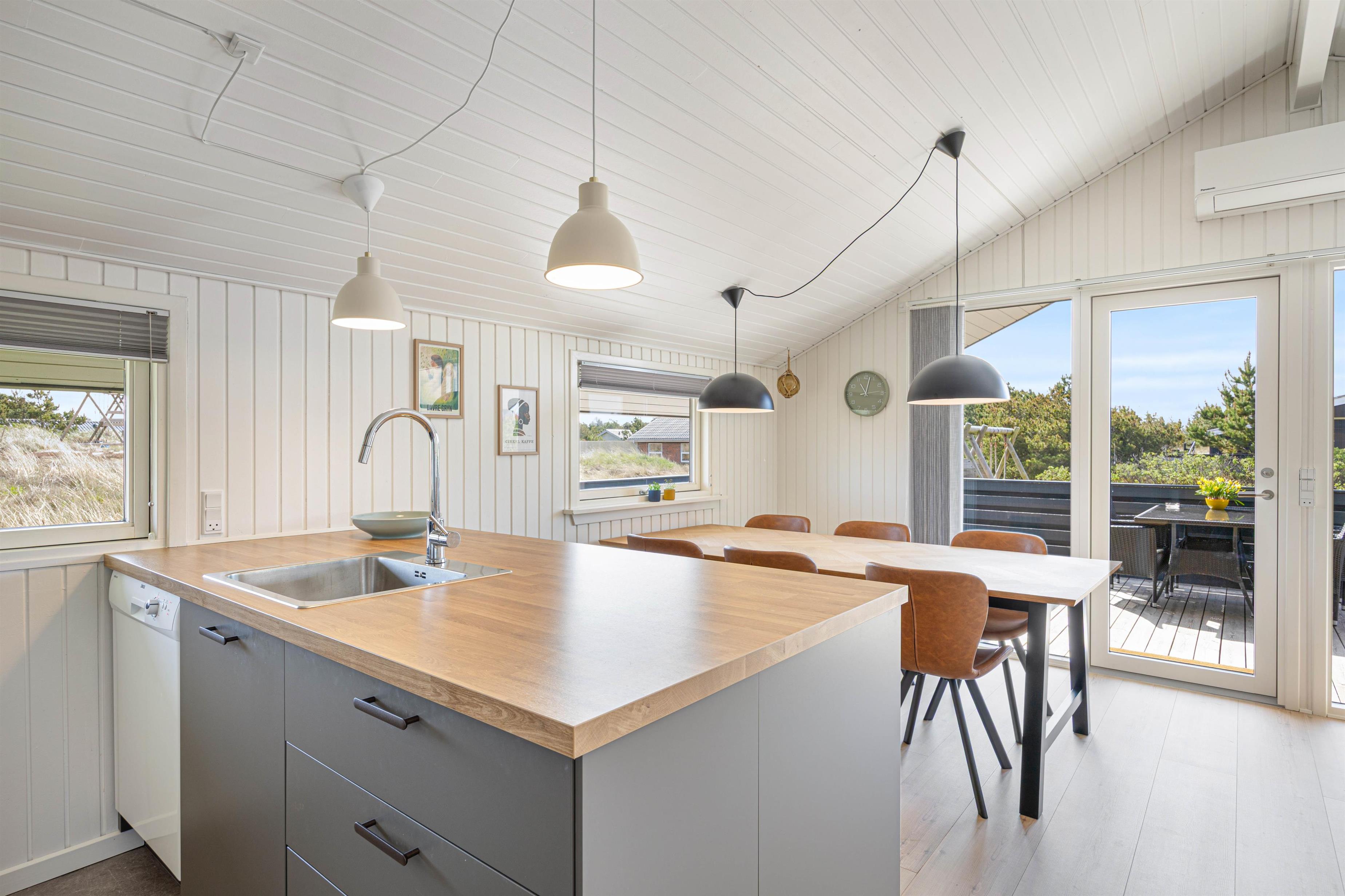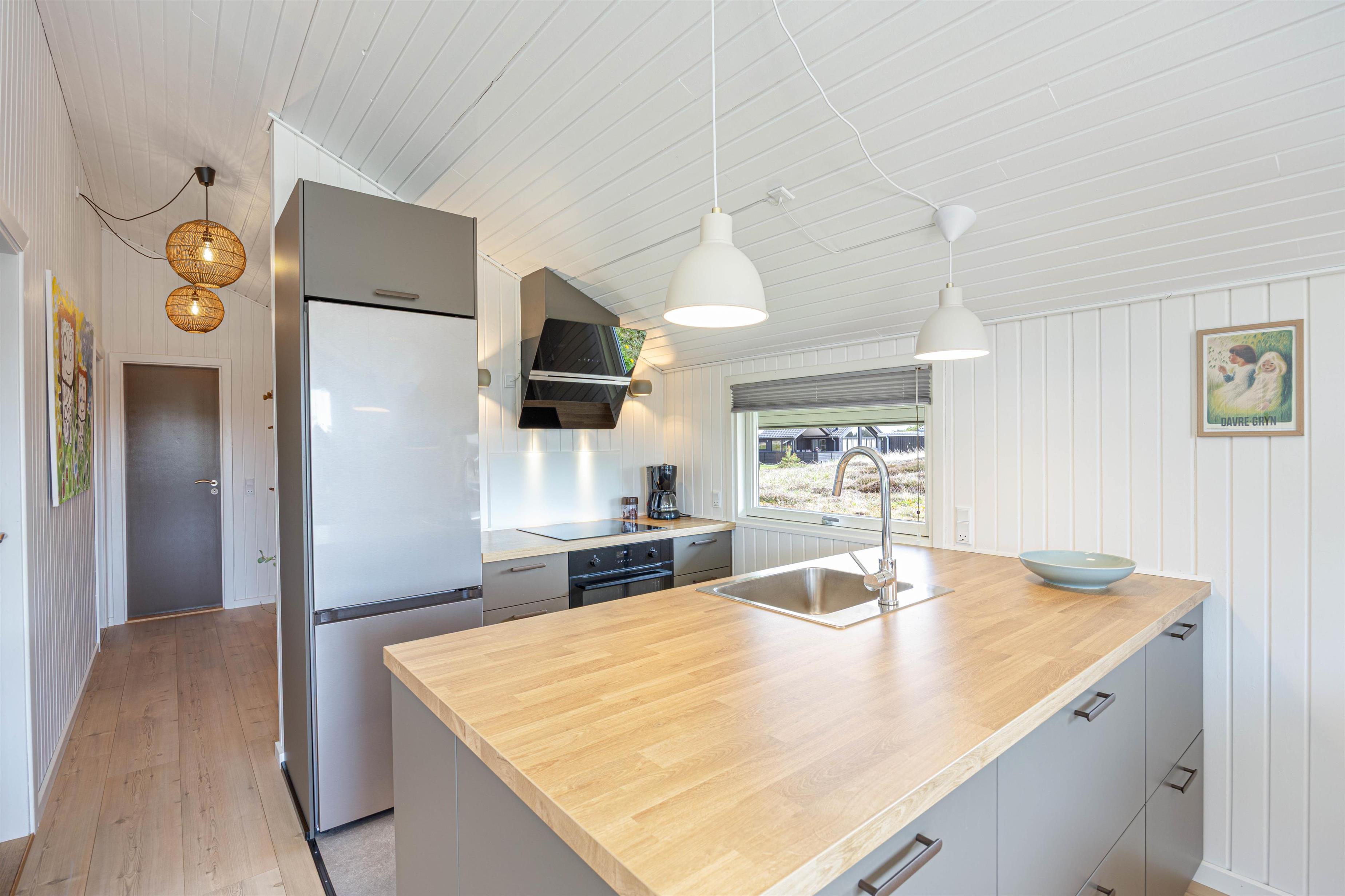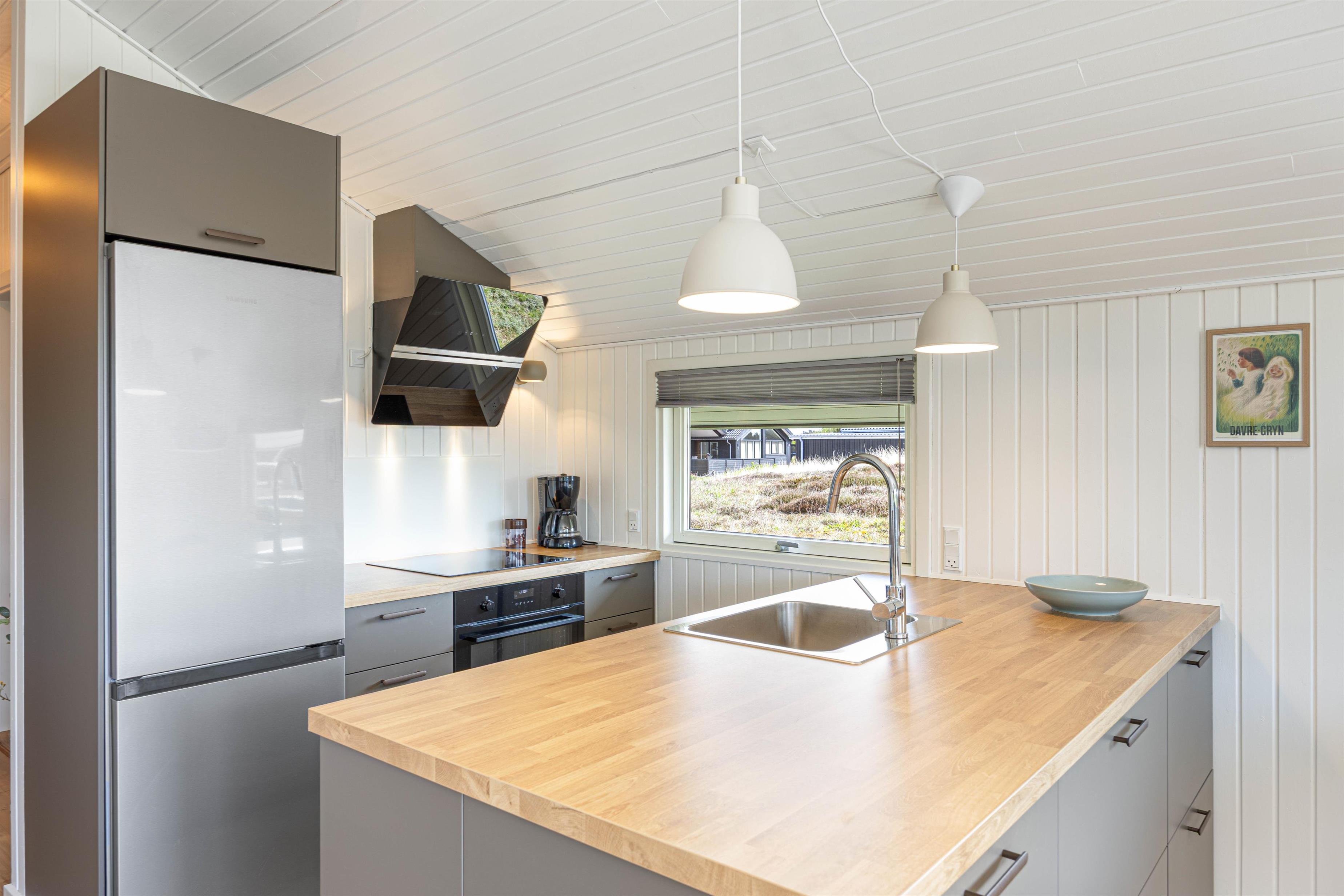 Det hyggelige og lyse sommerhus til 4 personer er kærligt indrettet med lædermøber i den komfortable opholdsstue og en dejlig spiseplads, som ligger i åben forbindelse med det moderne køkken, der er renoveret i 2025. Ved det store spisebord er der plads til alle familiemedlemmer, og du kan afslutte oplevelsesrige feriedage med lækre, hjemmelavede måltider.