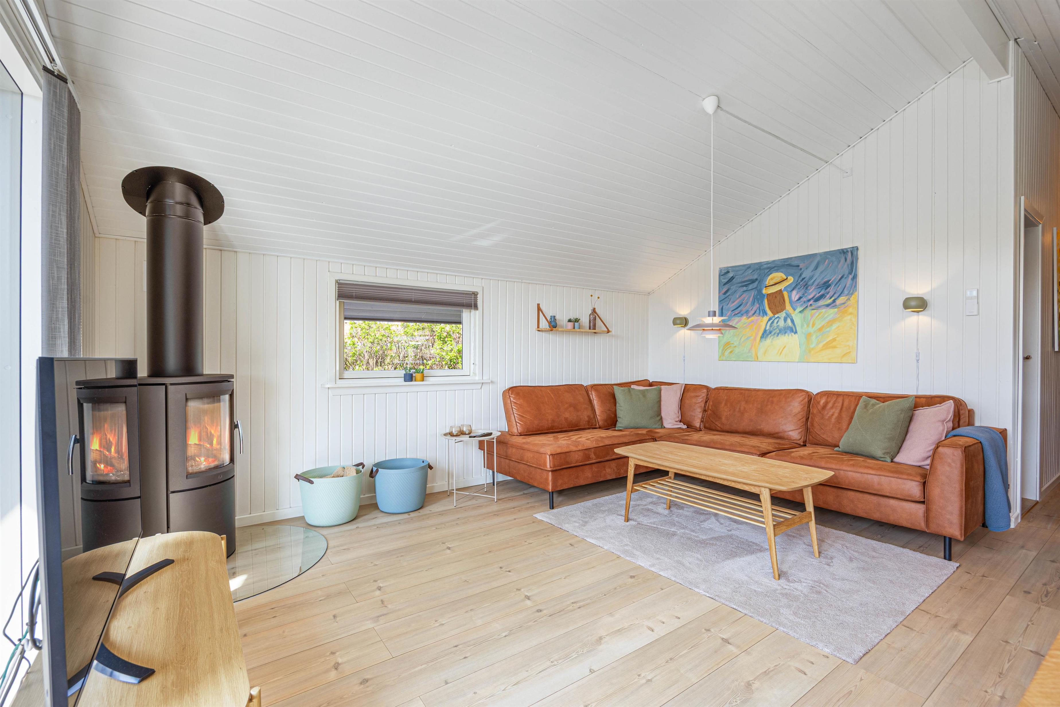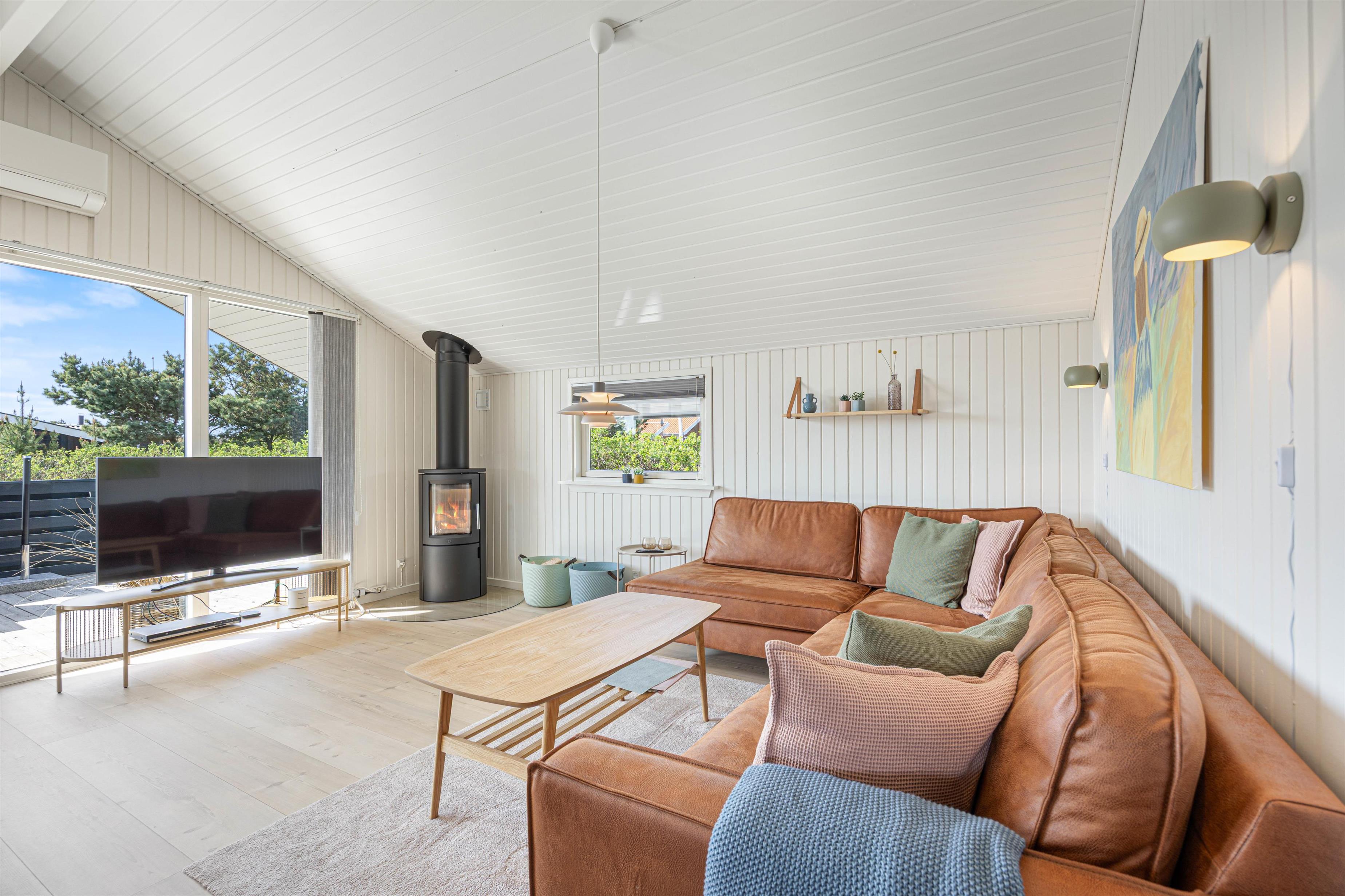 Fra stuen med den varmende brændeovn har du en fantastisk udsigt over den smukke natur i Bjerrgård. Sommerhuset kan opvarmes med en energibesparende varmepumpe, som også kan bruges som klimaanlæg om sommeren. I stuen kan I hygge jer foran tv'et.