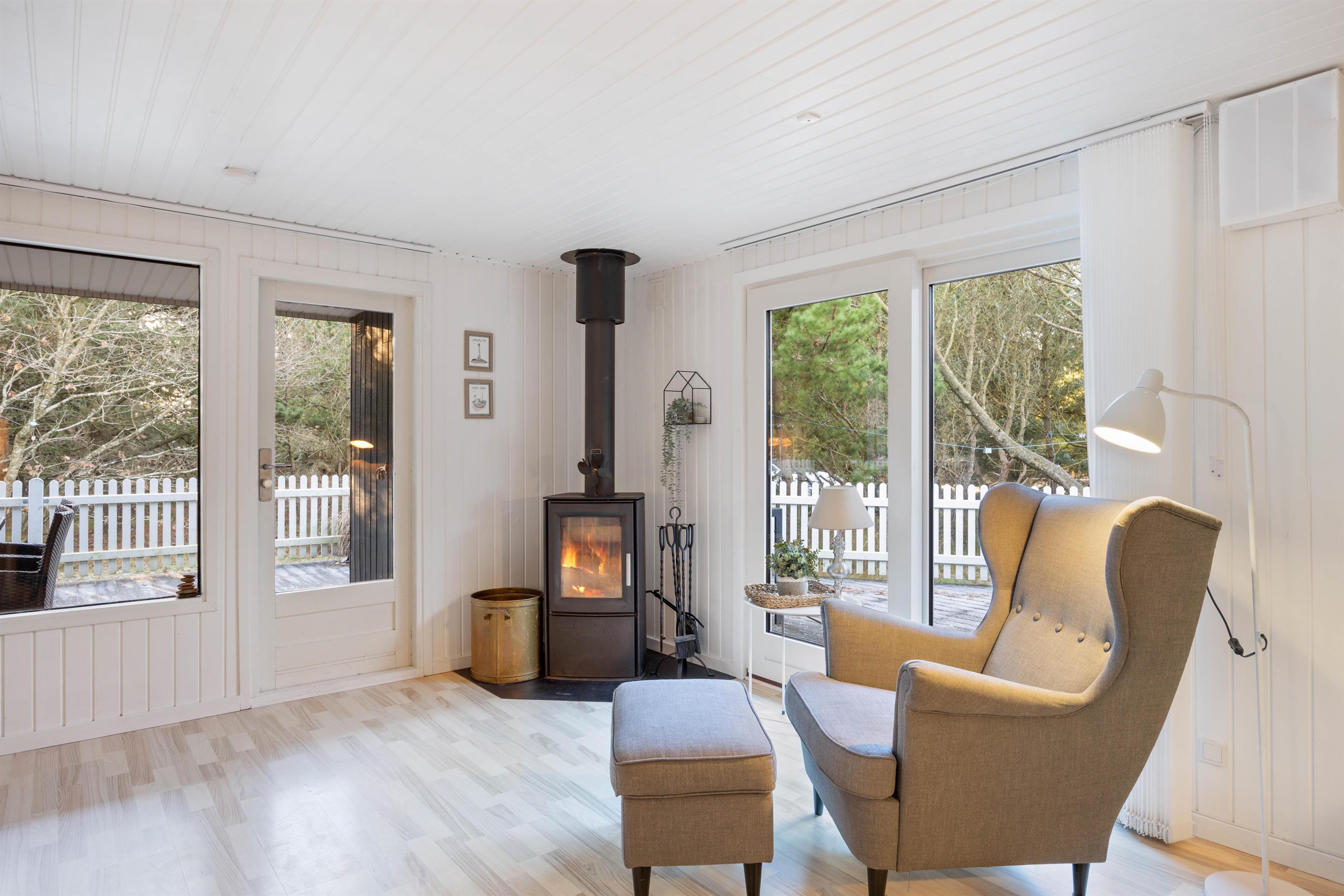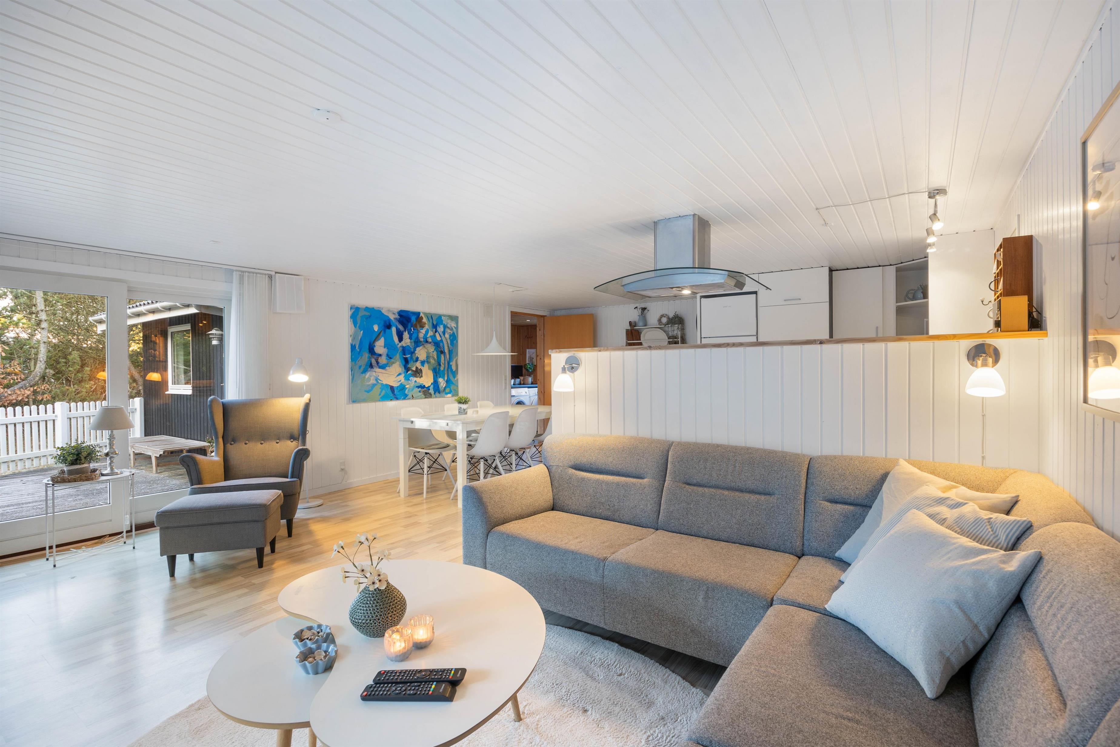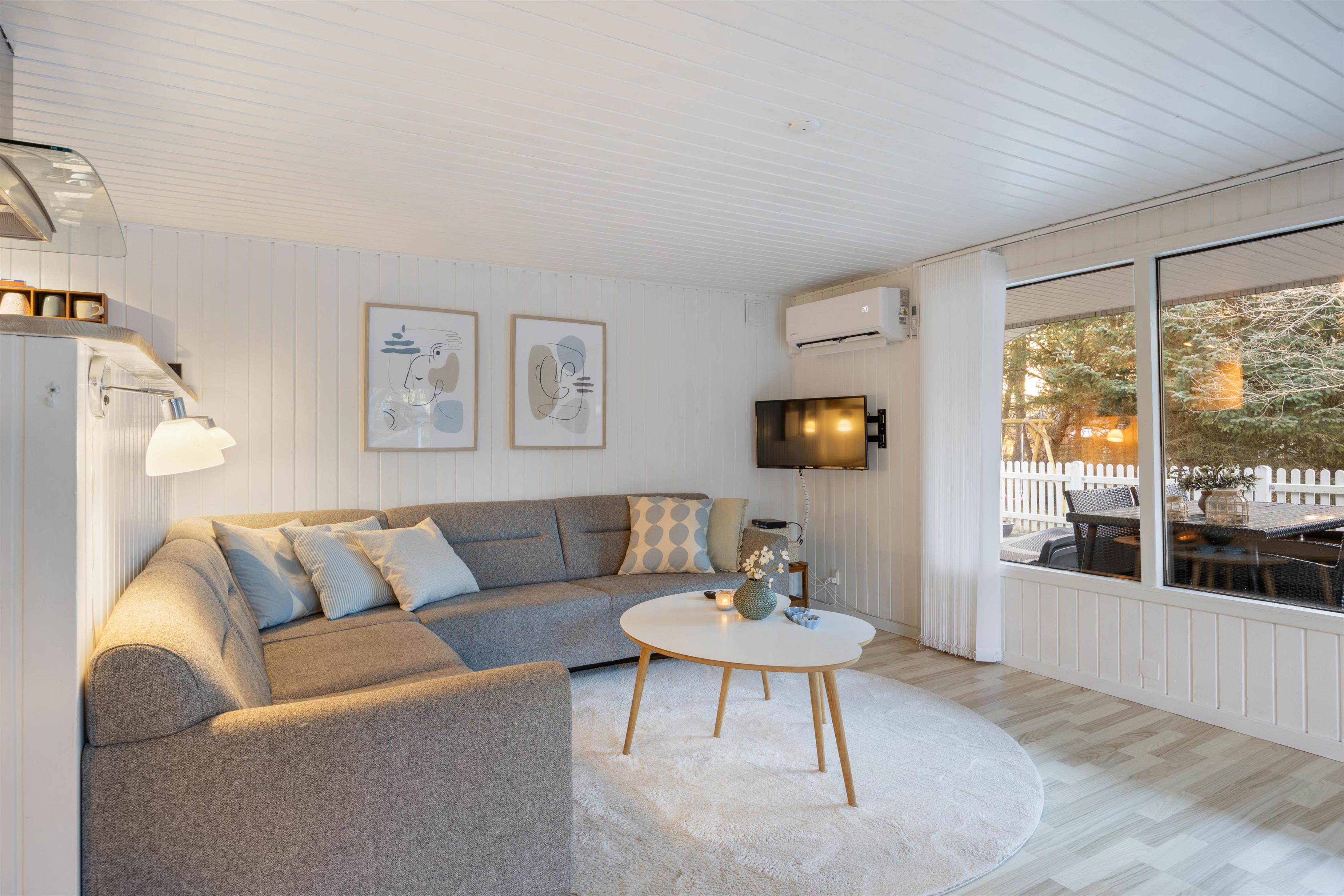 Det flotte sommerhus er smukt indrettet med gode, komfortable møbler. Vægge, lofter og gulve er holdt i lyse nuancer, og indretningen er enkel med et personligt strejf. Her er der en følelse af sol og sommer året rundt. De flotte sofaer og de blå detaljer på gardiner og nips giver en god og personlig kontrast til den ellers lyse indretning. Det skaber samtidig en god og hyggelig atmosfære. Rumtemperaturen kan tilpasses ved at gøre brug af den energibesparende varmepumpe.