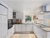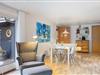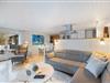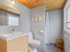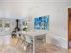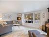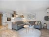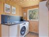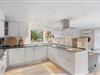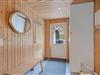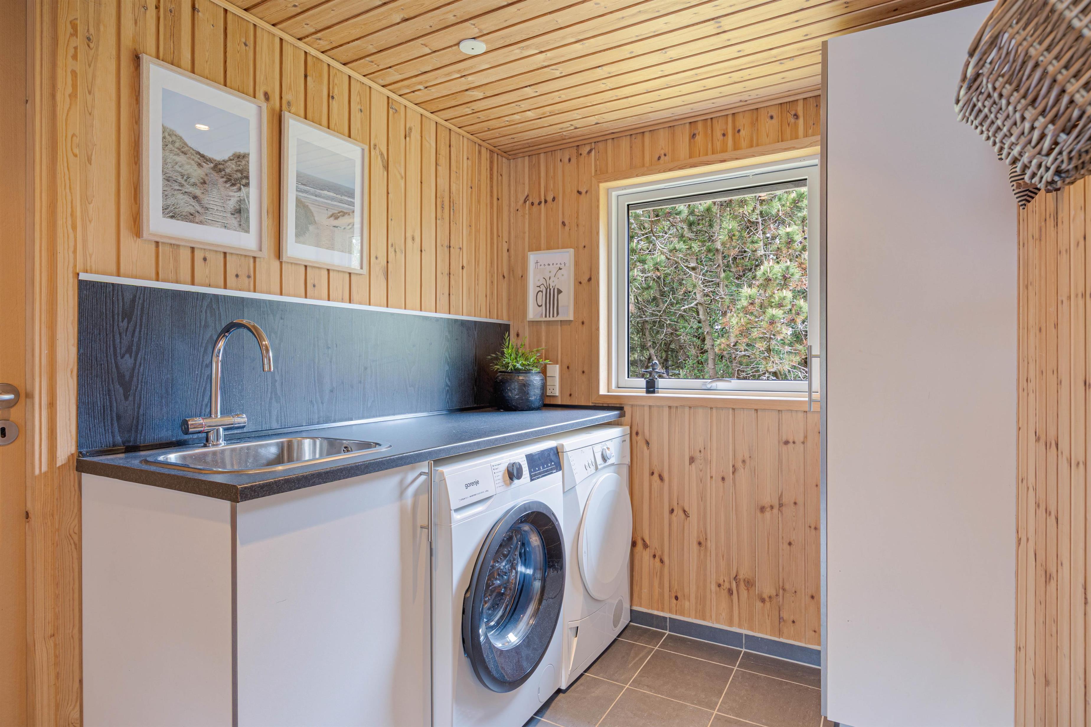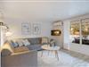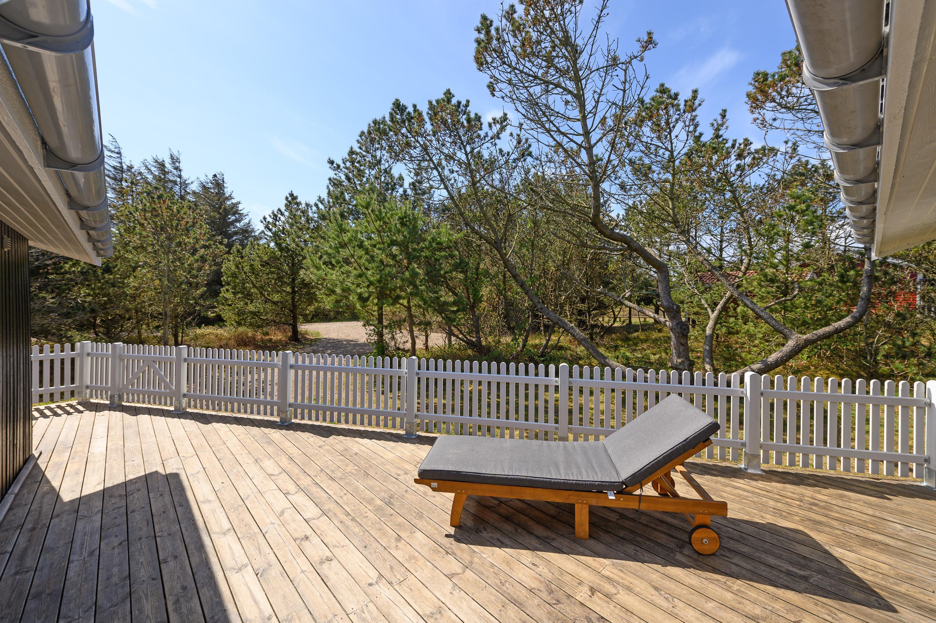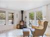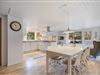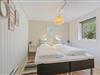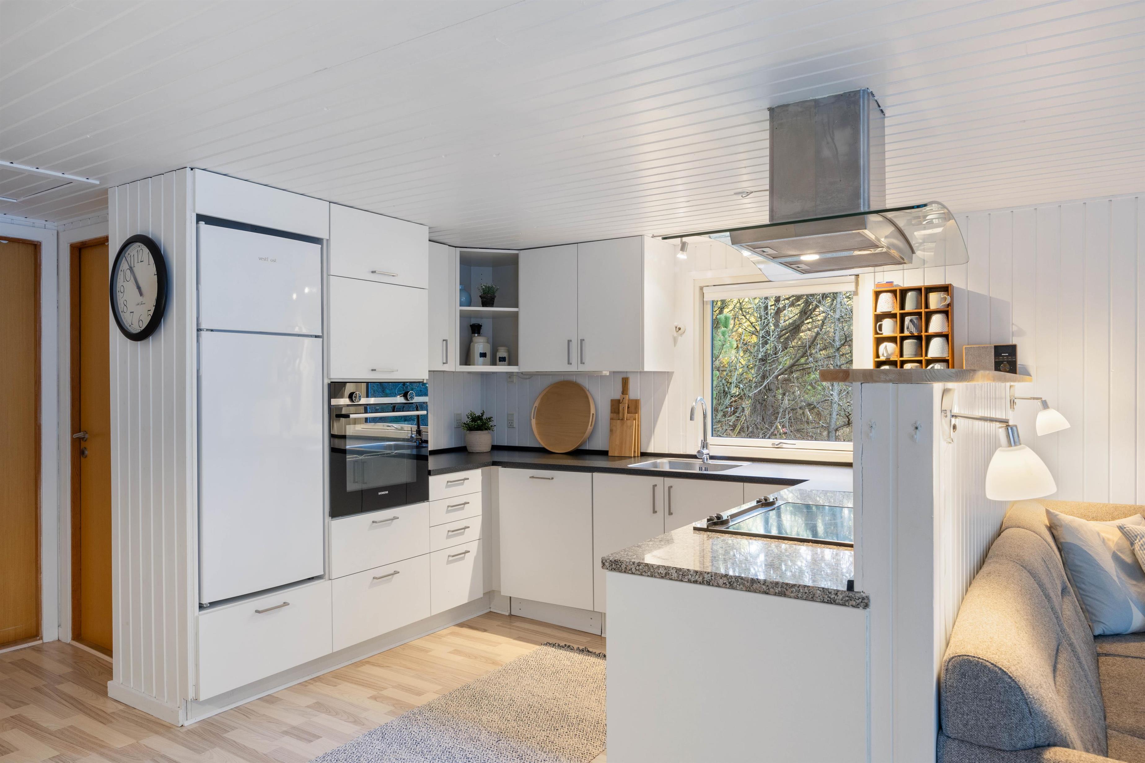 Det flotte sommerhus er smukt indrettet med gode, komfortable møbler. Vægge, lofter og gulve er holdt i lyse nuancer, og indretningen er enkel med et personligt strejf. Her er der en følelse af sol og sommer året rundt. De flotte sofaer og de blå detaljer på gardiner og nips giver en god og personlig kontrast til den ellers lyse indretning. Det skaber samtidig en god og hyggelig atmosfære. Rumtemperaturen kan tilpasses ved at gøre brug af den energibesparende varmepumpe.