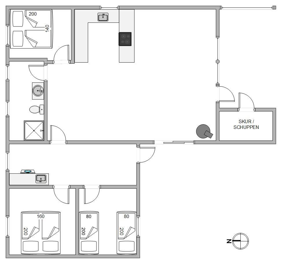 Sommerhuset er indrettet med 3 soverum, som alle har dobbeltseng. Feriehuset er derfor ideelt til en større børnefamilie eller en gruppe venner, der holder ferie sammen.