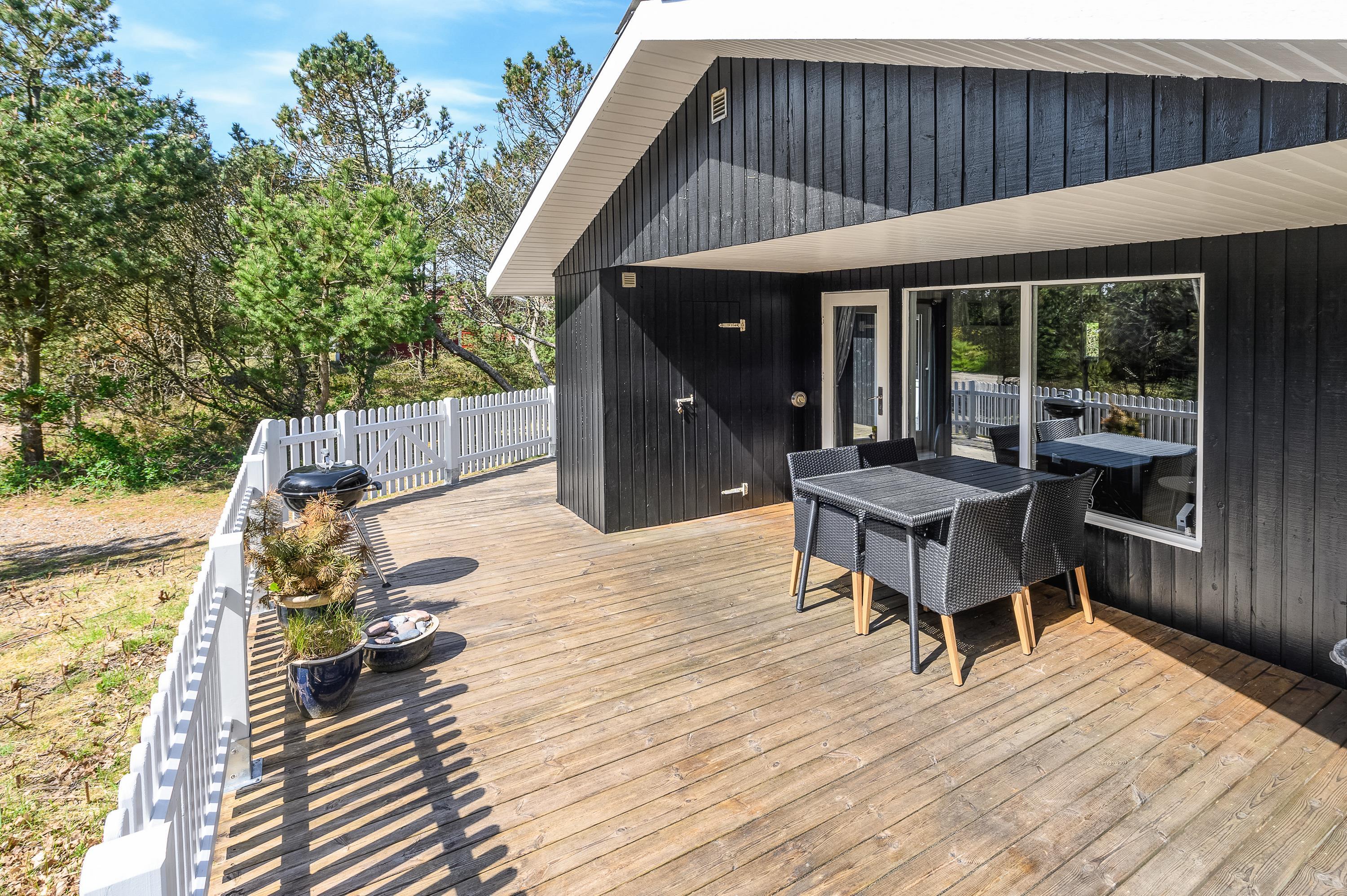Fra stuen har du adgang til en dejlig, stor træterrasse. En del af terrassen er overdækket, hvilket giver læ på tidligere forårsdage eller på lune sommeraftener, når duggen falder. Til uderummet hører også et gyngestativ og en sandkasse til familiens mindste.
