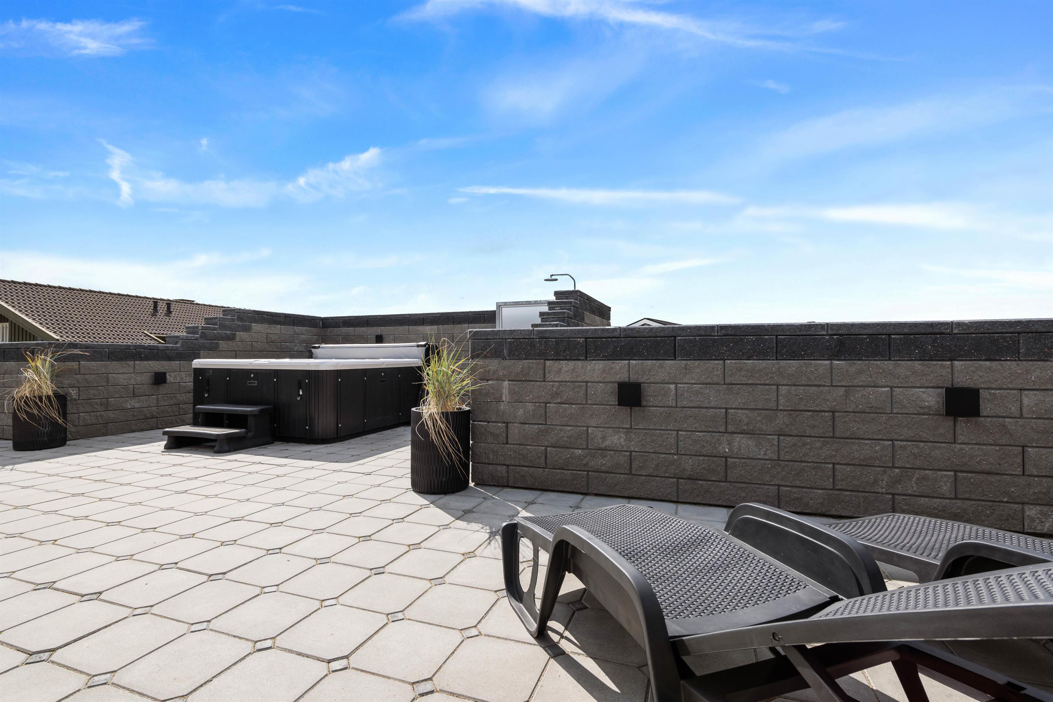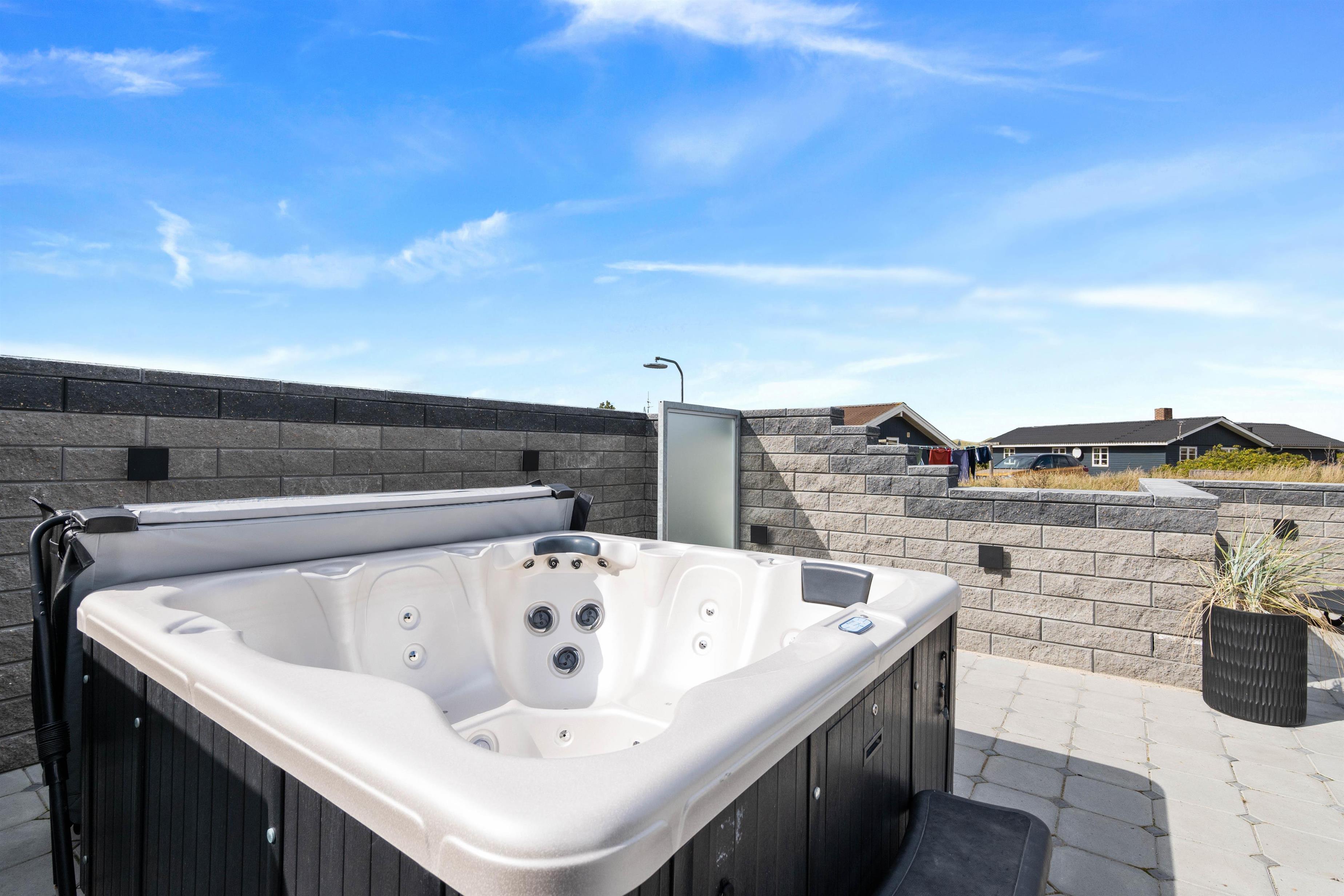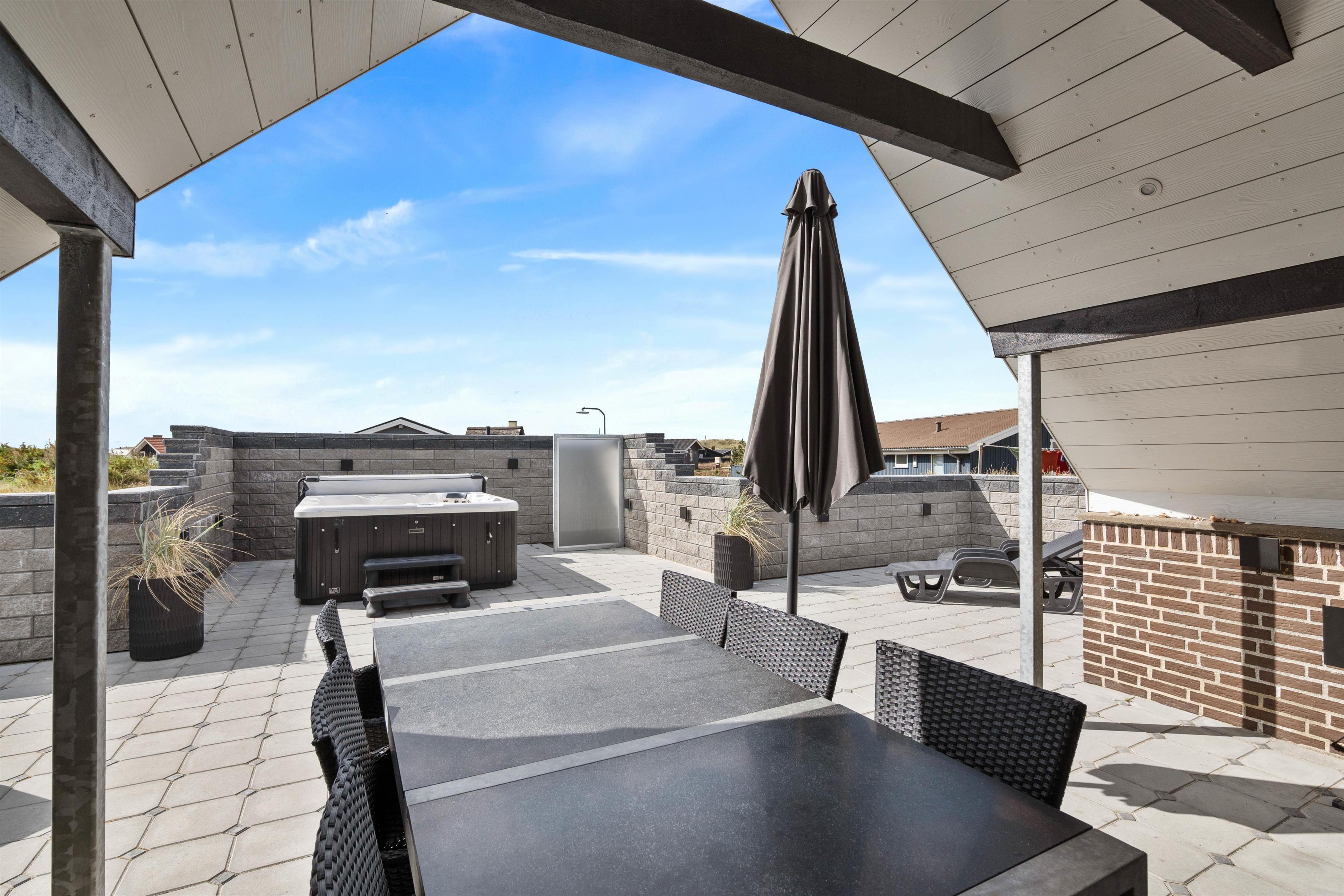 Huset ligger på en dejlig rolig naturgrund tæt på havet. Den store møblerede og helt lukkede terrasse danner en herlig tumleplads for såvel børnene som familiens hund og giver mulighed for ugeneret at nyde naturen, solen og ferien på nordsøkysten i Danmark. Den fine sandstrand nås på få minutter (ca. 450 m). Om sommeren byder udebruseren den perfekte mulighed for at skylle sand og salt fra kroppen efter en tur til stranden. Den kan benyttes fra april til november.