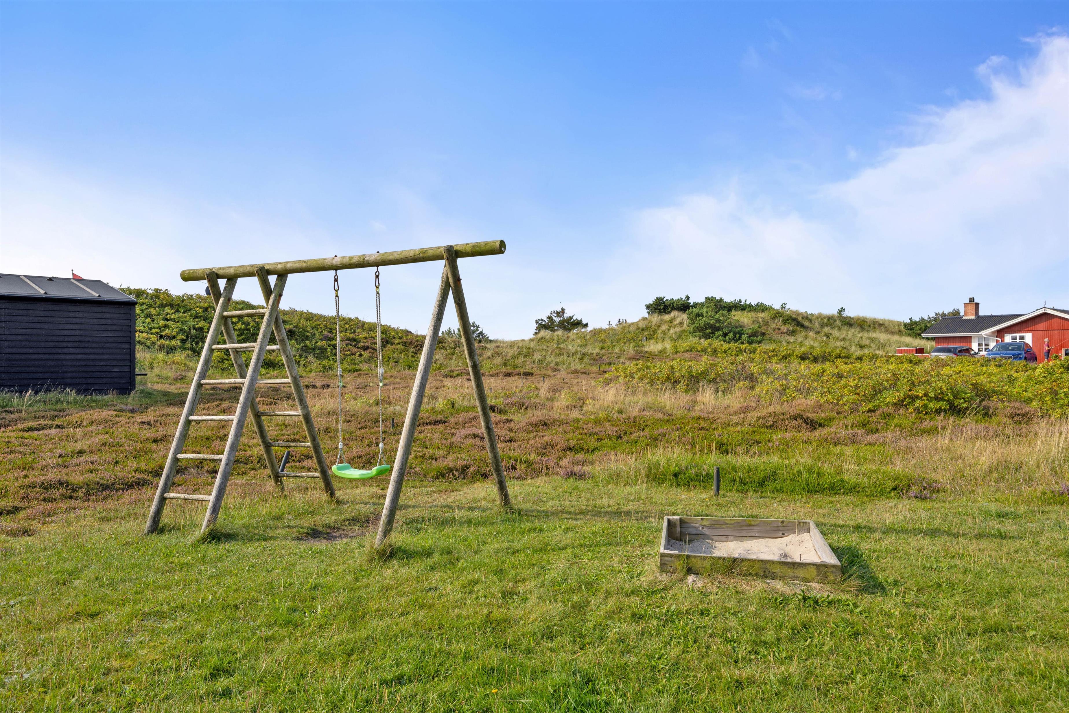 Sommerhuset ligger på en skøn naturgrund, hvor der er god plads til leg for børnene. Til de yngste er der et gyngestativ, som de kan gynge på, mens I kigger på fra terrassen.