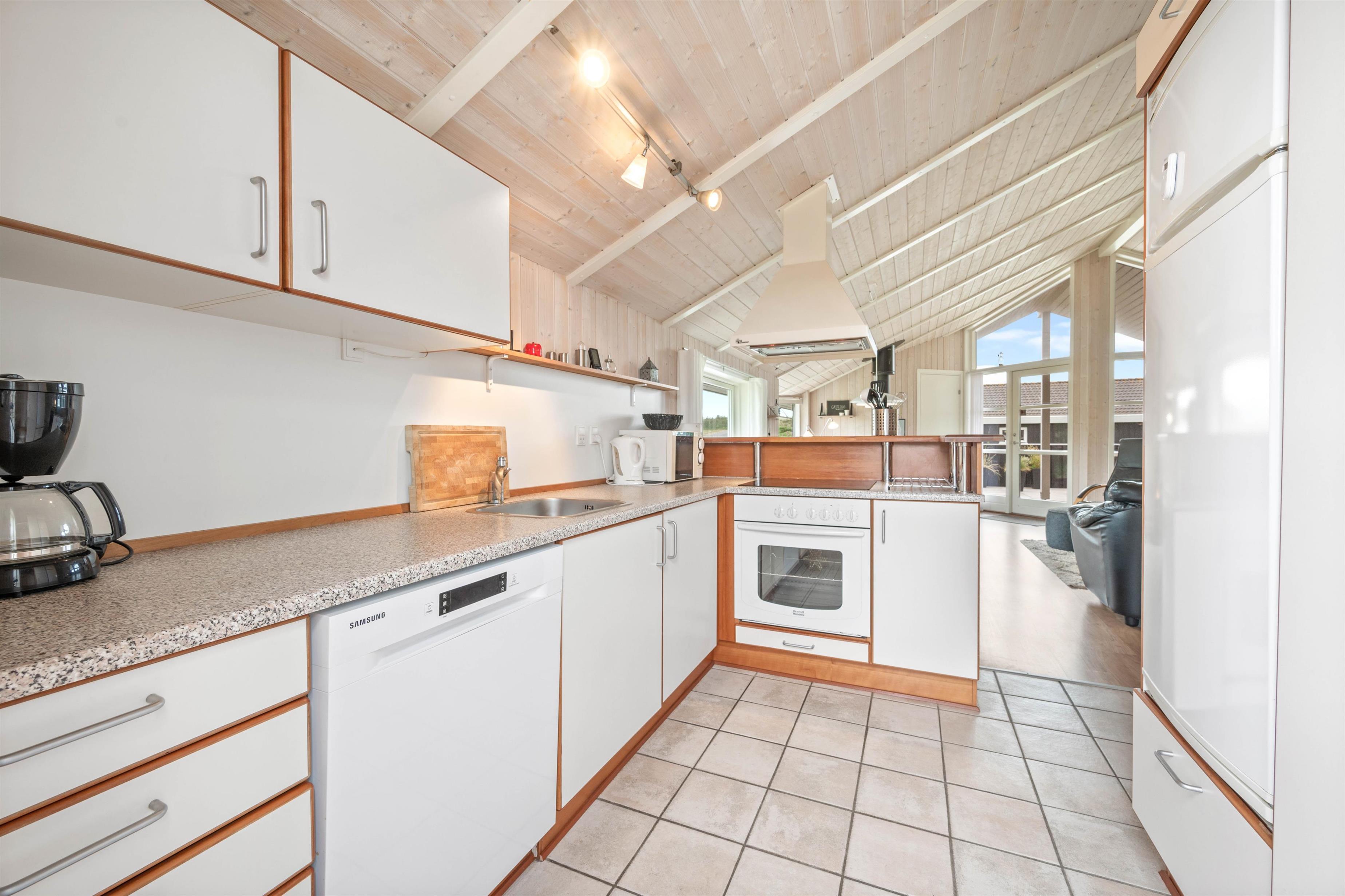 Det åbne, fuldt udstyrede køkken er i forbindelse med opholdsrummet. Her er alle faciliteter til rådighed - fra den praktiske opvaskemaskine til masser af plads til fælles måltider.