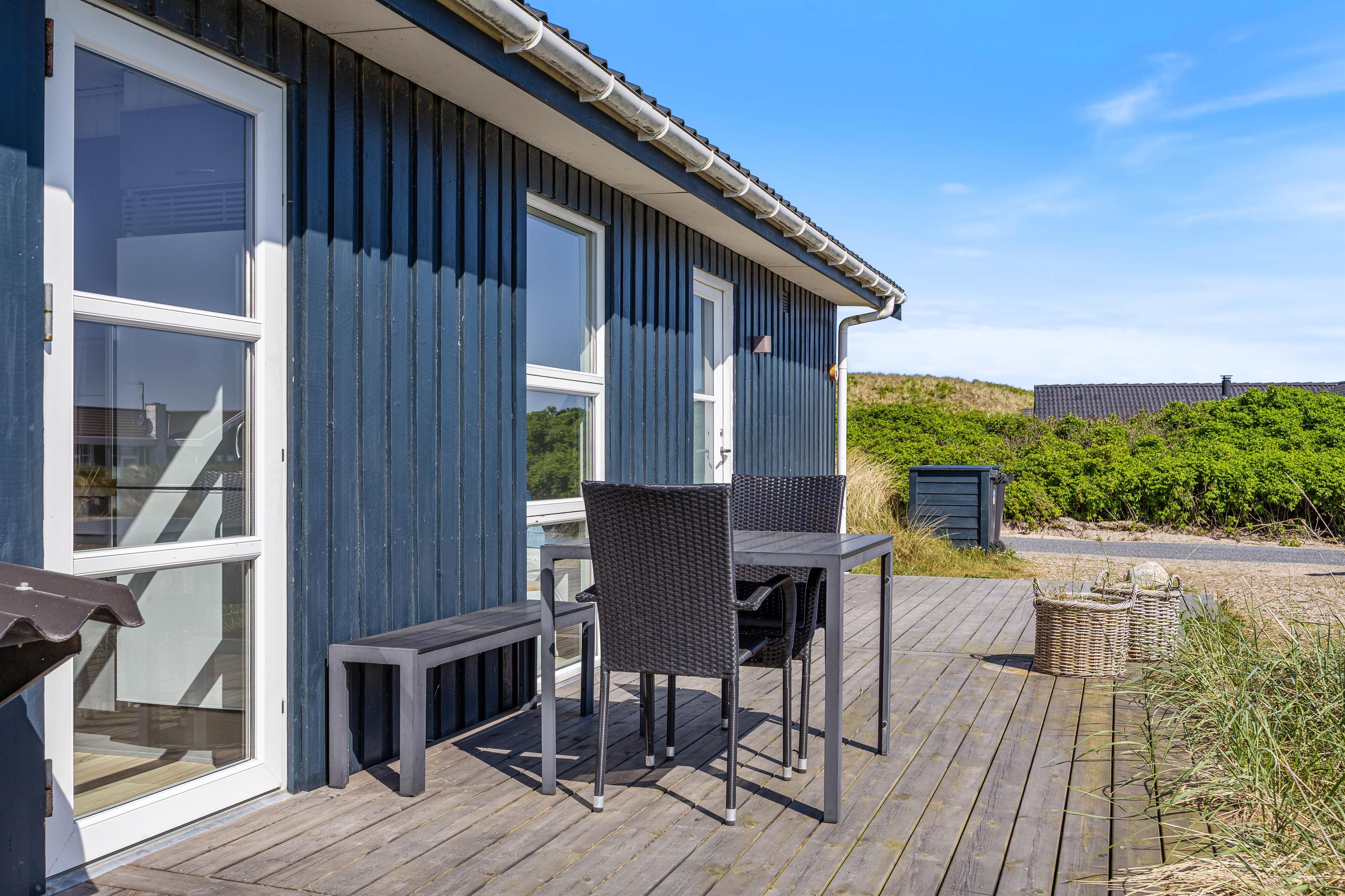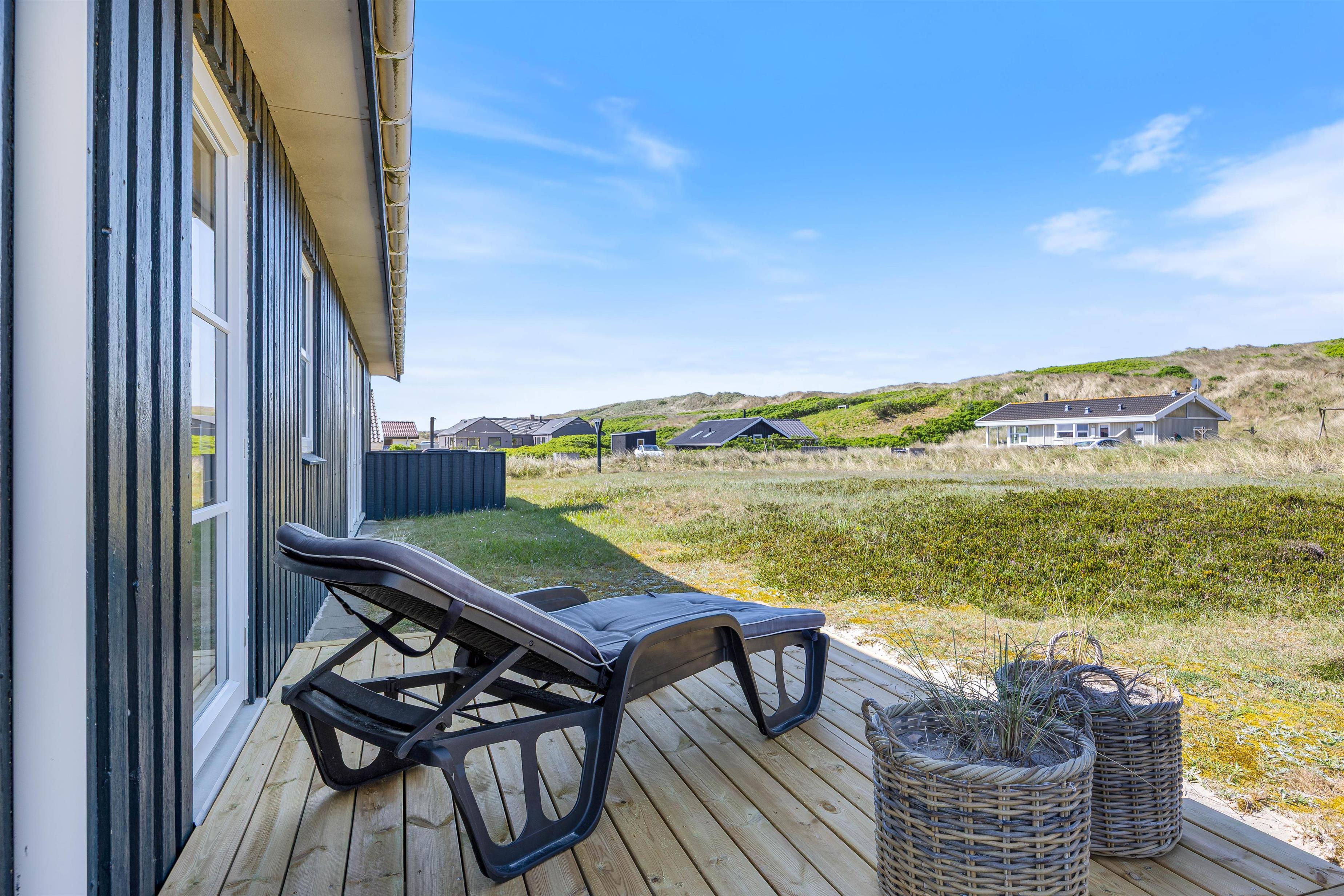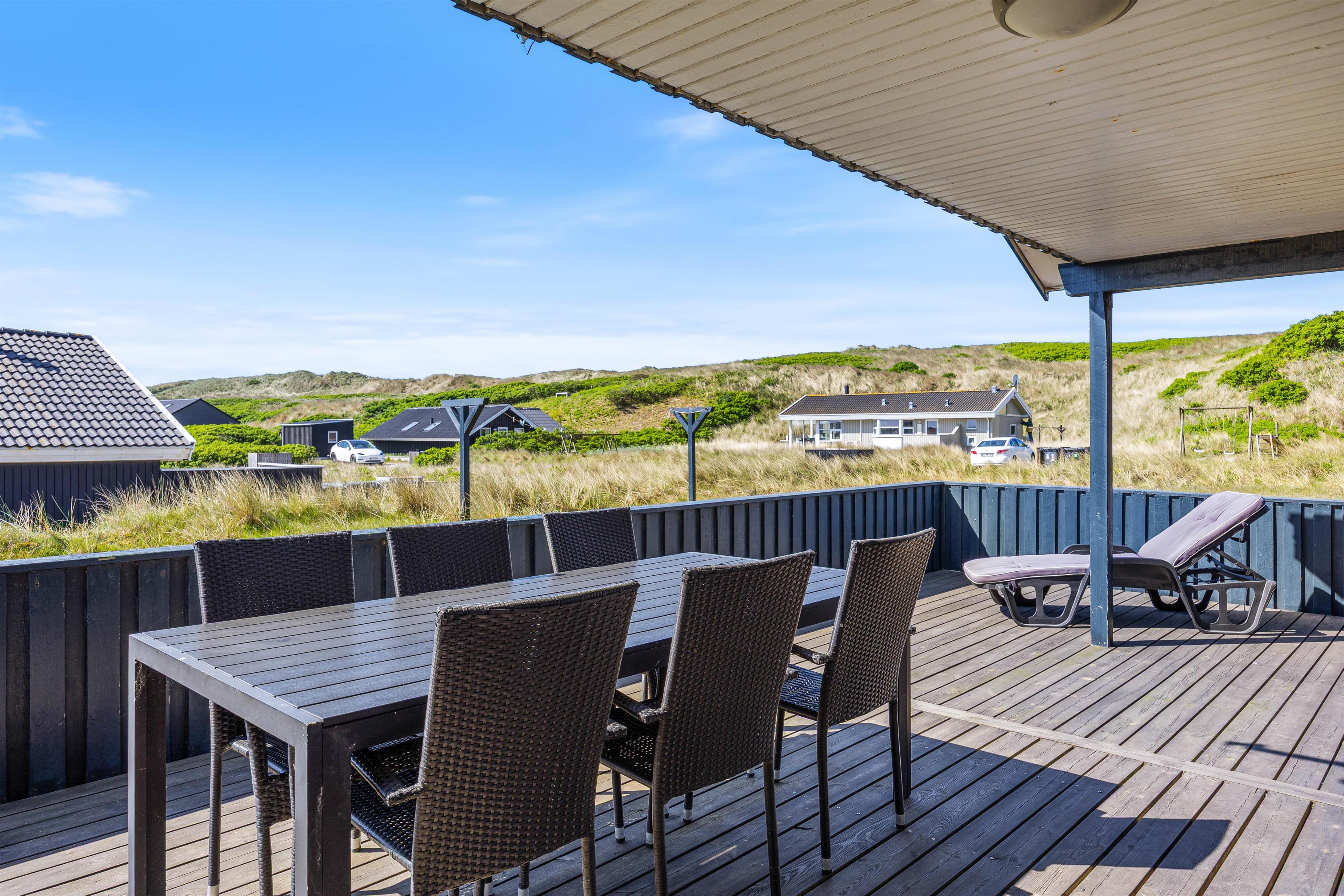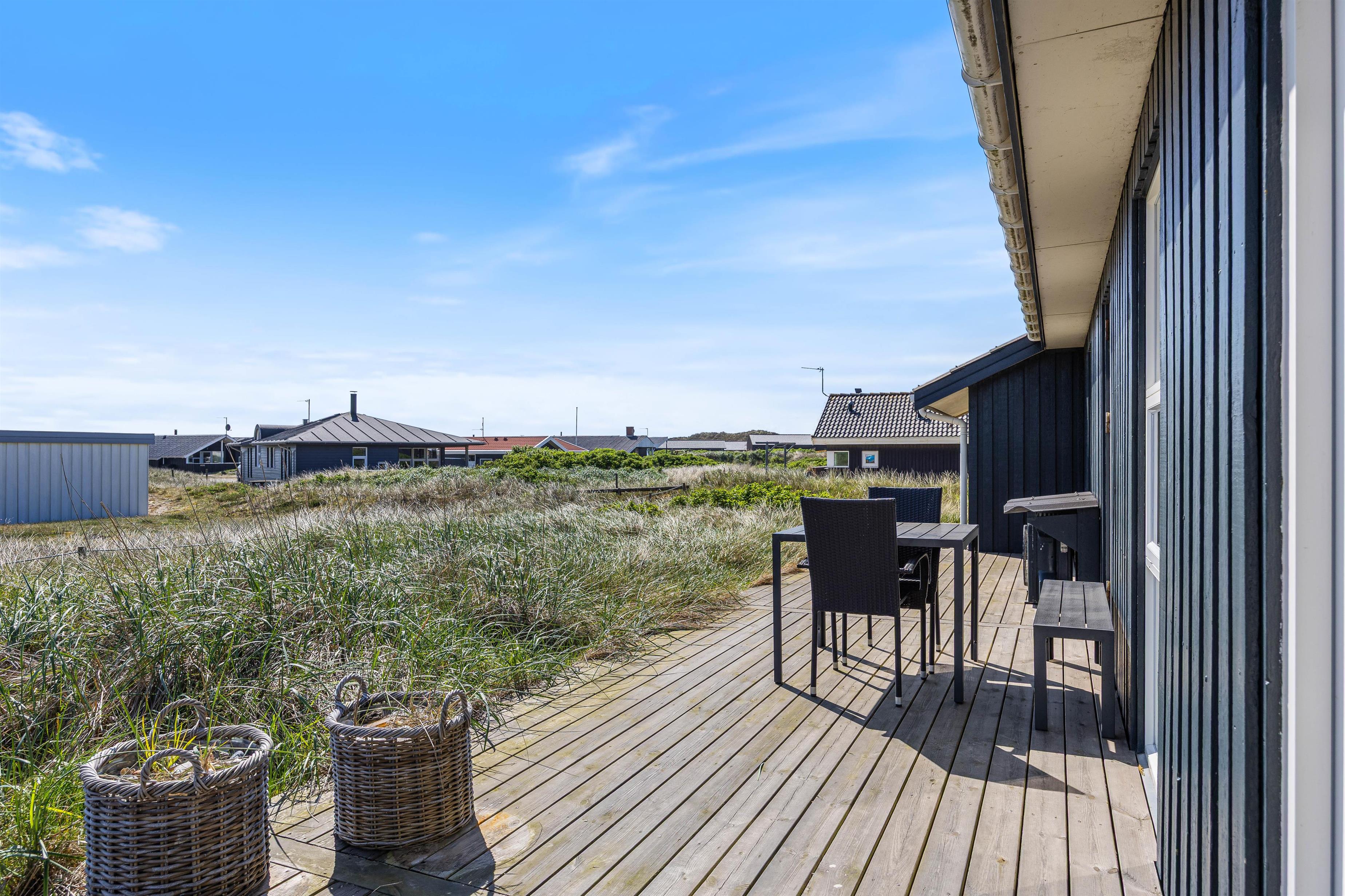 Den rummelige terrasse er delvist overdækket og udstyret med grill, havemøbler og liggestole. Den er helt lukket og derfor ideel til ferier med små børn eller hund. Her er rig mulighed for hyggelige grillaftener, mens solen går ned bag klitterne.