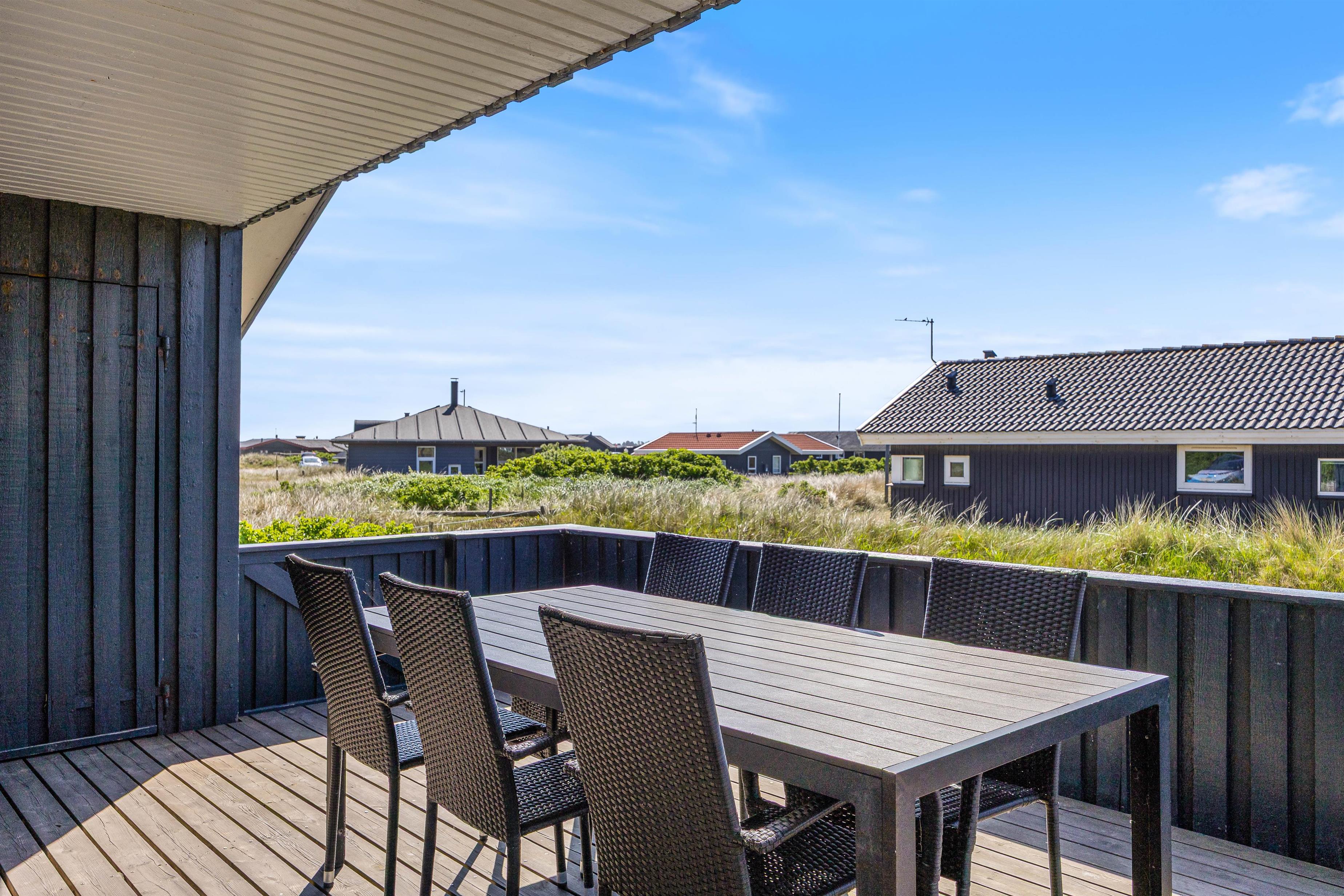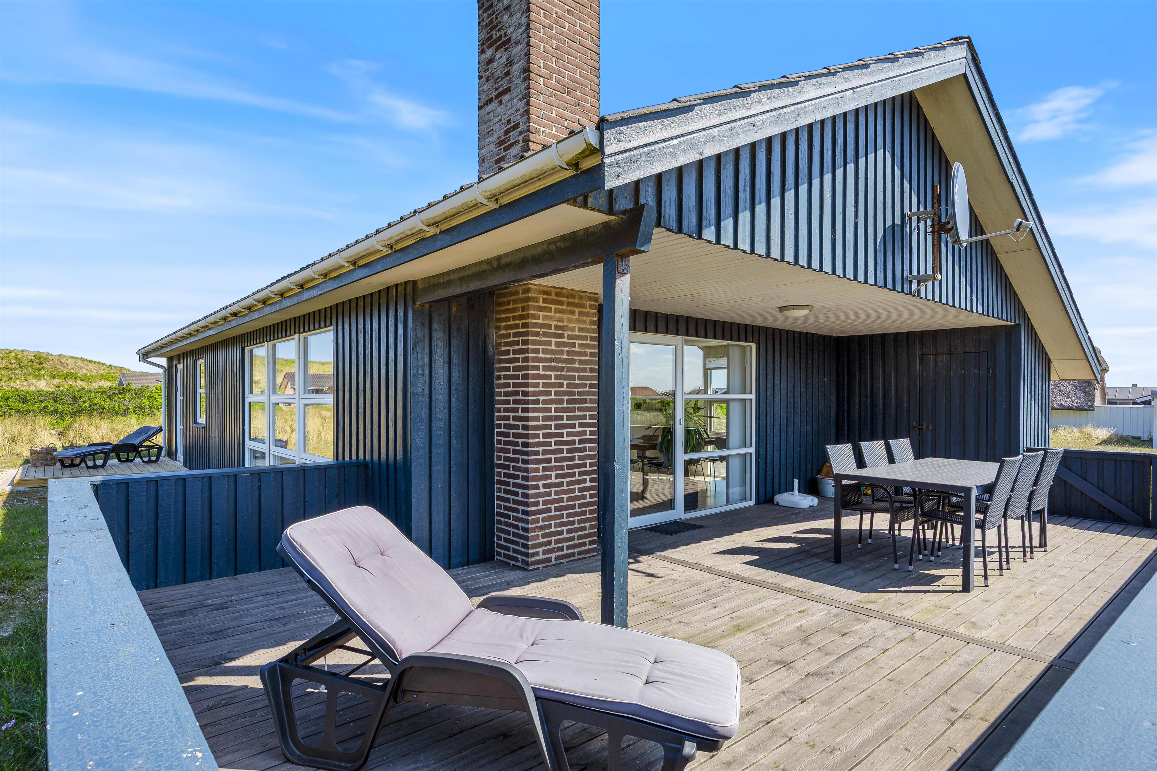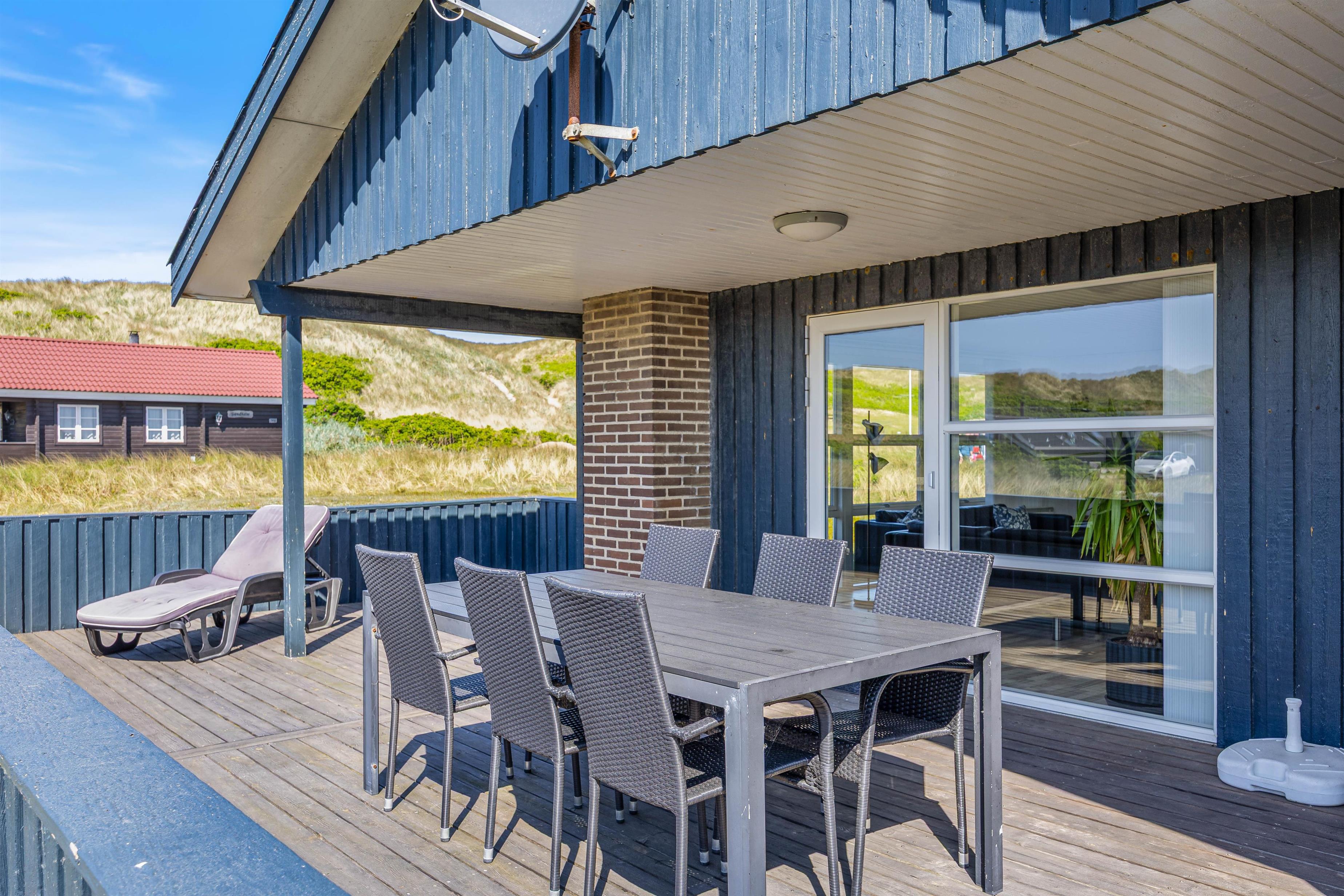 Den rummelige terrasse er delvist overdækket og udstyret med grill, havemøbler og liggestole. Den er helt lukket og derfor ideel til ferier med små børn eller hund. Her er rig mulighed for hyggelige grillaftener, mens solen går ned bag klitterne.