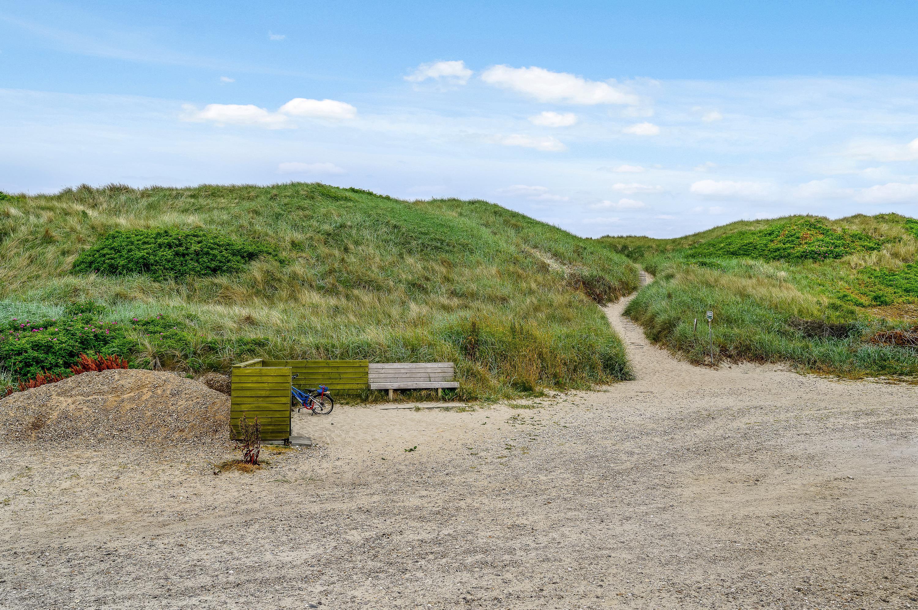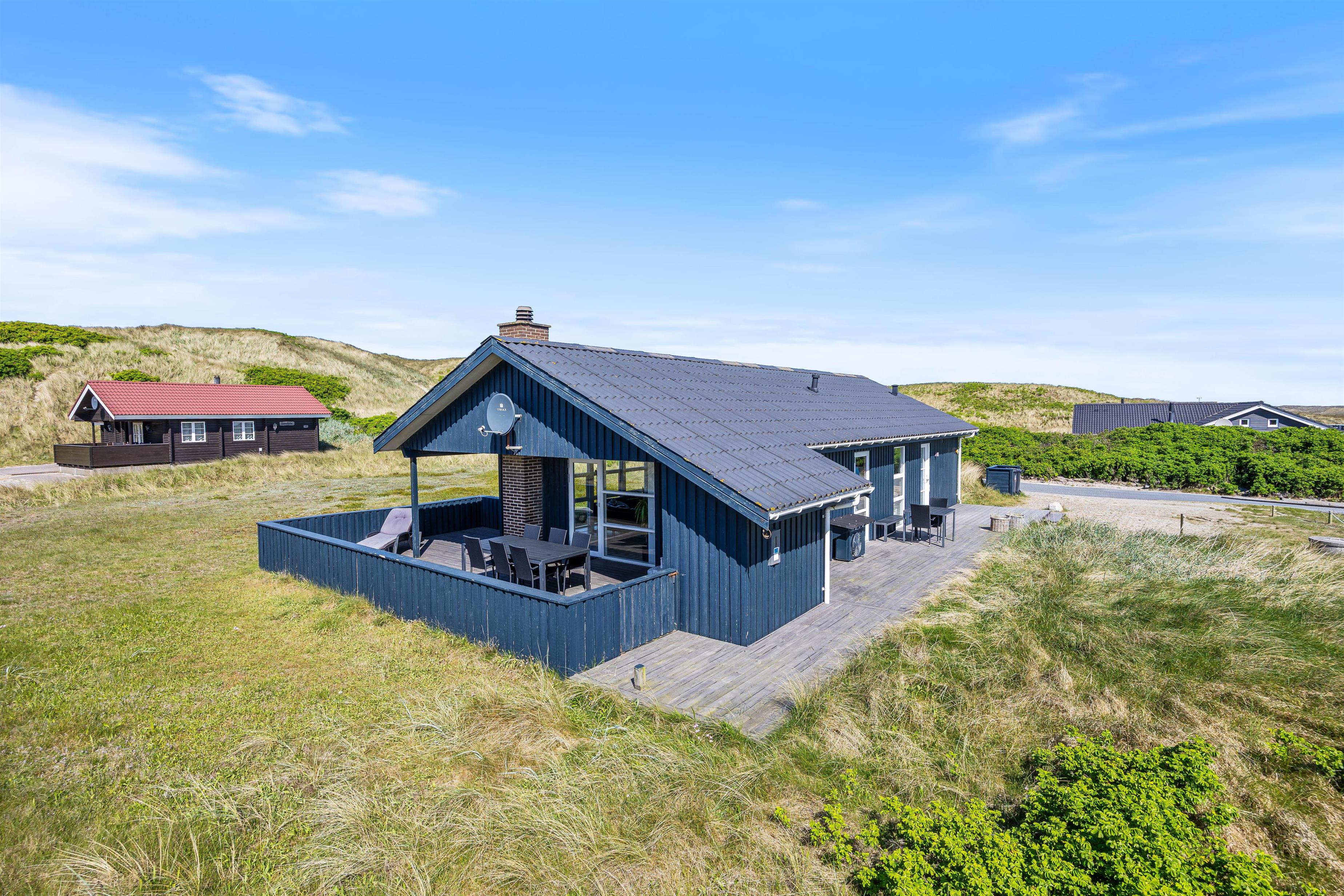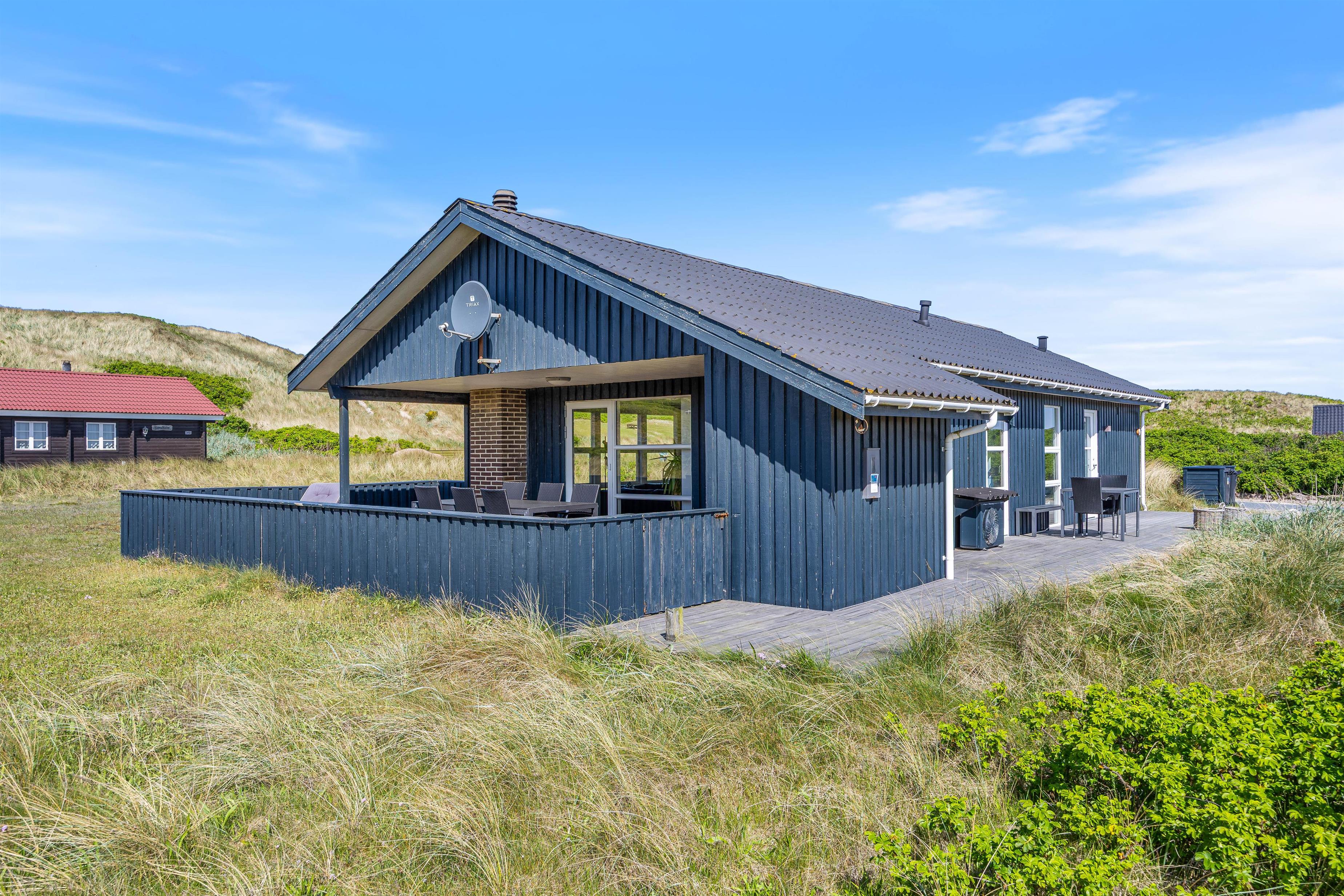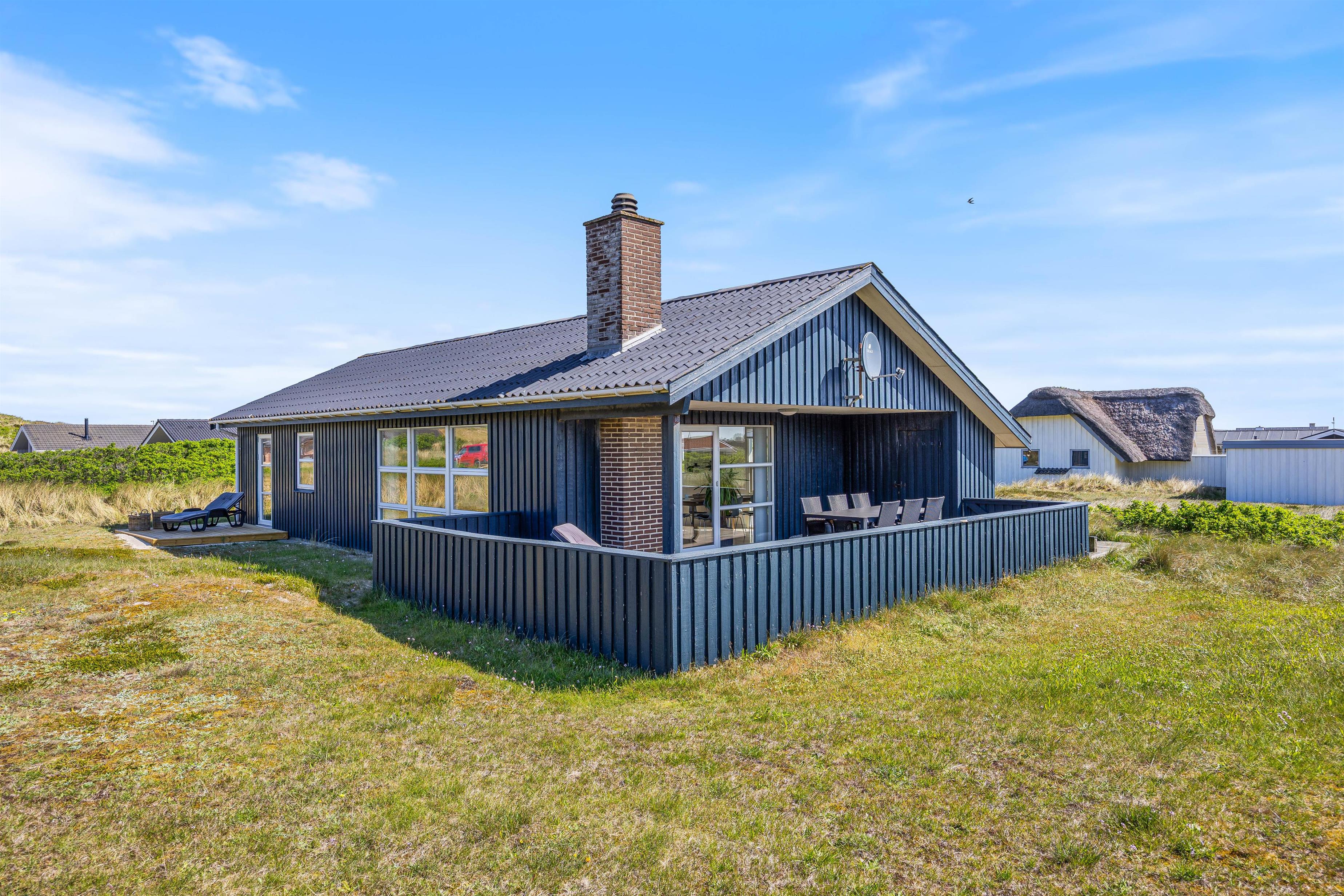 Den rummelige terrasse er delvist overdækket og udstyret med grill, havemøbler og liggestole. Den er helt lukket og derfor ideel til ferier med små børn eller hund. Her er rig mulighed for hyggelige grillaftener, mens solen går ned bag klitterne.