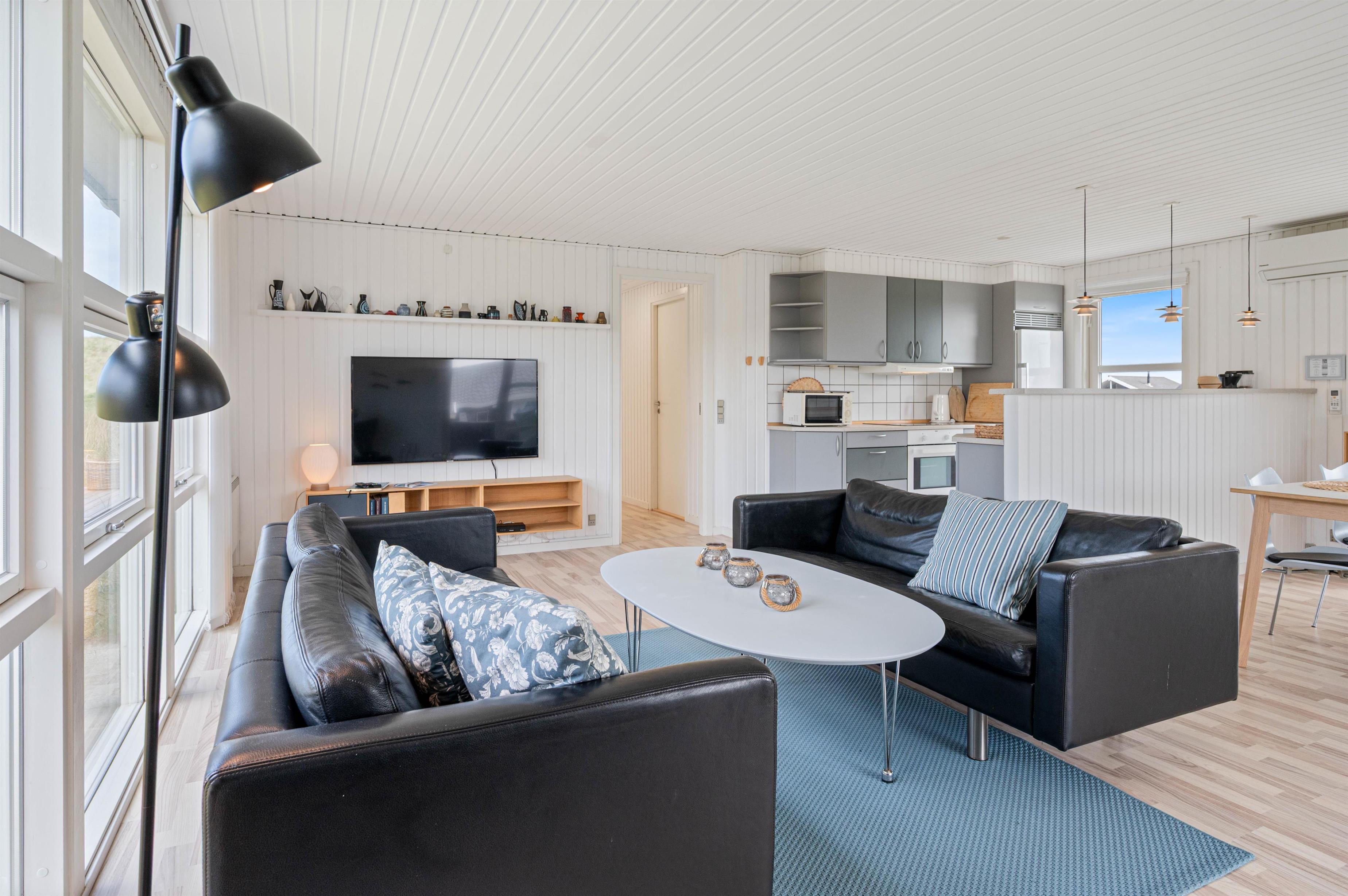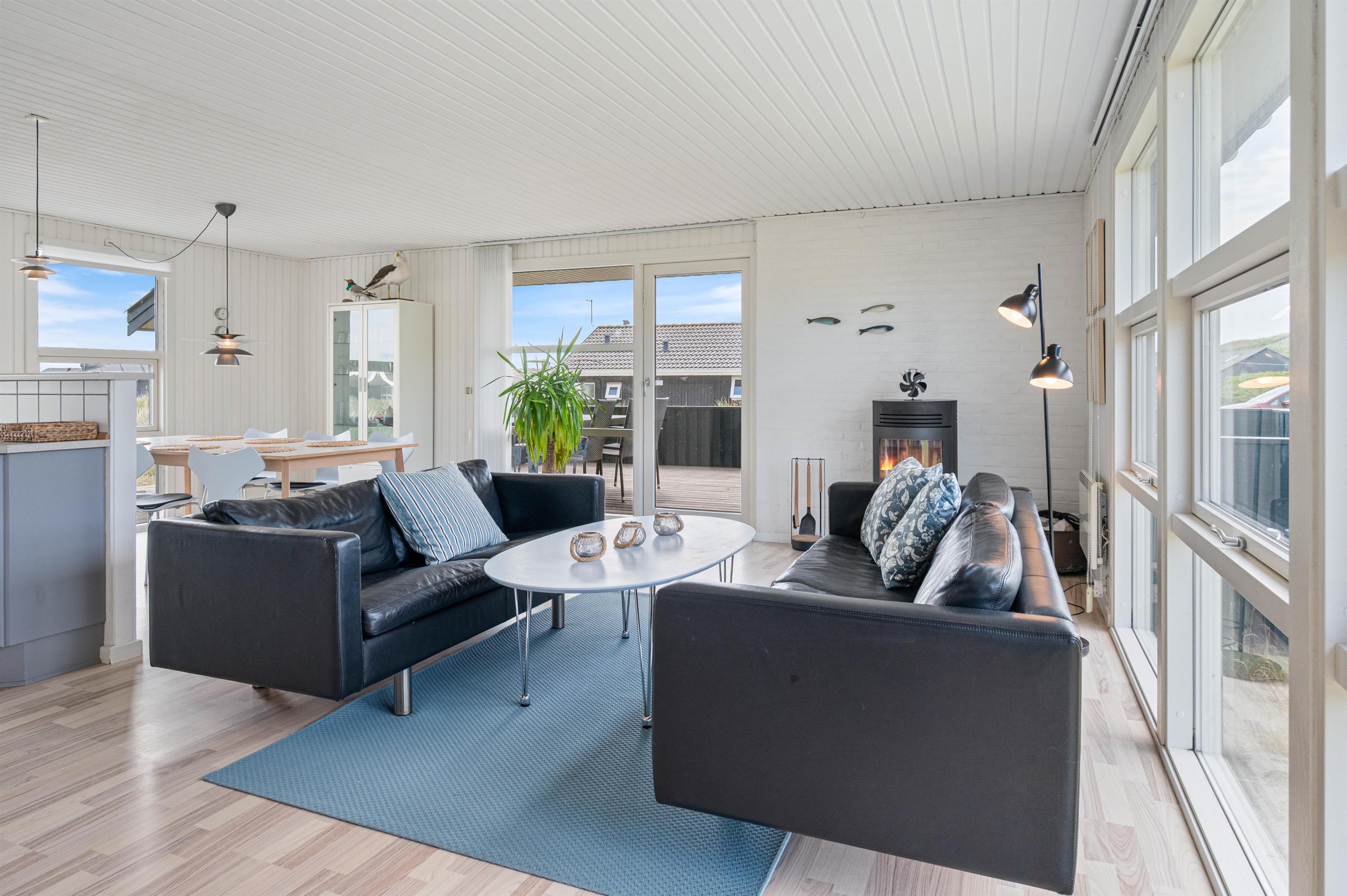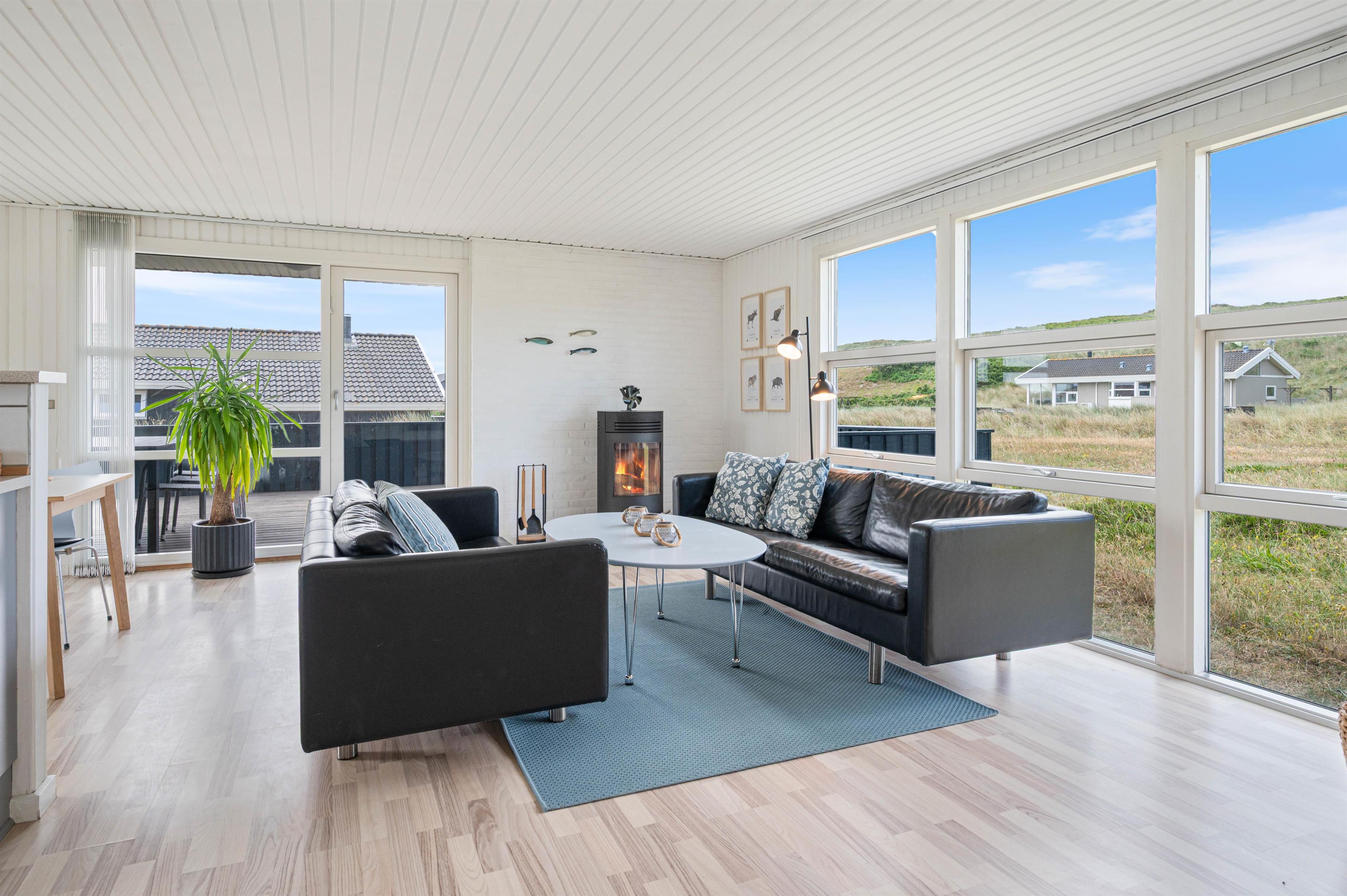 I soveværelse og opholdsstue finder i lyse trælaminater, som sammen med de lyse vægge og lofter giver feriehuset sin rare atmosfære. Stuen er udstyret med smart-tv og brændeovn. Her kan I finde jer rigtig godt tilpas på stormfulde efterårsdage og lade tankerne vandre.