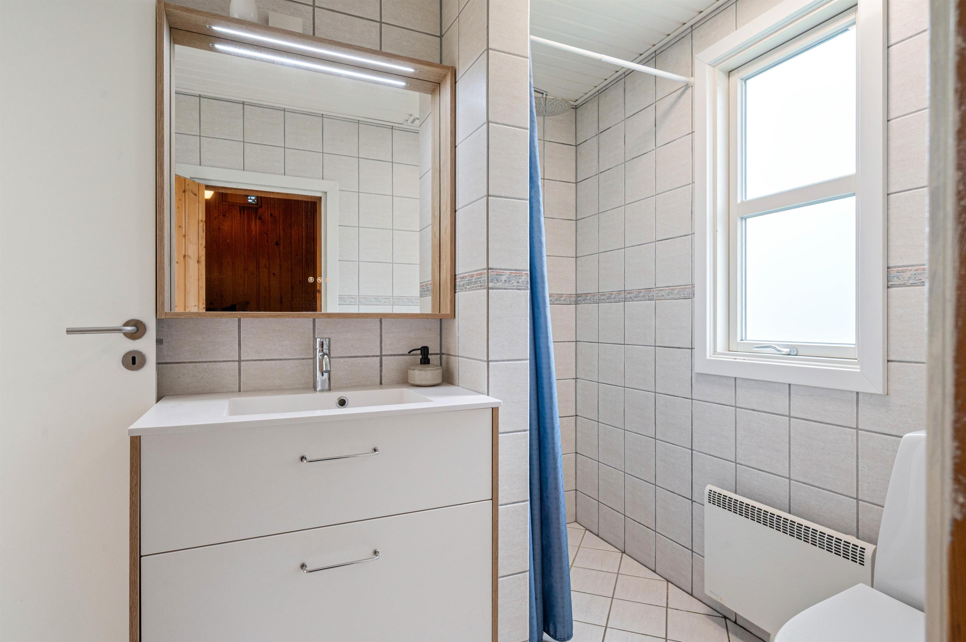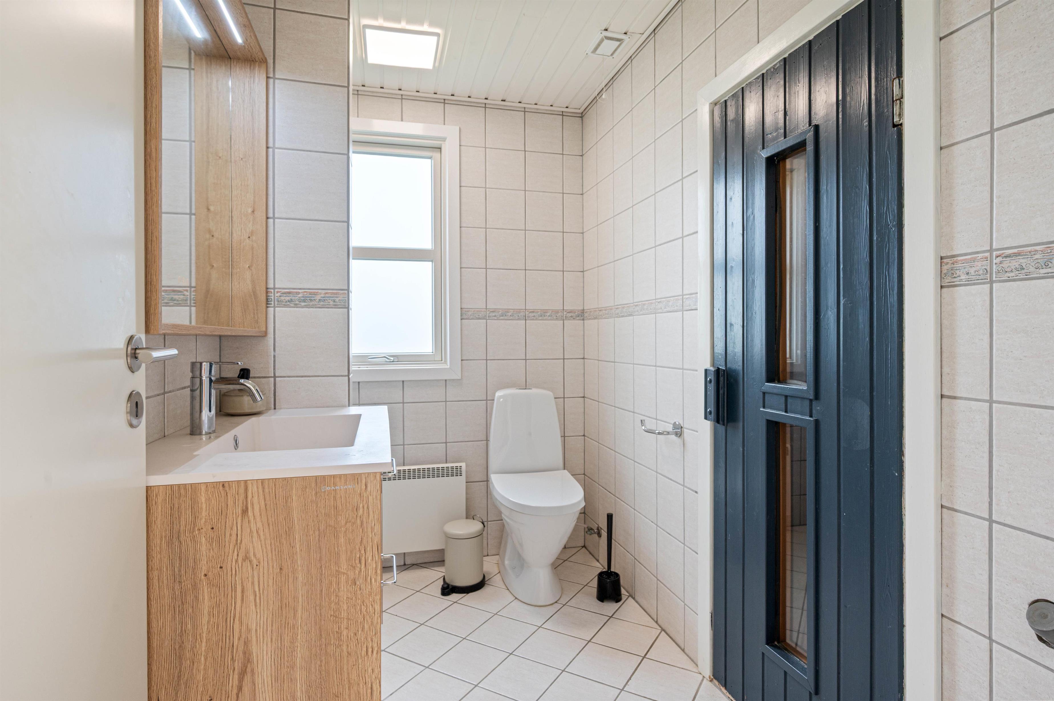 Fra badeværelset har I direkte adgang til saunaen, hvor I kan få varmen og slappe af efter en gåtur ved det stormfulde hav.
