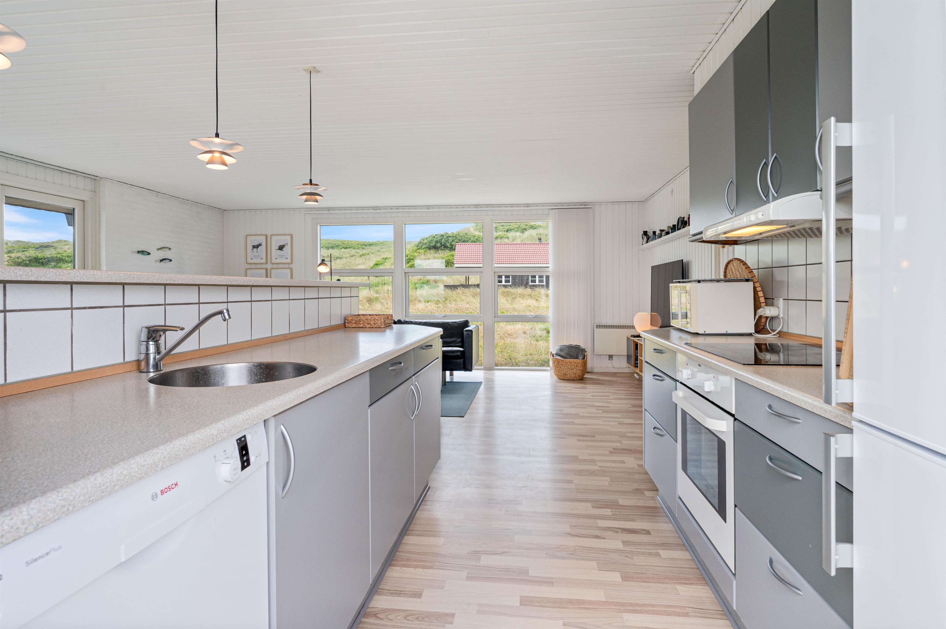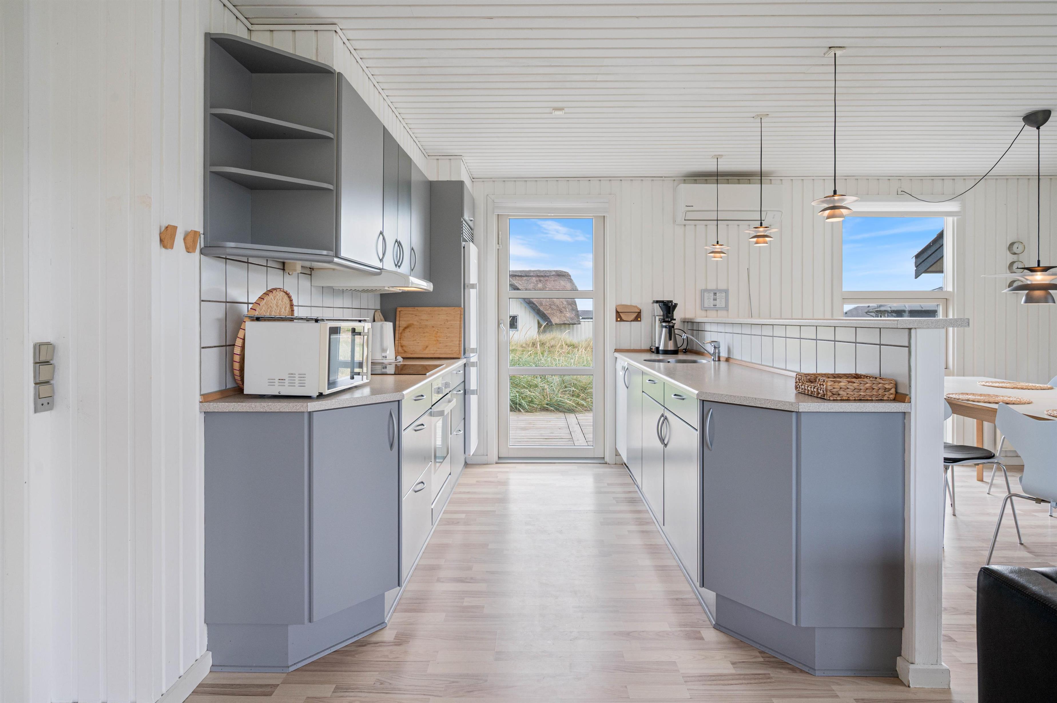Det veludstyrede køkken, som ligger i åben forbindelse med stuen, er udstyret med opvaskemaskine og mikroovn.