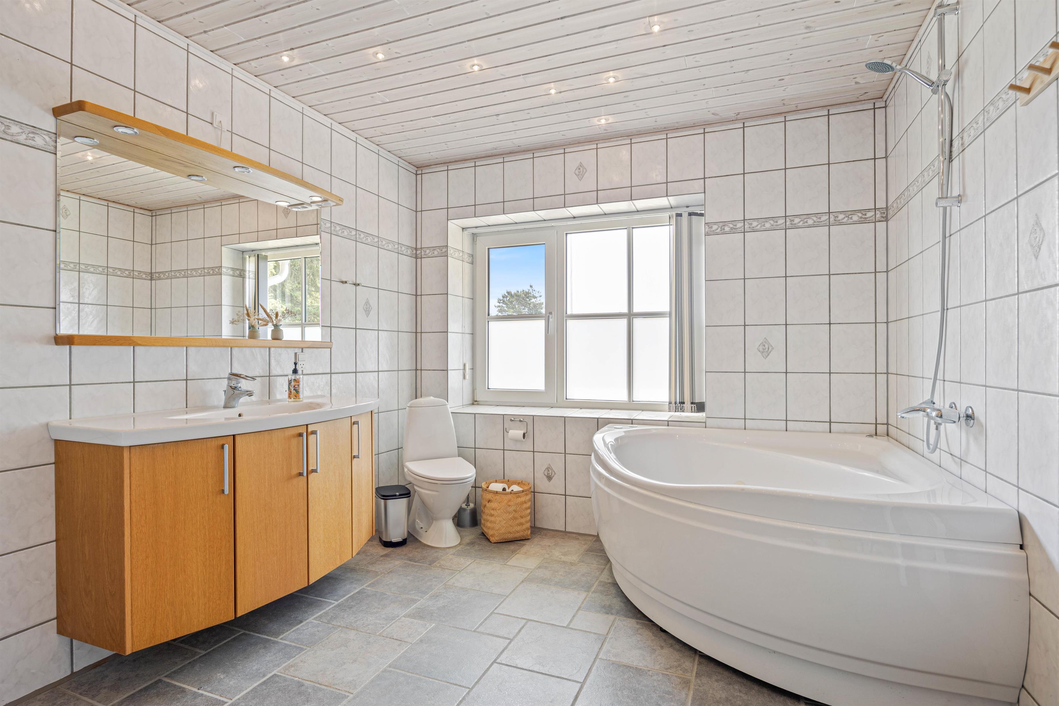 2 badeværelser - hvoraf det ene har gulvvarme - og et separat gæstetoilet giver yderligere komfort til sommerhuset. Der er også et bryggers med vaskemaskine og tørretumbler. Aktivitetsrummet byder på underholdning uanset vejret og indbyder til fælles leg.