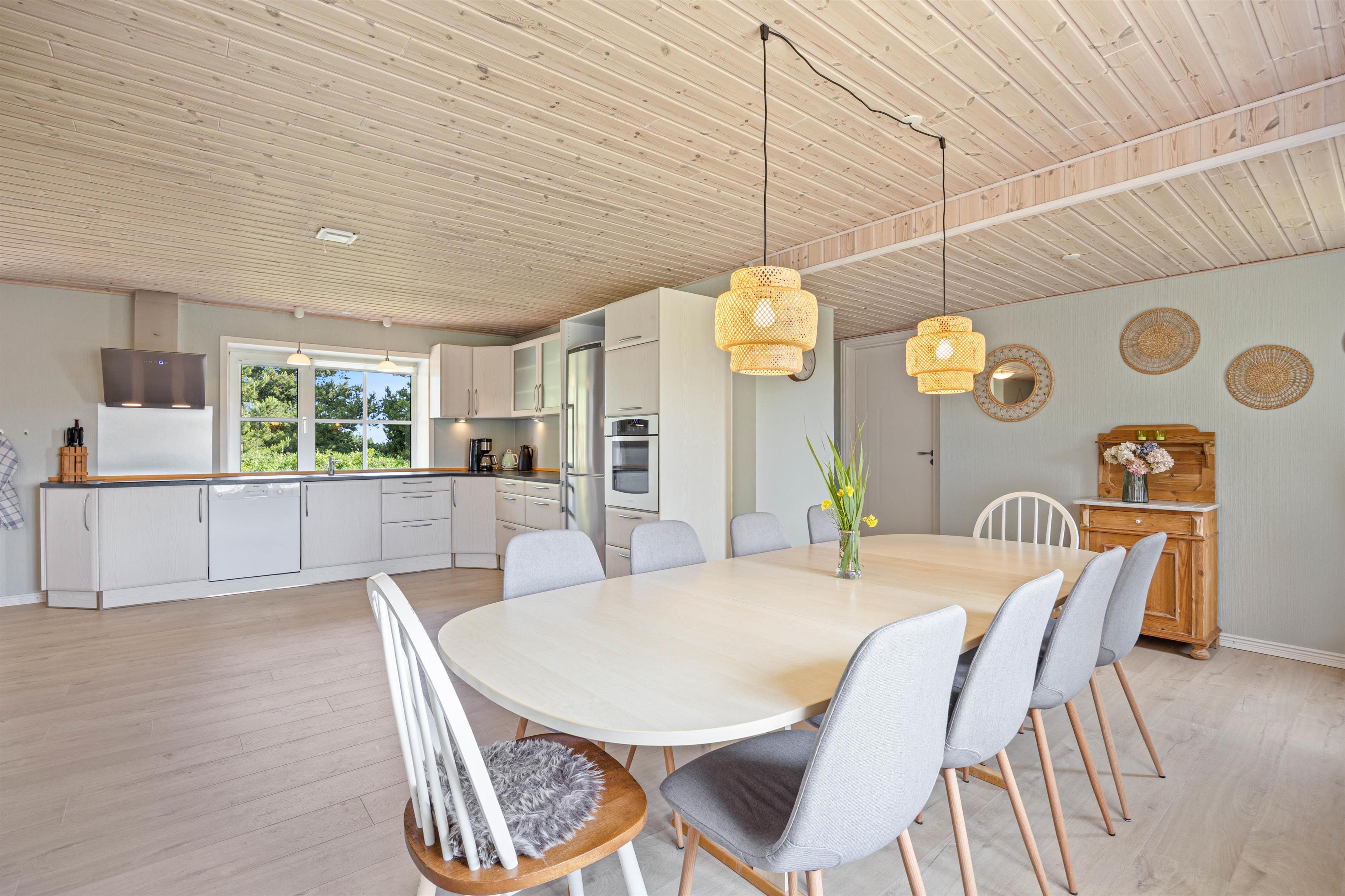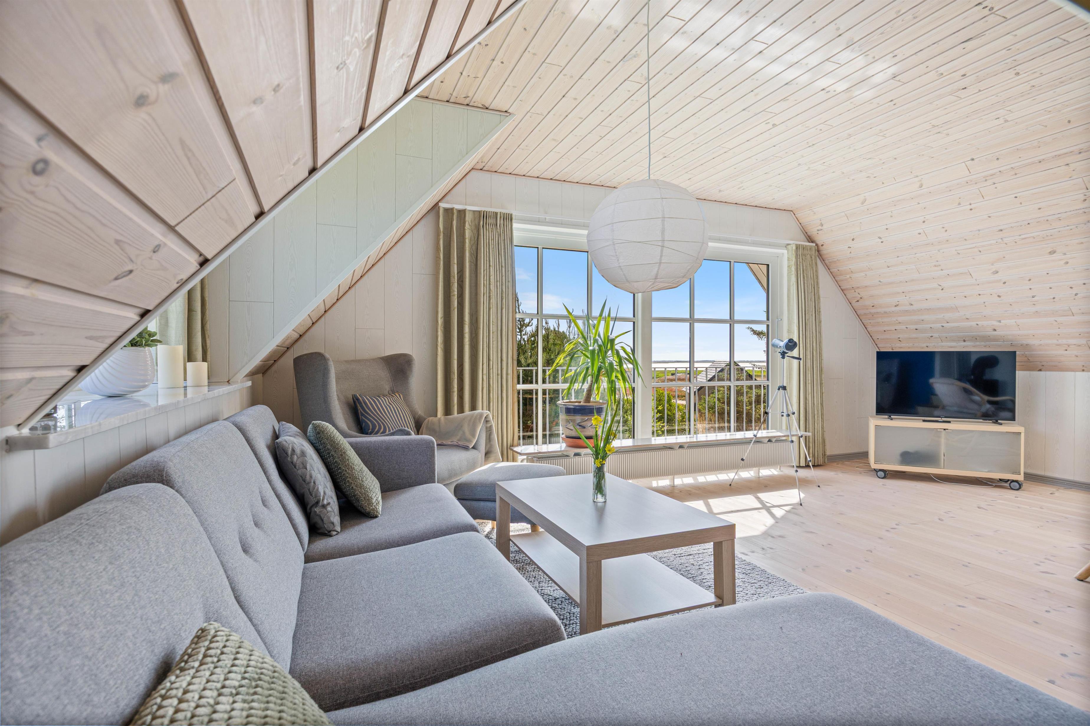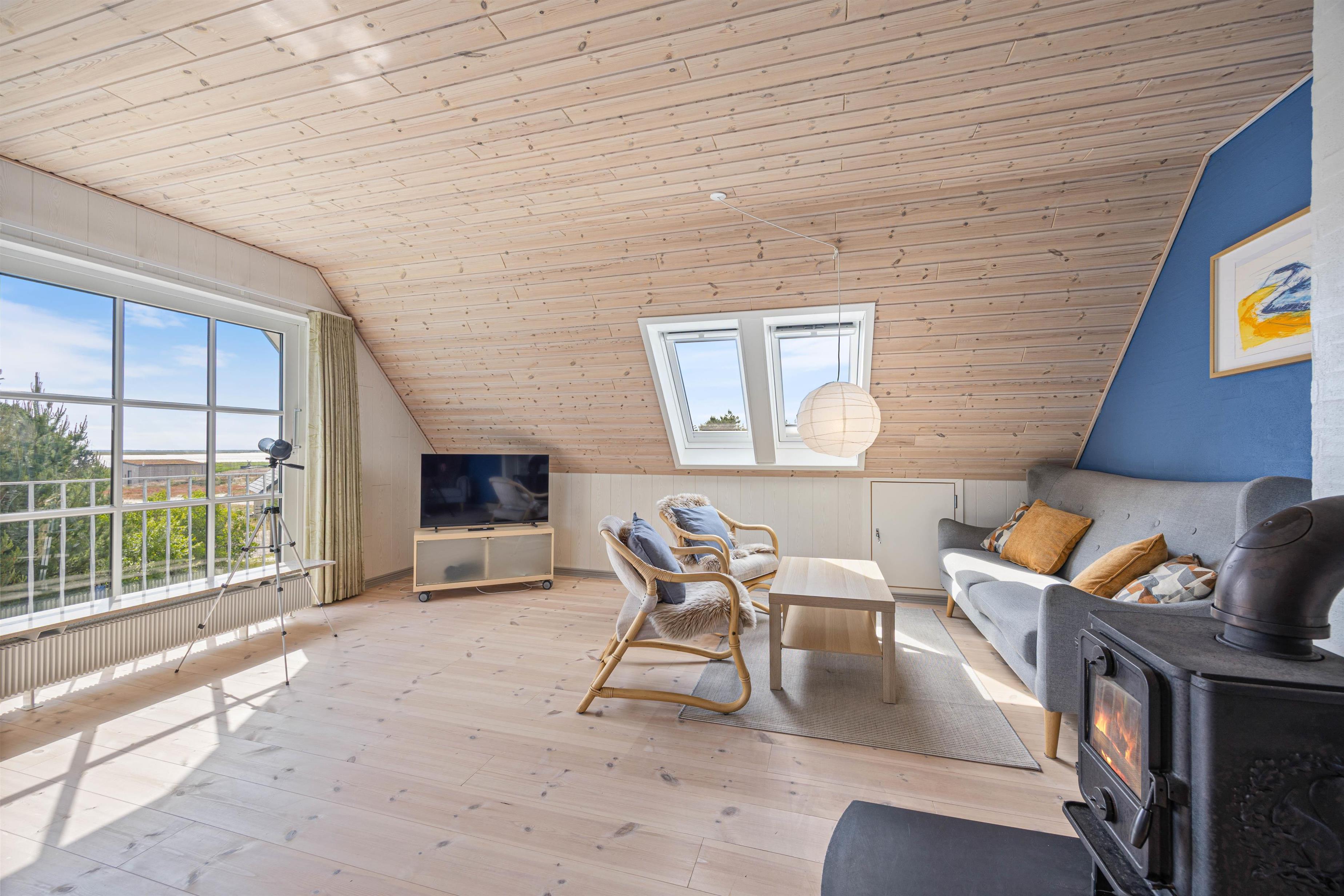 Feriehusets hjerte er et rummeligt og lyst opholdsrum på 1. sal med store vinduer, der lukker masser af naturligt lys ind og skaber en venlig, åben atmosfære. Især på kølige dage giver brændeovnen en hyggelig varme og indbyder til hyggelige aftener ved de knitrende flammer - et sted, hvor alle elsker at samles.