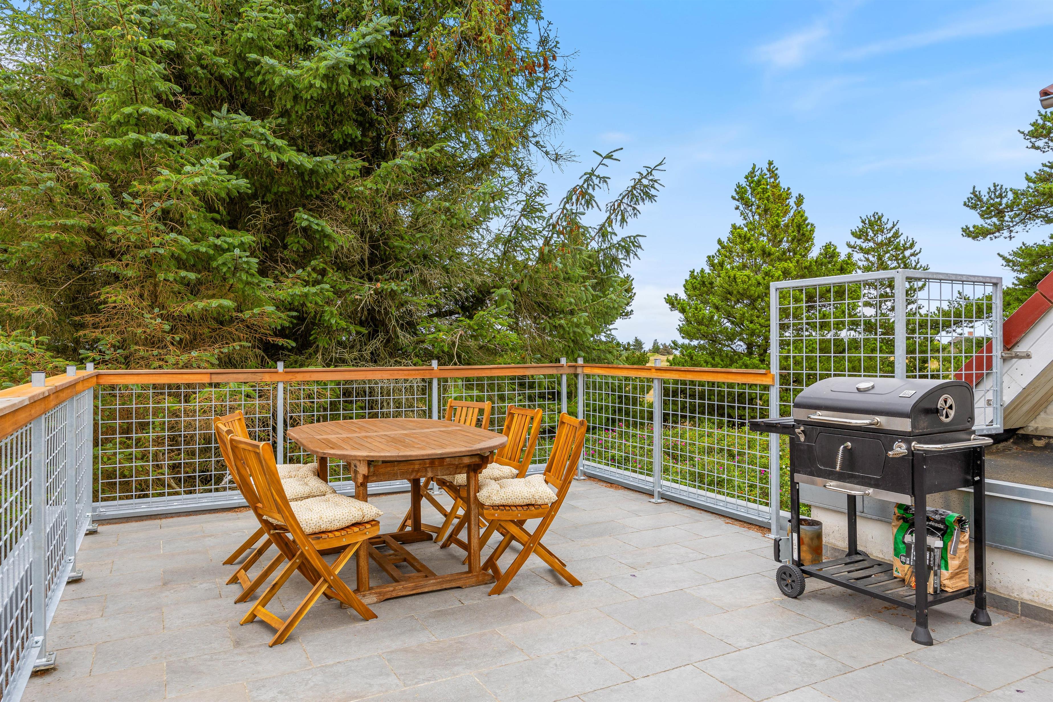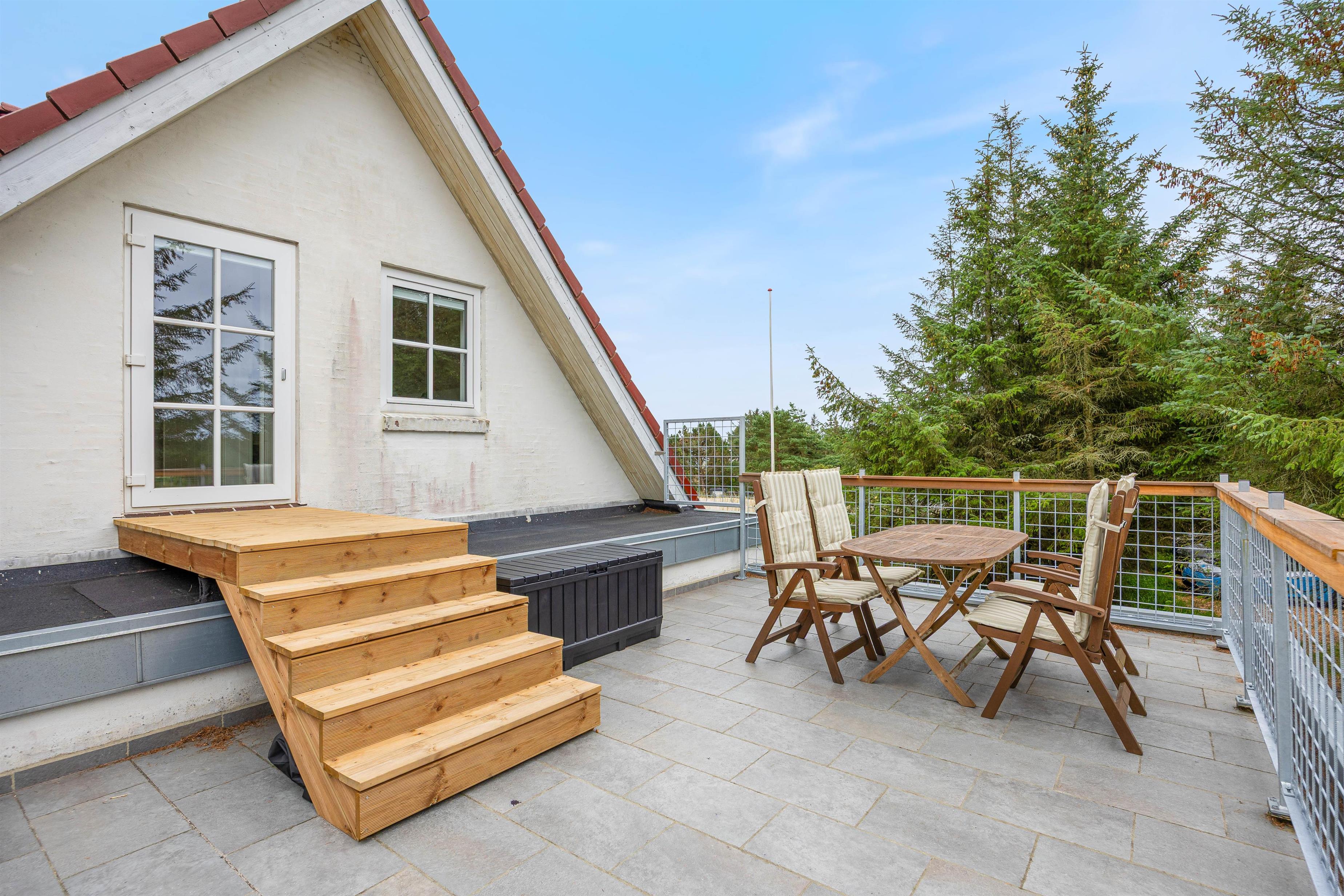 På førstesalen i jeres feriehus har I adgang til en lukket terrasse – perfekt til at nyde solrige dage i læ og lade blikket vandre ud over omgivelserne. Uanset om I starter dagen med morgenmad i solen eller slapper af med en god bog, er dette det ideelle sted at koble helt fra.