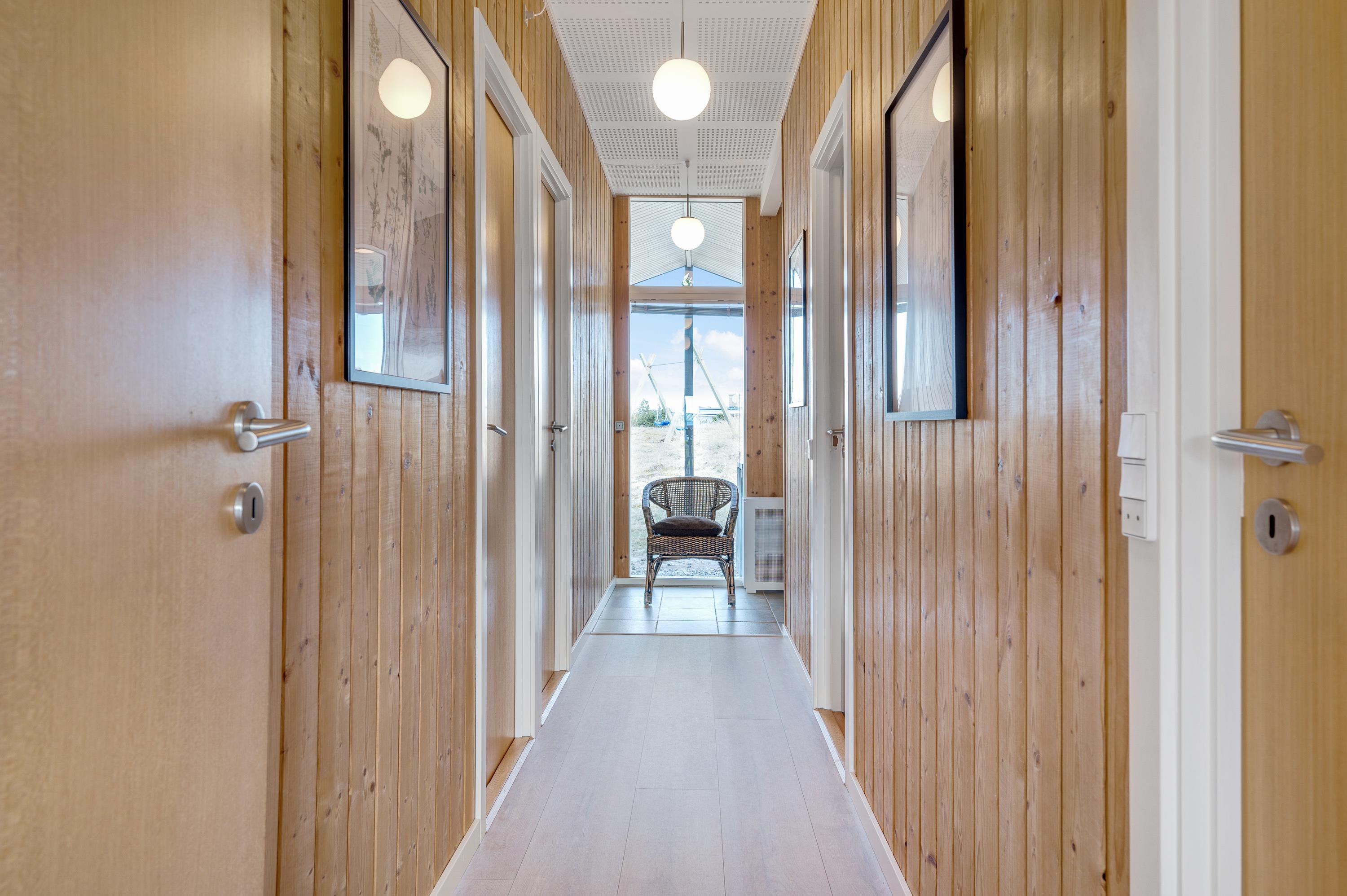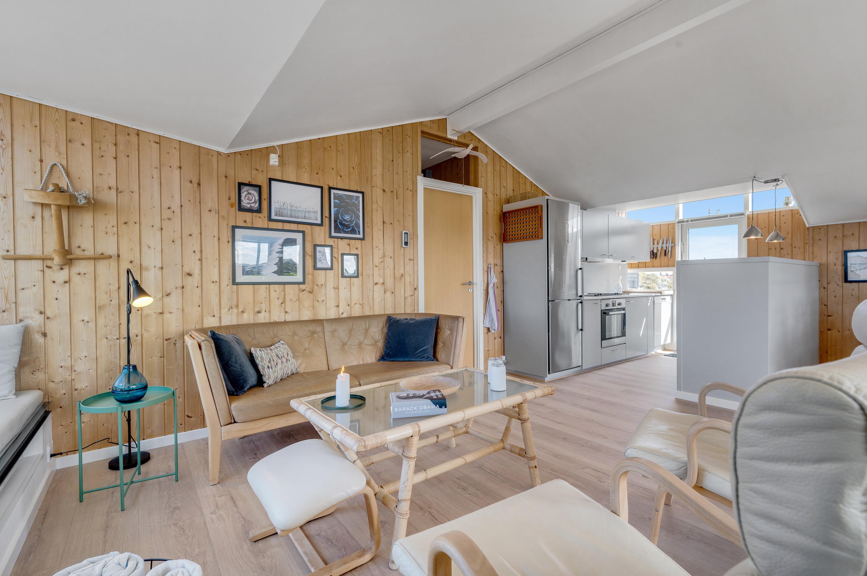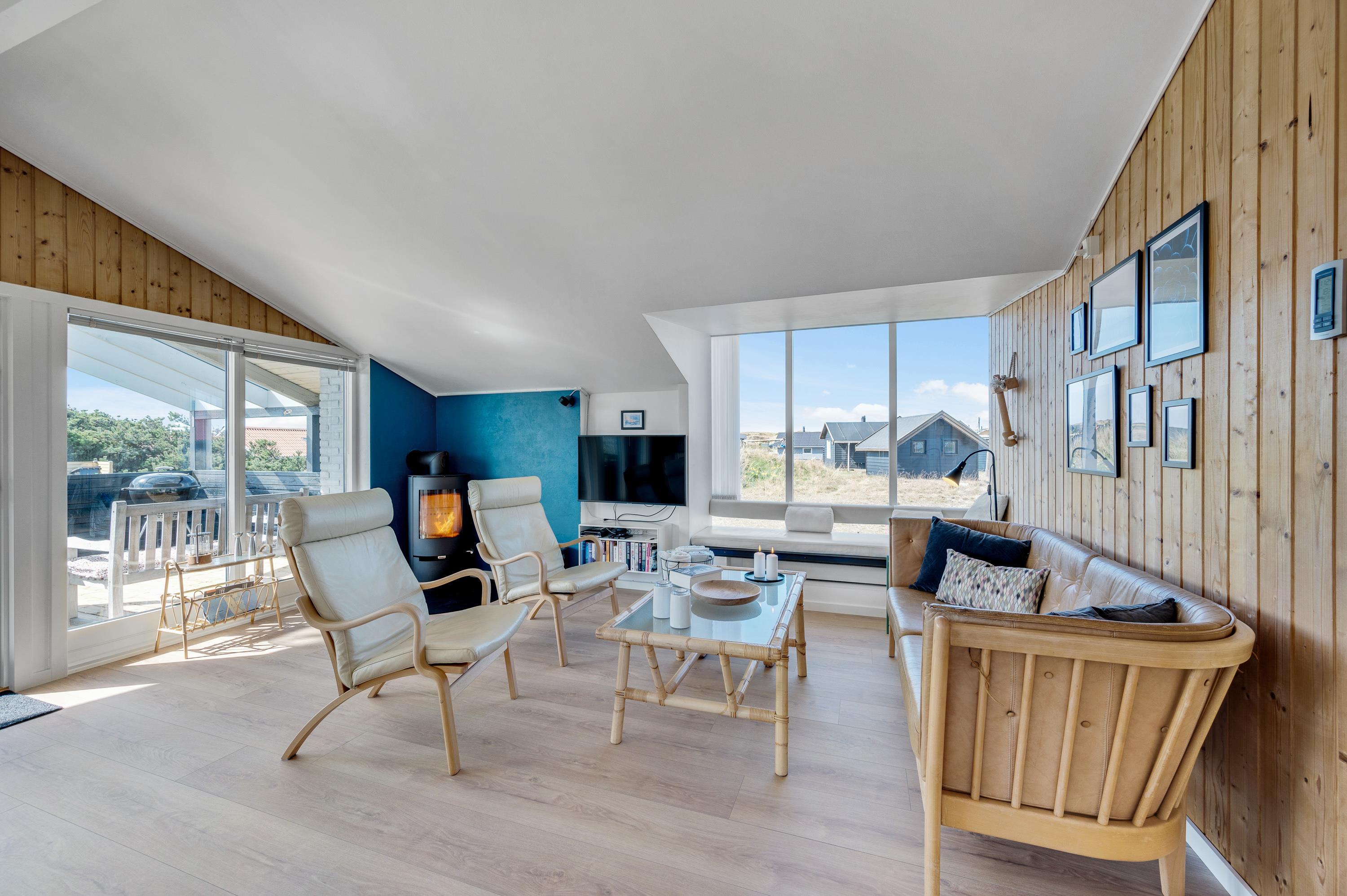 Indretningen i feriehuset er lys og imødekommende med en god blanding af funktionalitet og komfort. Den rummelige stue har et stort vinduesparti, der både lukker masser af dagslys ind og giver jer en smuk udsigt over naturgrunden og det fredelige sommerhusområde. Her kan I slappe af i sofaen med en god bog eller en film, mens brændeovnen knitrer og skaber varme og hygge på de køligere dage.